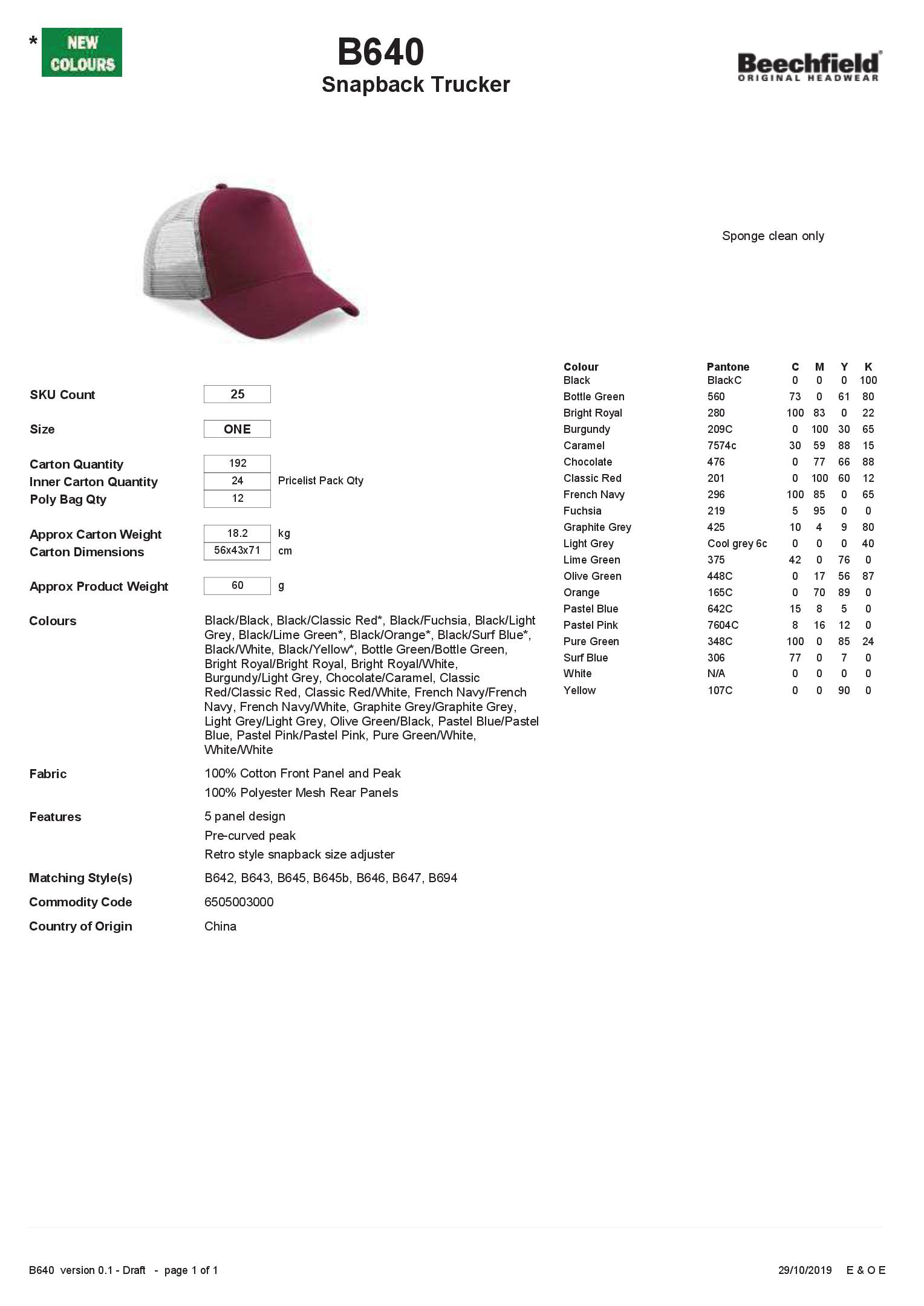 Panneau frontal et visière 100% coton. Panneaux arrière en maille filet 100% polyester. 5 panneaux. Visière préformée. Ajustable par languette de réglage rétro Snapback.