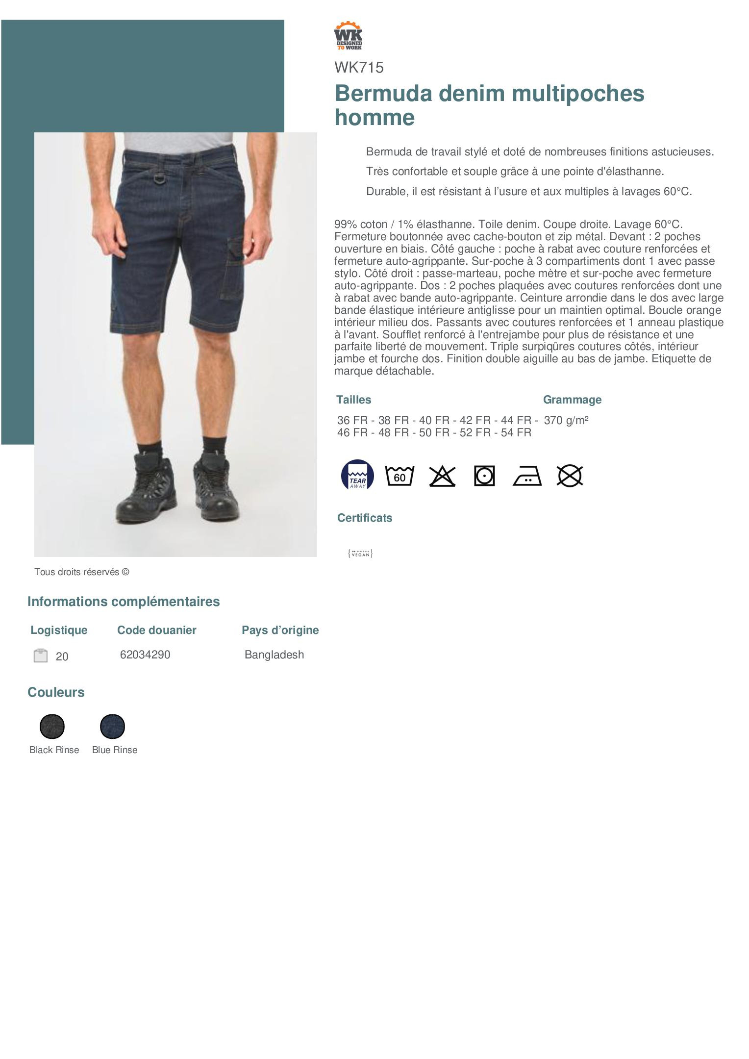 99% coton / 1% élasthanne. Toile denim. Coupe droite. Lavage 60°C. Fermeture boutonnée avec cache-bouton et zip métal. Devant : 2 poches ouverture en biais. Côté gauche : poche à rabat avec couture renforcées et fermeture auto-agrippante. Sur-poche à 3 compartiments dont 1 avec passe stylo. Côté droit : passe-marteau, poche mètre et sur-poche avec fermeture auto-agrippante. Dos : 2 poches plaquées avec coutures renforcées dont une à rabat avec bande auto-agrippante. Ceinture arrondie dans le dos avec large bande élastique intérieure antiglisse pour un maintien optimal. Boucle orange intérieur milieu dos. Passants avec coutures renforcées et 1 anneau plastique à l'avant. Soufflet renforcé à l'entrejambe pour plus de résistance et une parfaite liberté de mouvement. Triple surpiqûres coutures côtés, intérieur jambe et fourche dos. Finition double aiguille au bas de jambe. Etiquette de marque détachable.