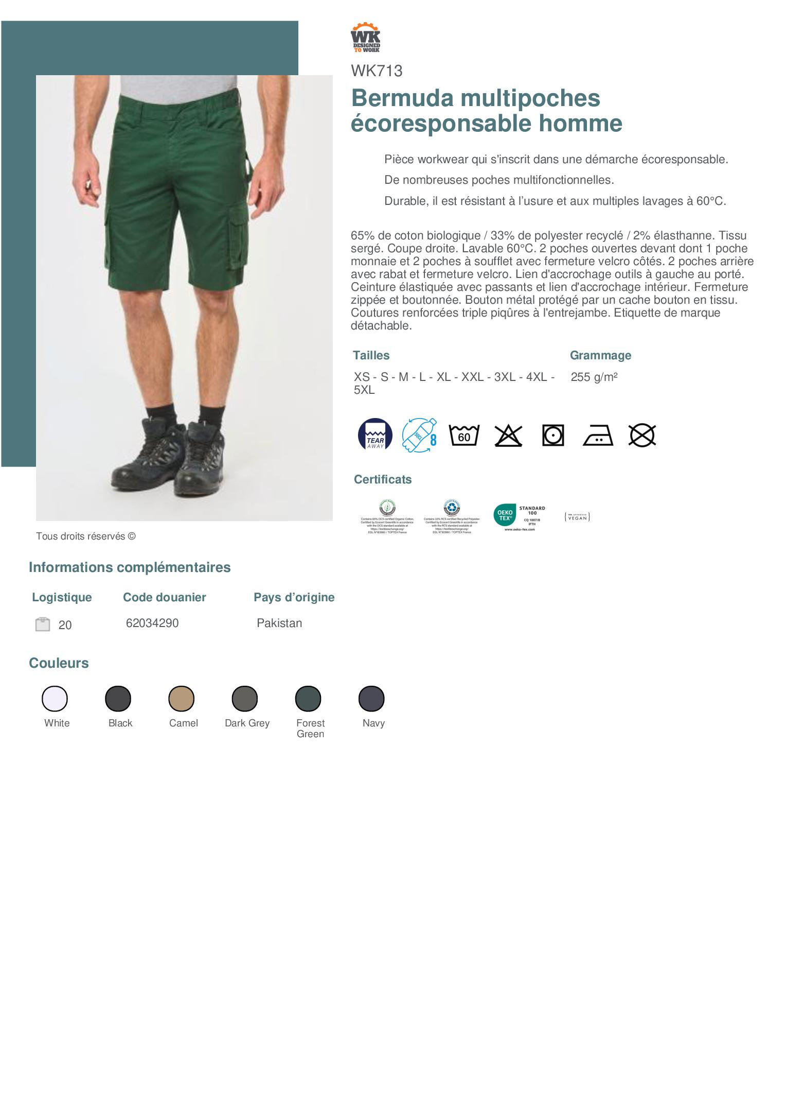 65% de coton biologique / 33% de polyester recyclé / 2% élasthanne. Tissu sergé. Coupe droite. Lavable 60°C. 2 poches ouvertes devant dont 1 poche monnaie et 2 poches à soufflet avec fermeture velcro côtés. 2 poches arrière avec rabat et fermeture velcro. Lien d'accrochage outils à gauche au porté. Ceinture élastiquée avec passants et lien d'accrochage intérieur. Fermeture zippée et boutonnée. Bouton métal protégé par un cache bouton en tissu. Coutures renforcées triple piqûres à l'entrejambe. Etiquette de marque détachable.
