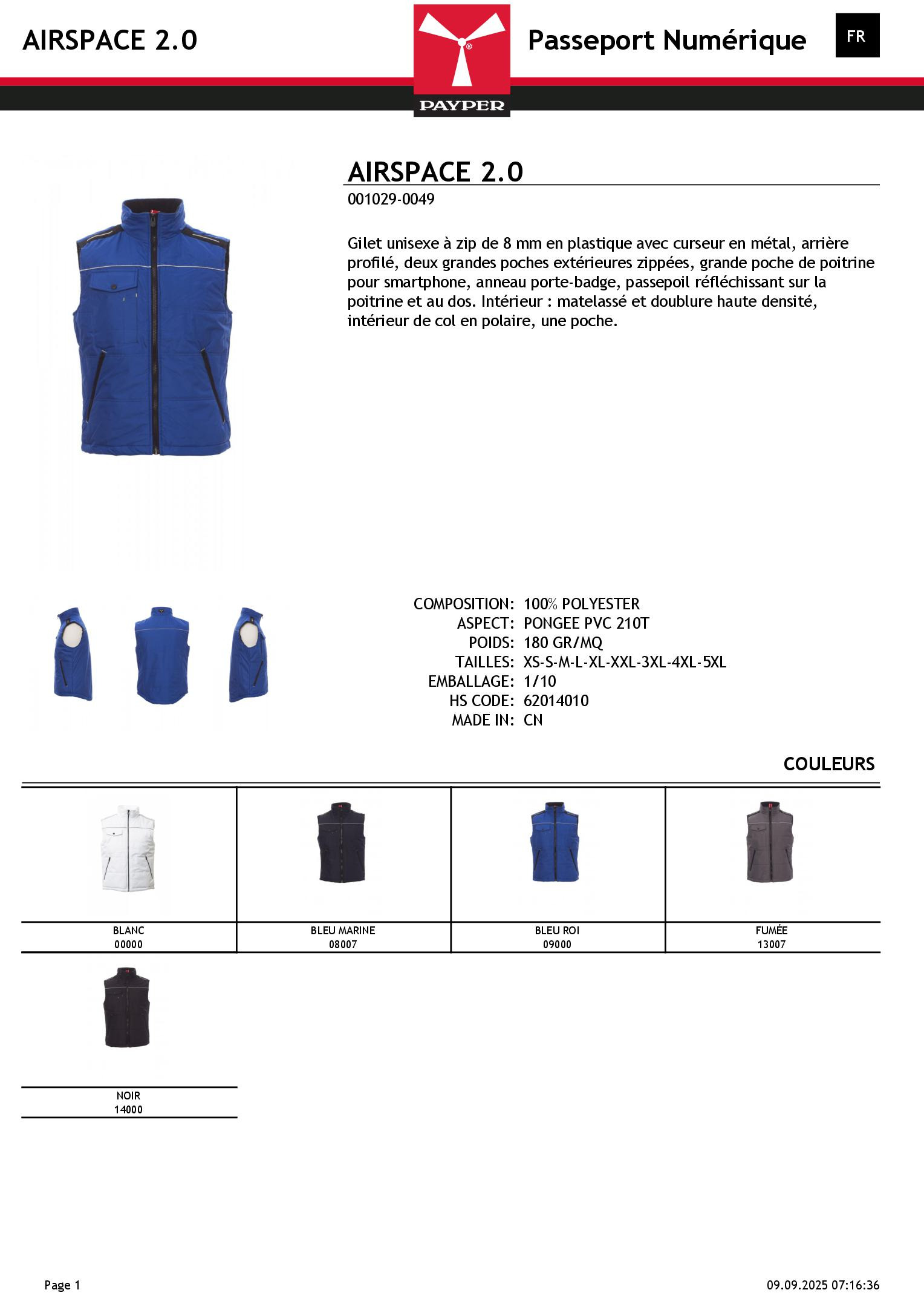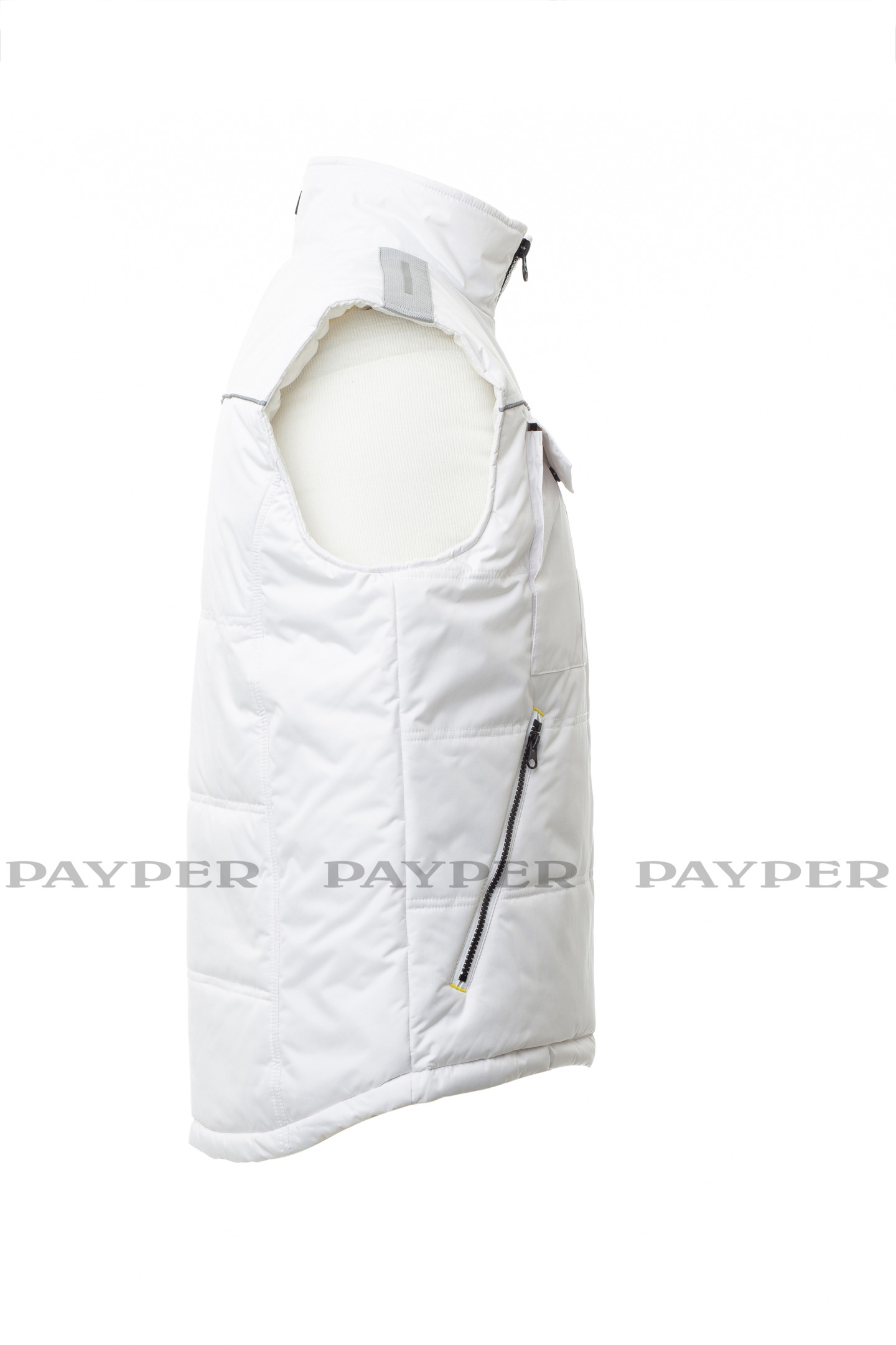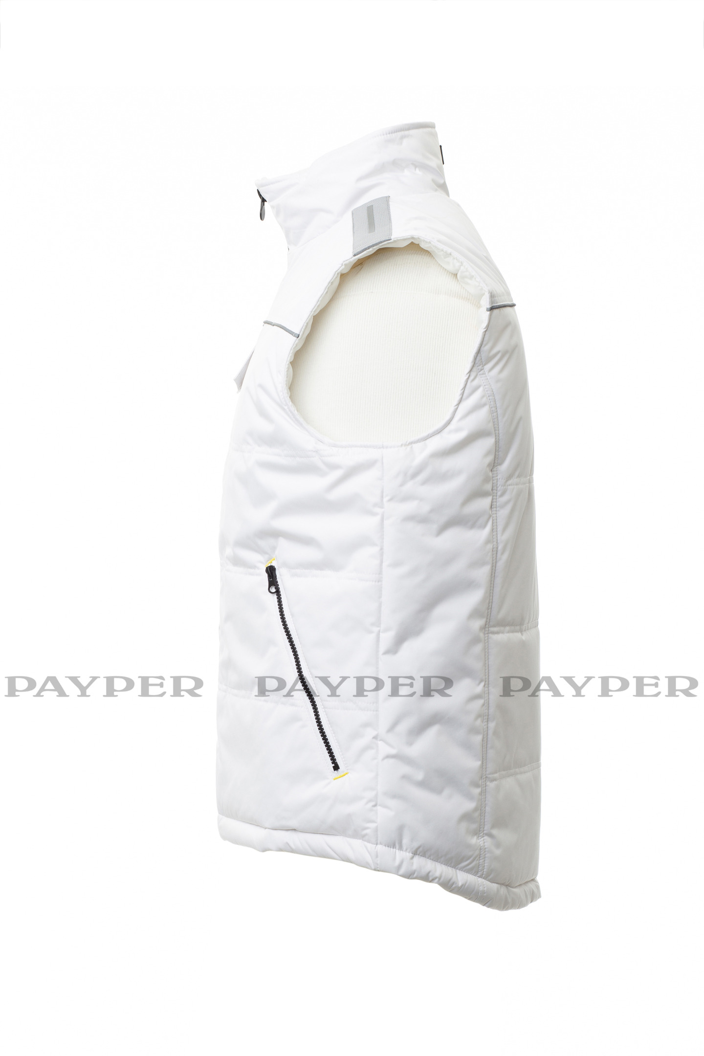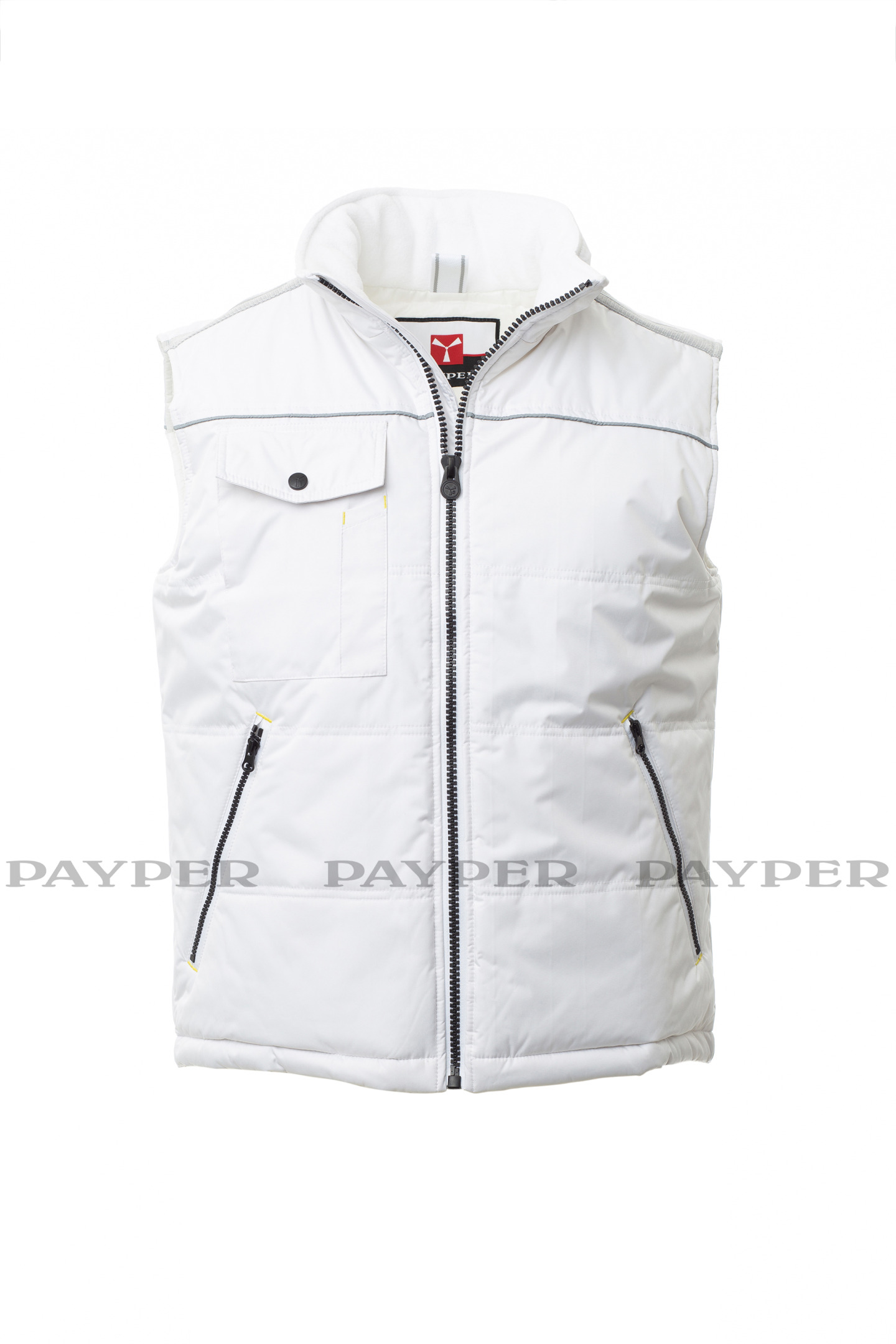 Gilet unisexe à zip de 8 mm en plastique avec curseur en métal, arrière profilé, deux grandes poches extérieures zippées, grande poche de poitrine pour smartphone, anneau porte-badge, passepoil réfléchissant sur la poitrine et au dos. Intérieur : matelassé et doublure haute densité, intérieur de col en polaire, une poche.