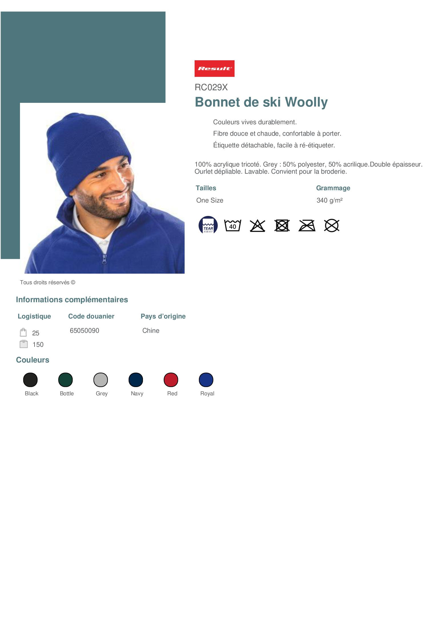 100% acrylique tricoté. Grey : 50% polyester, 50% acrilique.Double épaisseur. Ourlet dépliable. Lavable. Convient pour la broderie.