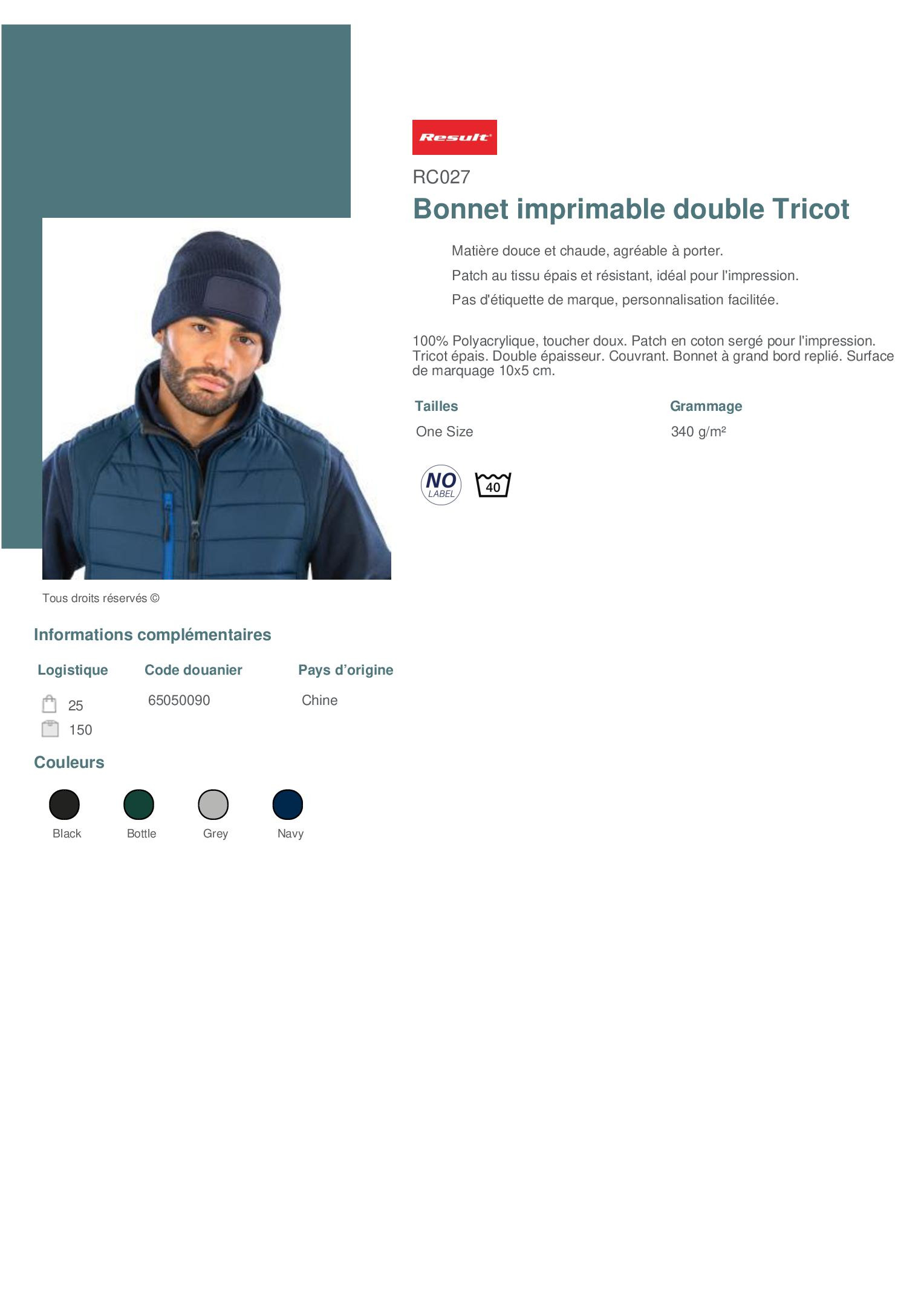 100% Polyacrylique, toucher doux. Patch en coton sergé pour l'impression. Tricot épais. Double épaisseur. Couvrant. Bonnet à grand bord replié. Surface de marquage 10x5 cm.