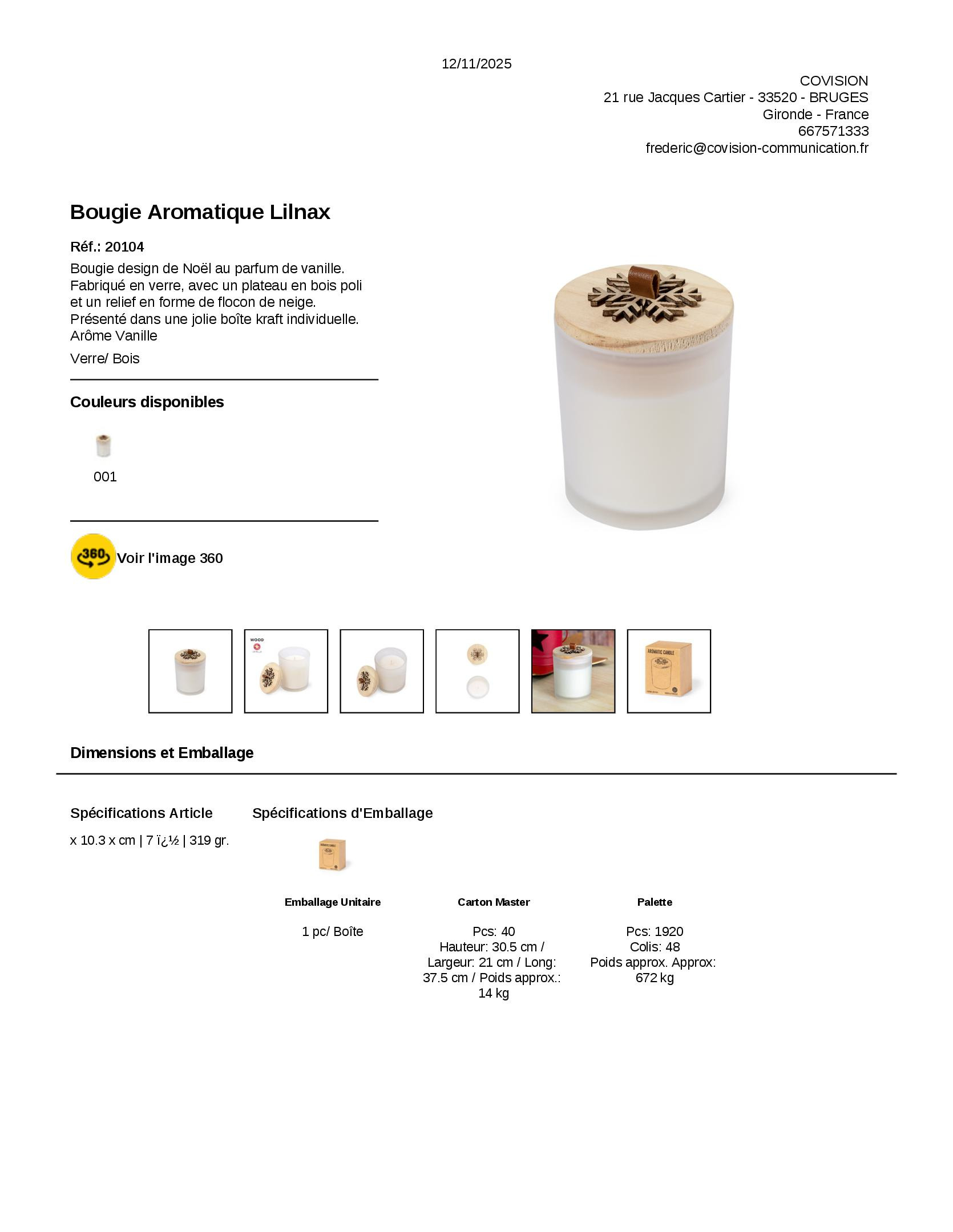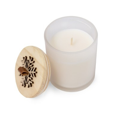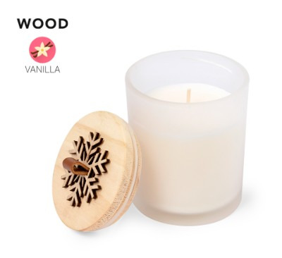 Bougie design de Noël au parfum de vanille. Fabriqué en verre, avec un plateau en bois poli et un relief en forme de flocon de neige. Présenté dans une jolie boîte kraft individuelle. Arôme Vanille Verre/ Bois