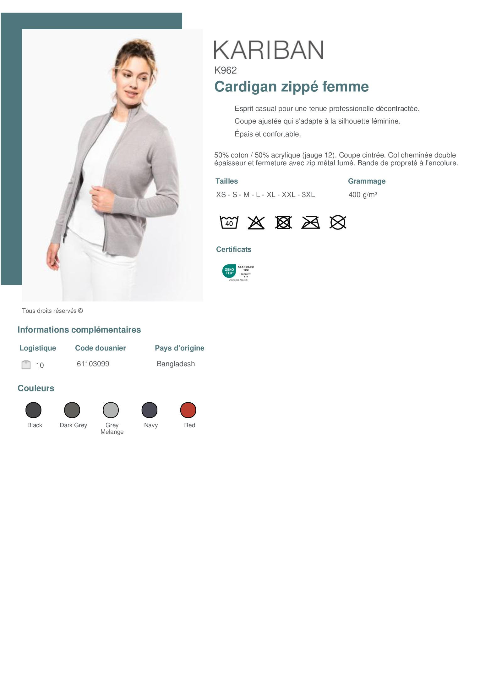 50% coton / 50% acrylique (jauge 12). Coupe cintrée. Col cheminée double épaisseur et fermeture avec zip métal fumé. Bande de propreté à l'encolure.