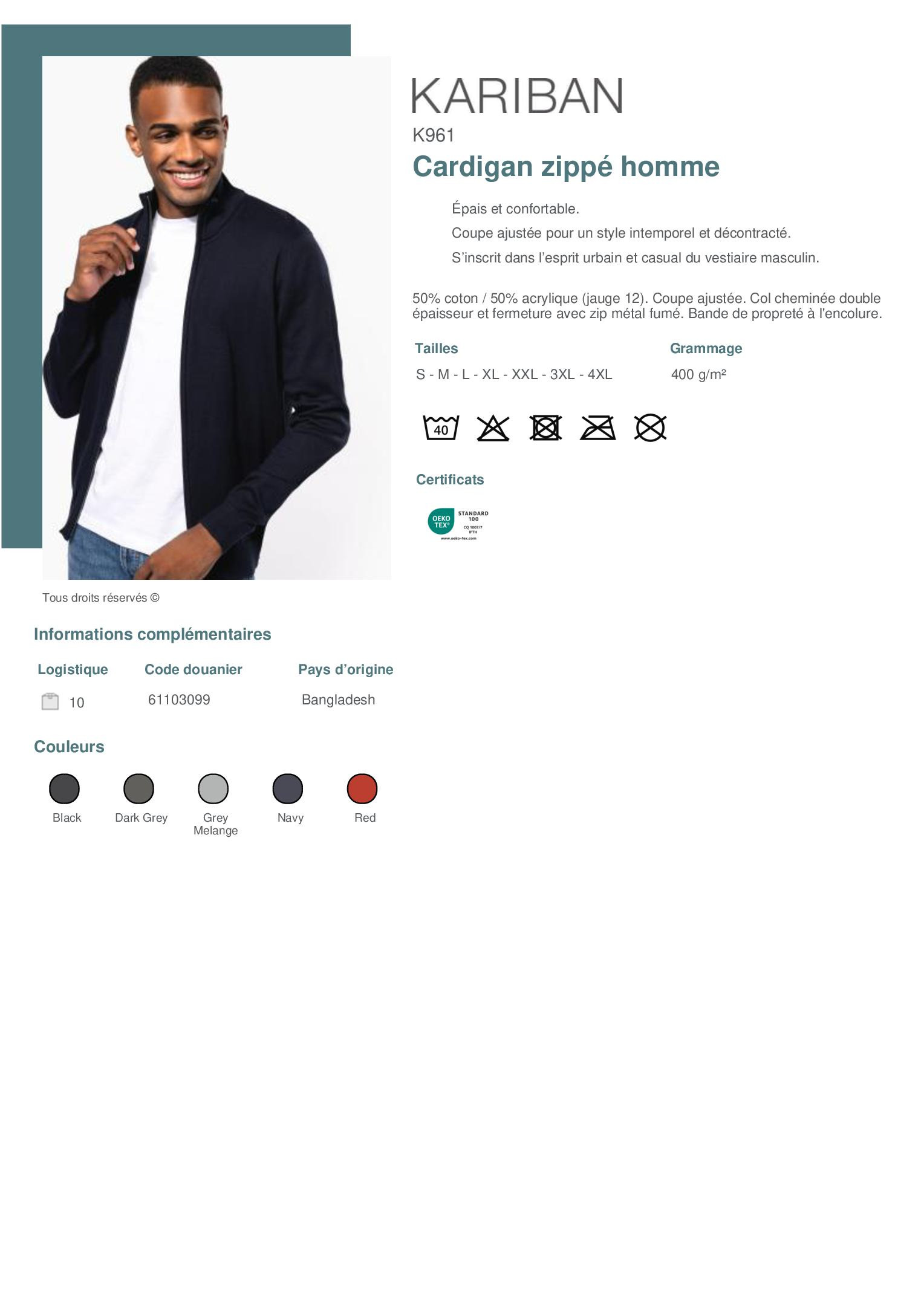 50% coton / 50% acrylique (jauge 12). Coupe ajustée. Col cheminée double épaisseur et fermeture avec zip métal fumé. Bande de propreté à l'encolure.