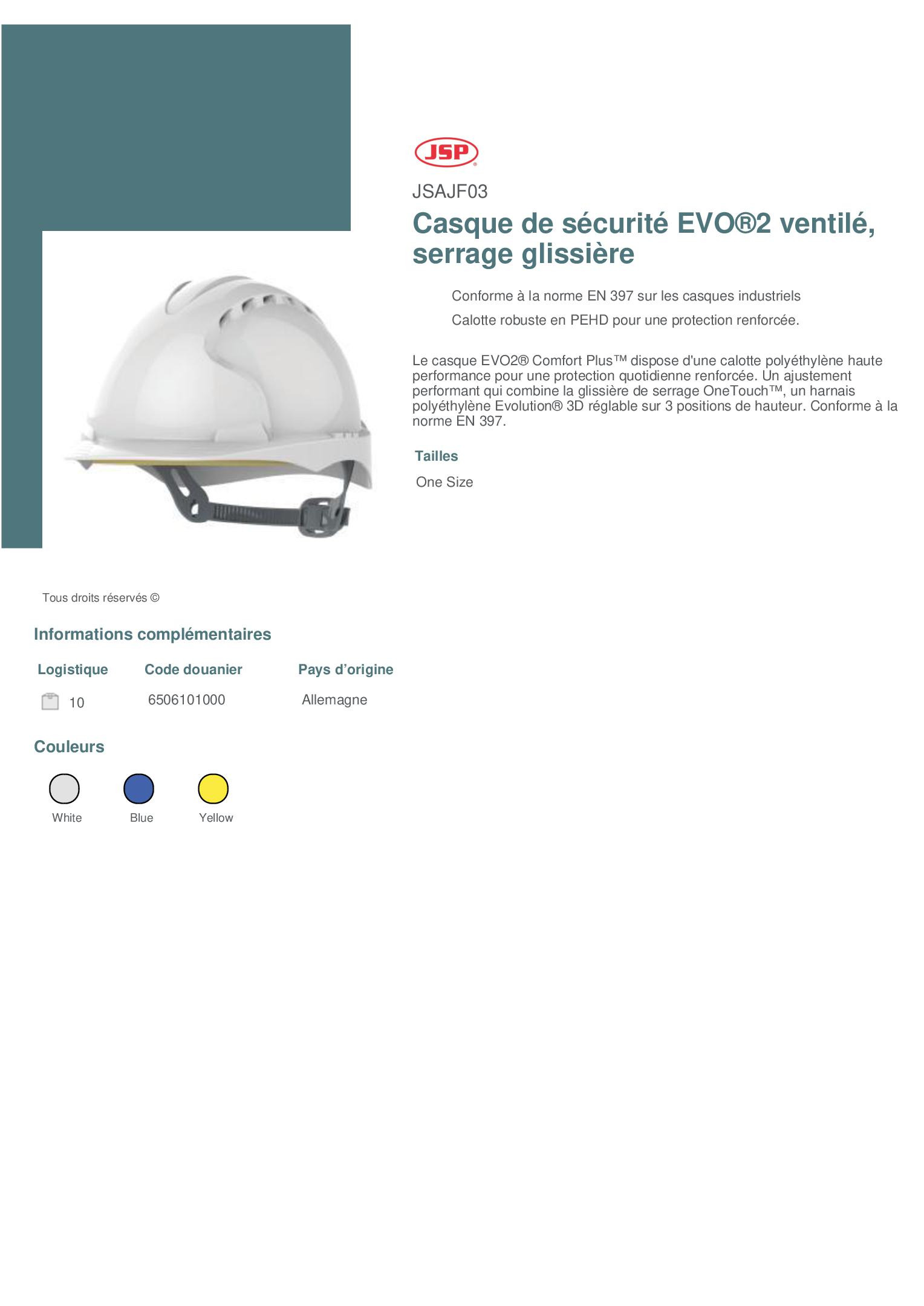 Casque de sécurité EVO®2 ventilé, serrage glissière - JSAJF03