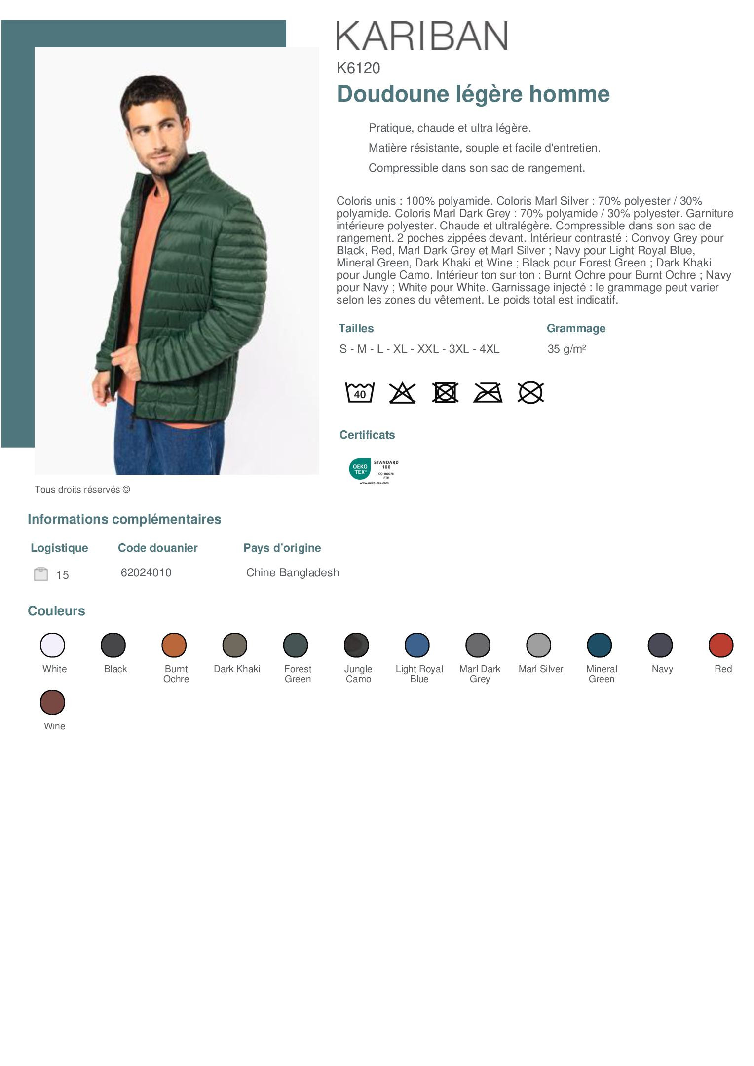 Coloris unis : 100% polyamide. Coloris Marl Silver : 70% polyester / 30% polyamide. Coloris Marl Dark Grey : 70% polyamide / 30% polyester. Garniture intérieure polyester. Chaude et ultralégère. Compressible dans son sac de rangement. 2 poches zippées devant. Intérieur contrasté : Convoy Grey pour Black, Red, Marl Dark Grey et Marl Silver ; Navy pour Light Royal Blue, Mineral Green, Dark Khaki et Wine ; Black pour Forest Green ; Dark Khaki pour Jungle Camo. Intérieur ton sur ton : Burnt Ochre pour Burnt Ochre ; Navy pour Navy ; White pour White. Garnissage injecté : le grammage peut varier selon les zones du vêtement. Le poids total est indicatif.