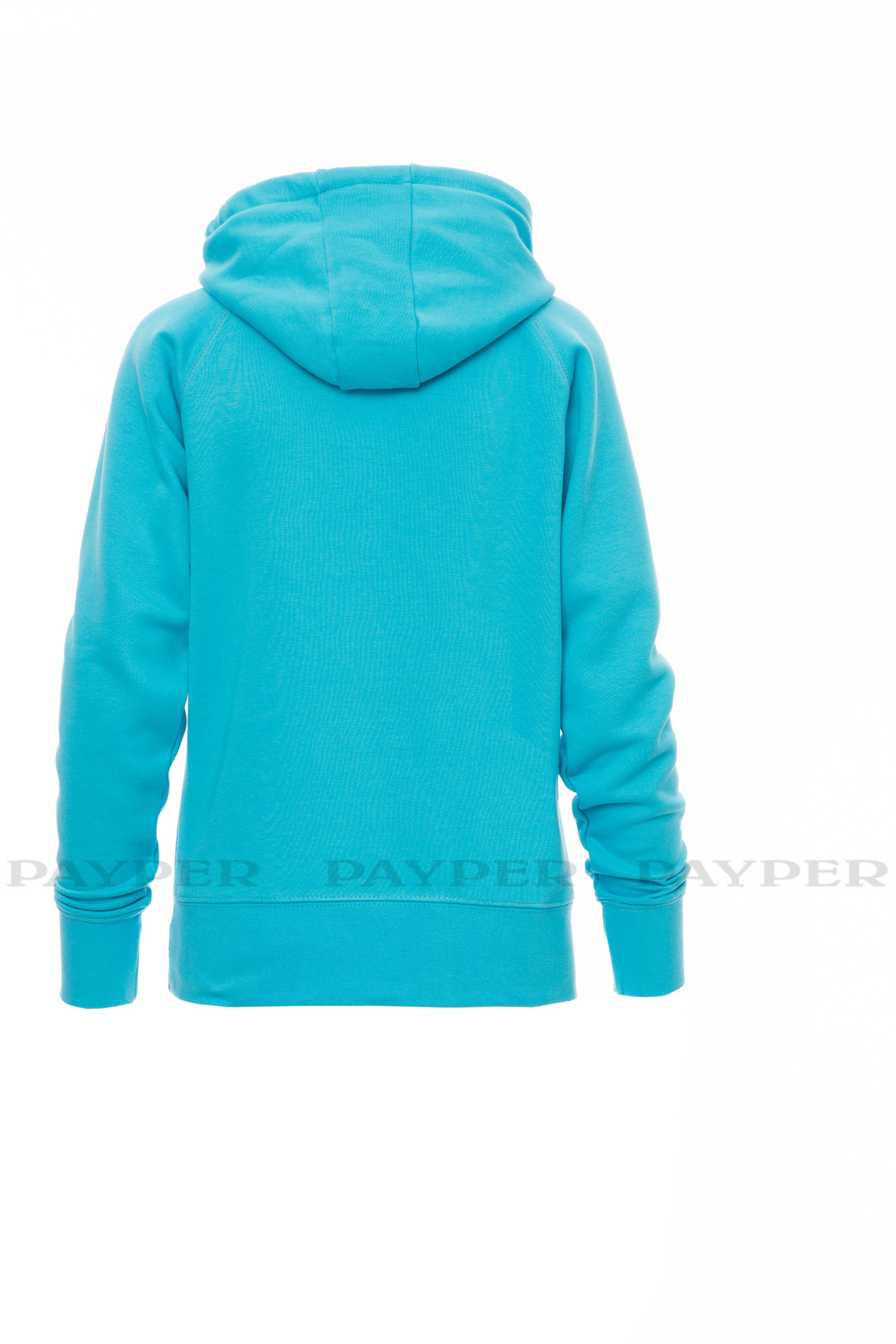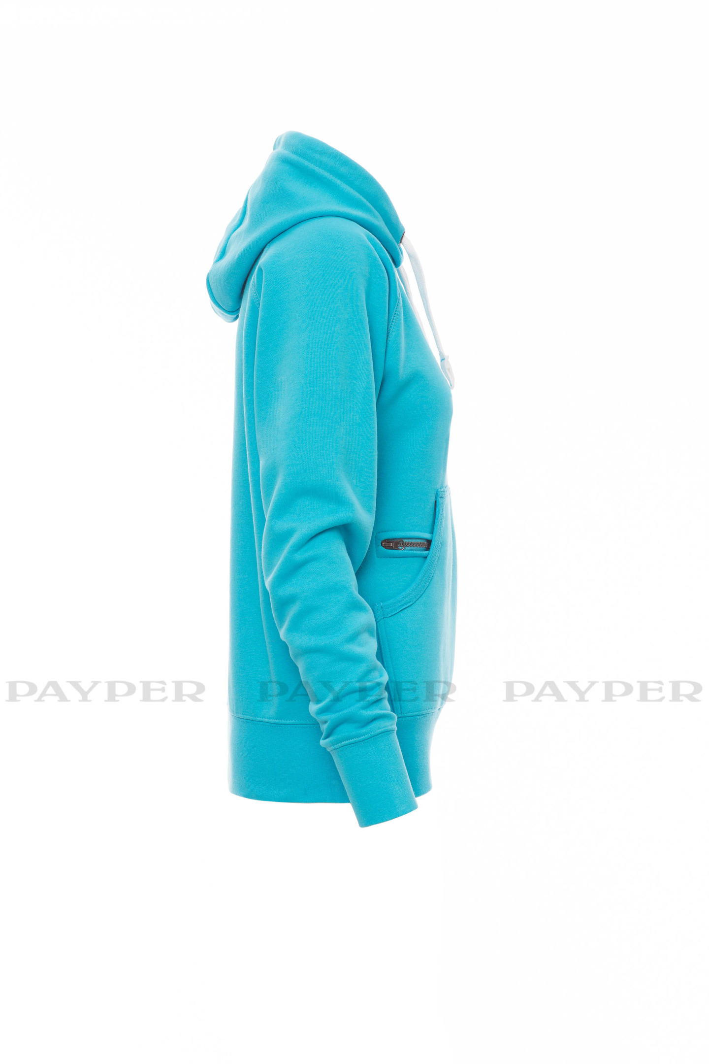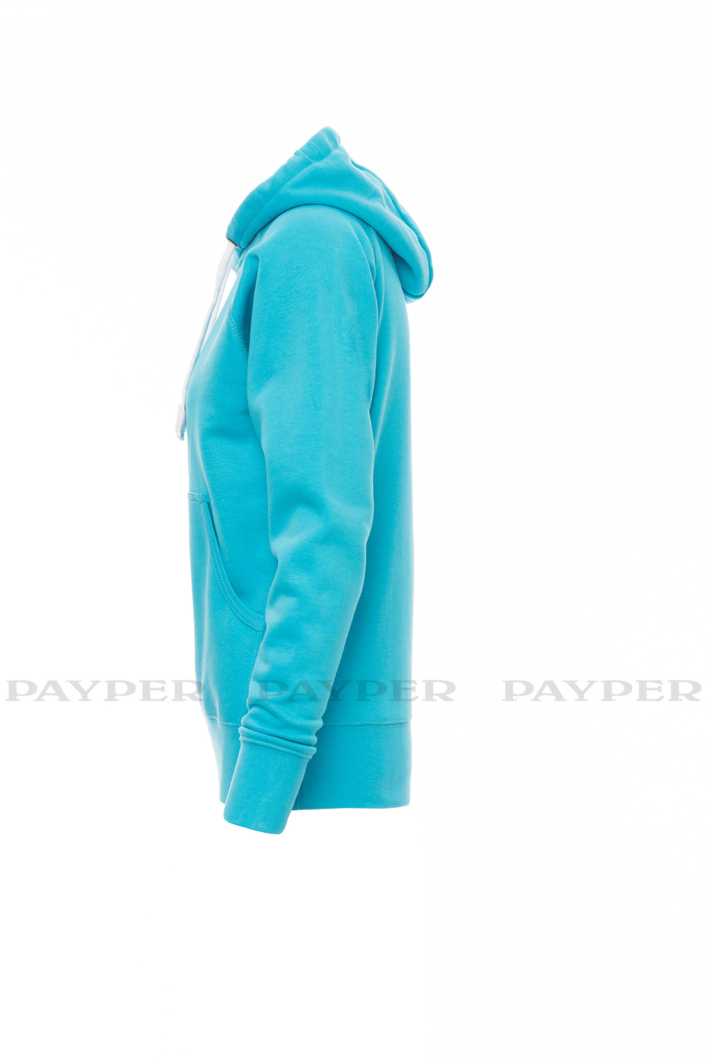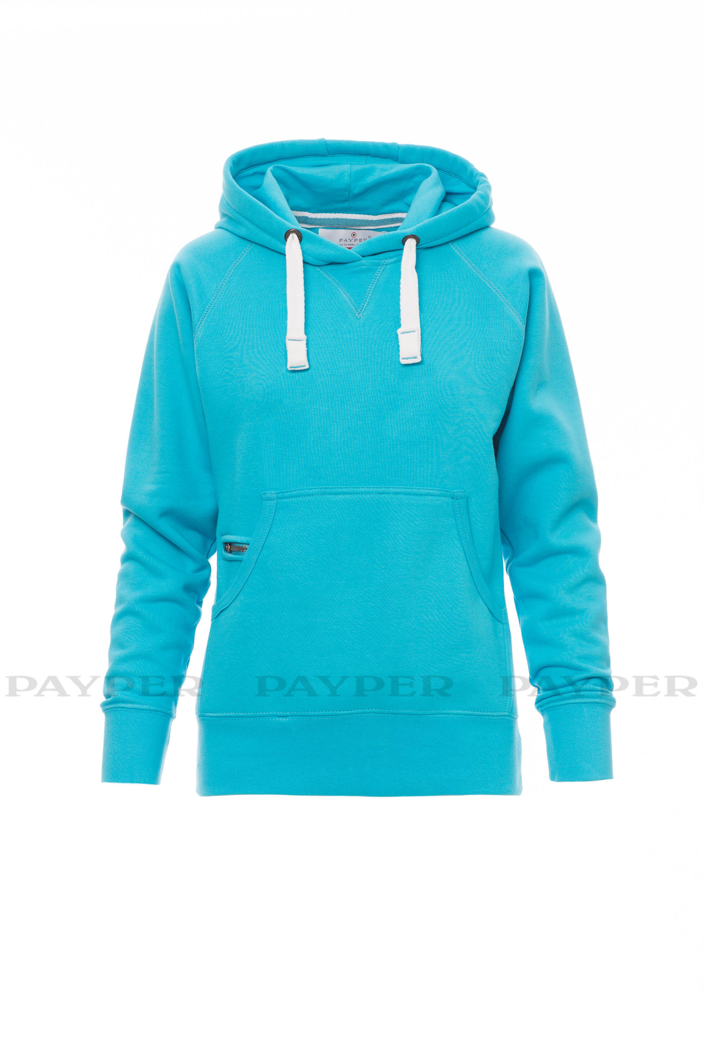 Sweat-shirt femme, coupe cintrée, avec capuche à deux coutures et coulisse en cordon blanc avec coutures teinte assortie et anneaux en métal . Manches raglan, couture esthétique en V au col, poches kangourou, petite poche à zip, poignets et taille en côtes élastiques, coutures renforcées.