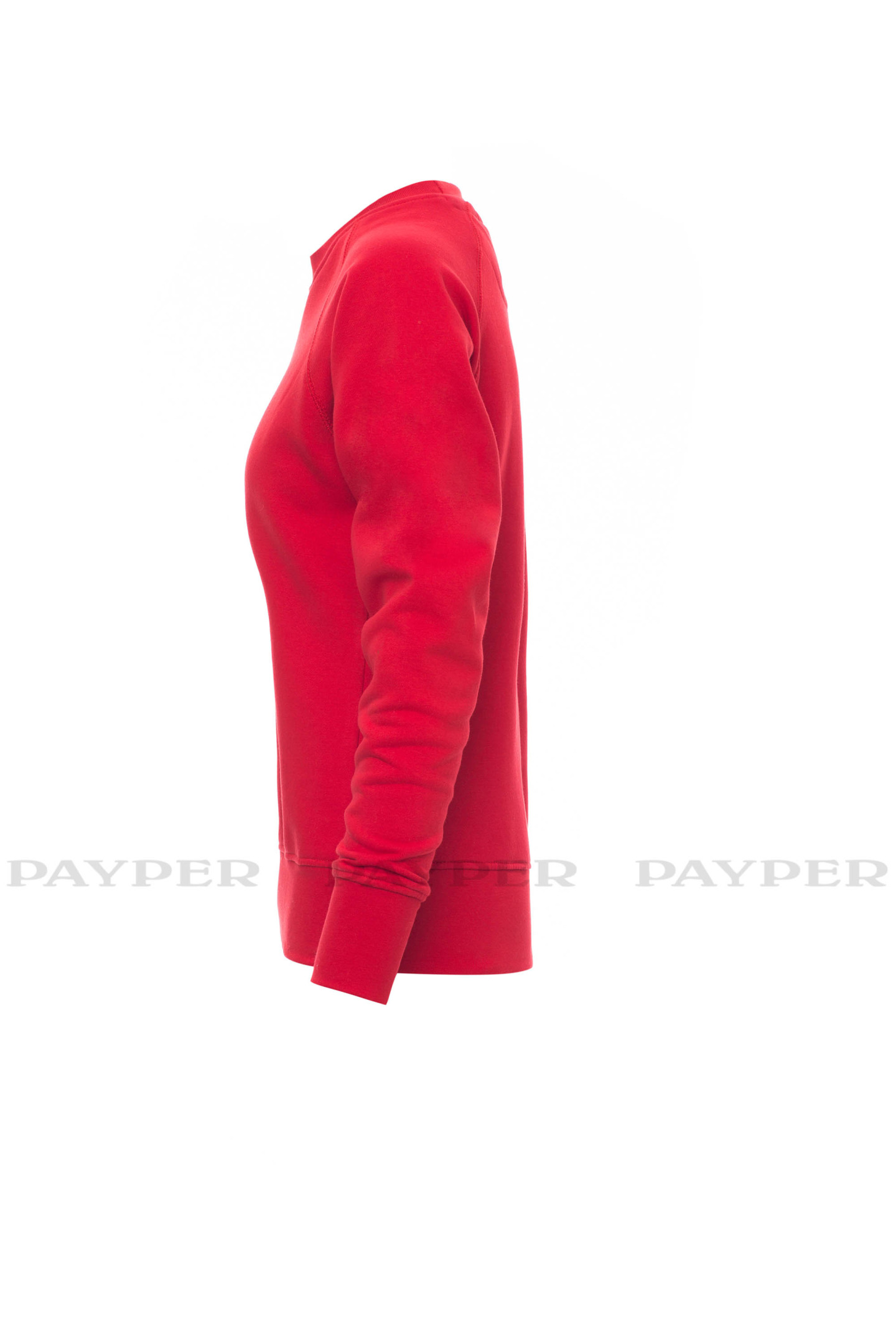 Sweat-shirt femme, ras le cou, manches raglan, couture esthétique en V au col. Poignets et taille en côtes élastiques, coutures renforcées.