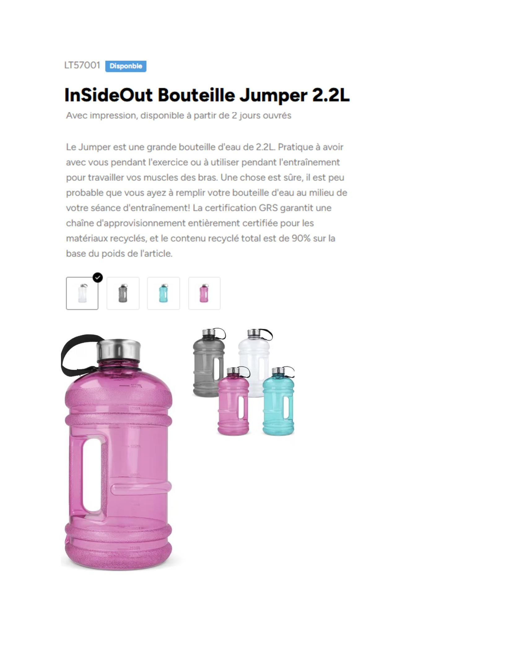 Le Jumper est une grande bouteille d'eau de 2.2L. Pratique à avoir avec vous pendant l'exercice ou à utiliser pendant l'entraînement pour travailler vos muscles des bras. Une chose est sûre, il est peu probable que vous ayez à remplir votre bouteille d'eau au milieu de votre séance d'entraînement! La certification GRS garantit une chaîne d'approvisionnement entièrement certifiée pour les matériaux recyclés, et le contenu recyclé total est de 90% sur la base du poids de l'article.