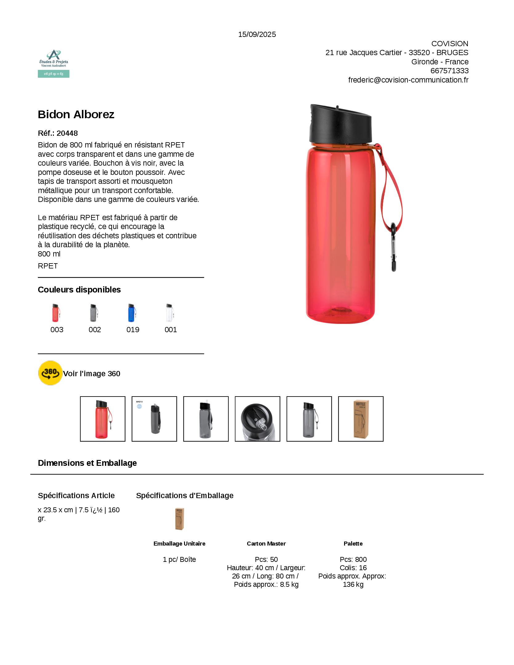 Bidon de 800 ml fabriqué en résistant RPET avec corps transparent et dans une gamme de couleurs variée. Bouchon à vis noir, avec la pompe doseuse et le bouton poussoir. Avec tapis de transport assorti et mousqueton métallique pour un transport confortable. Disponible dans une gamme de couleurs variée.