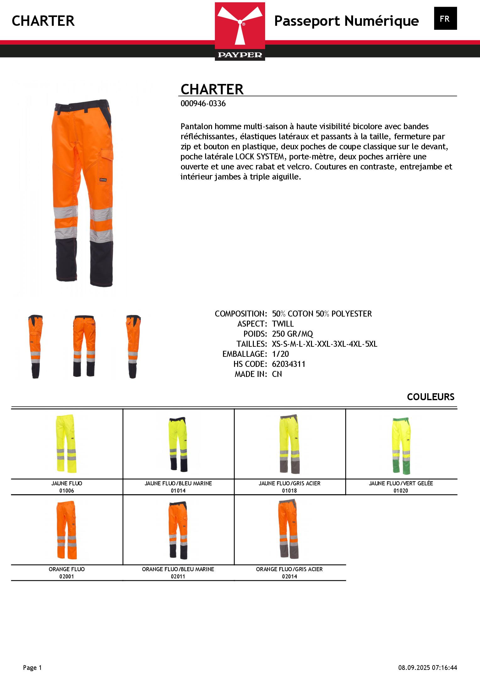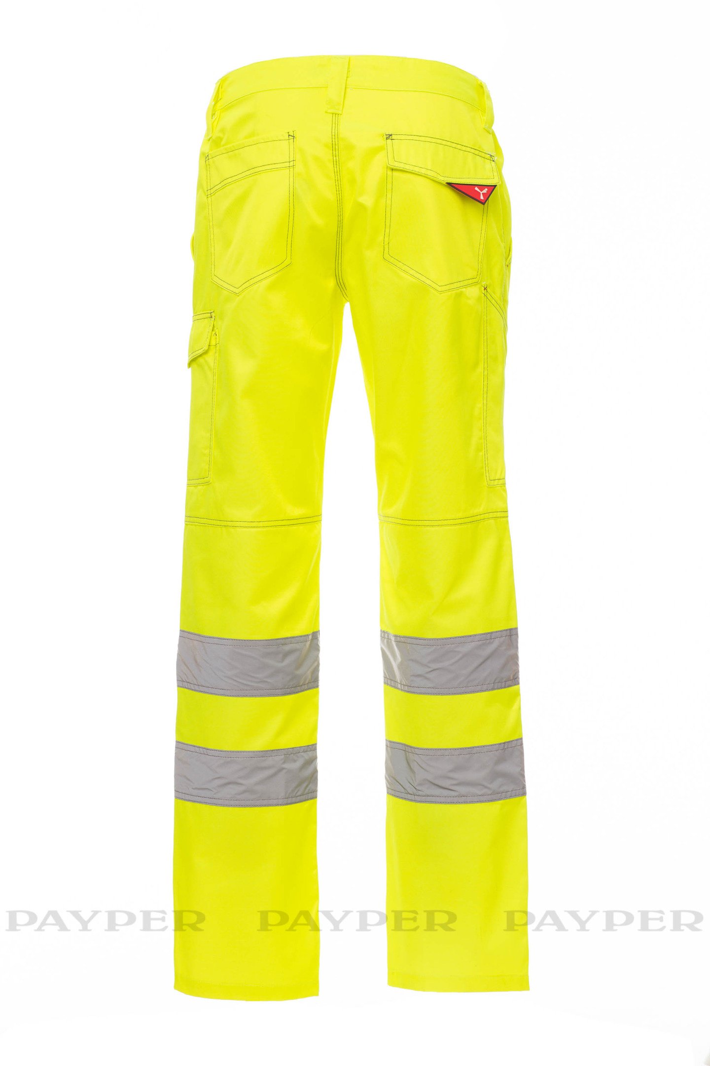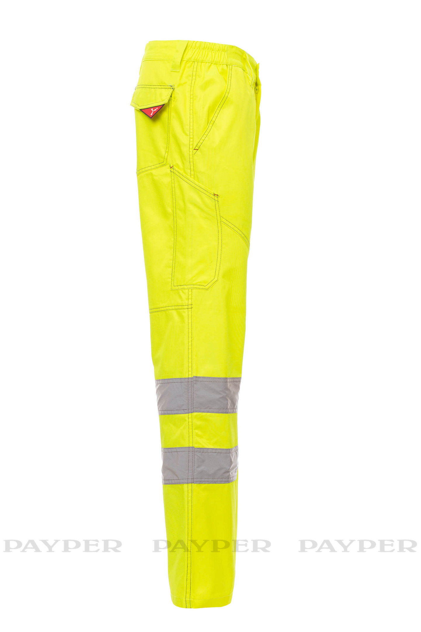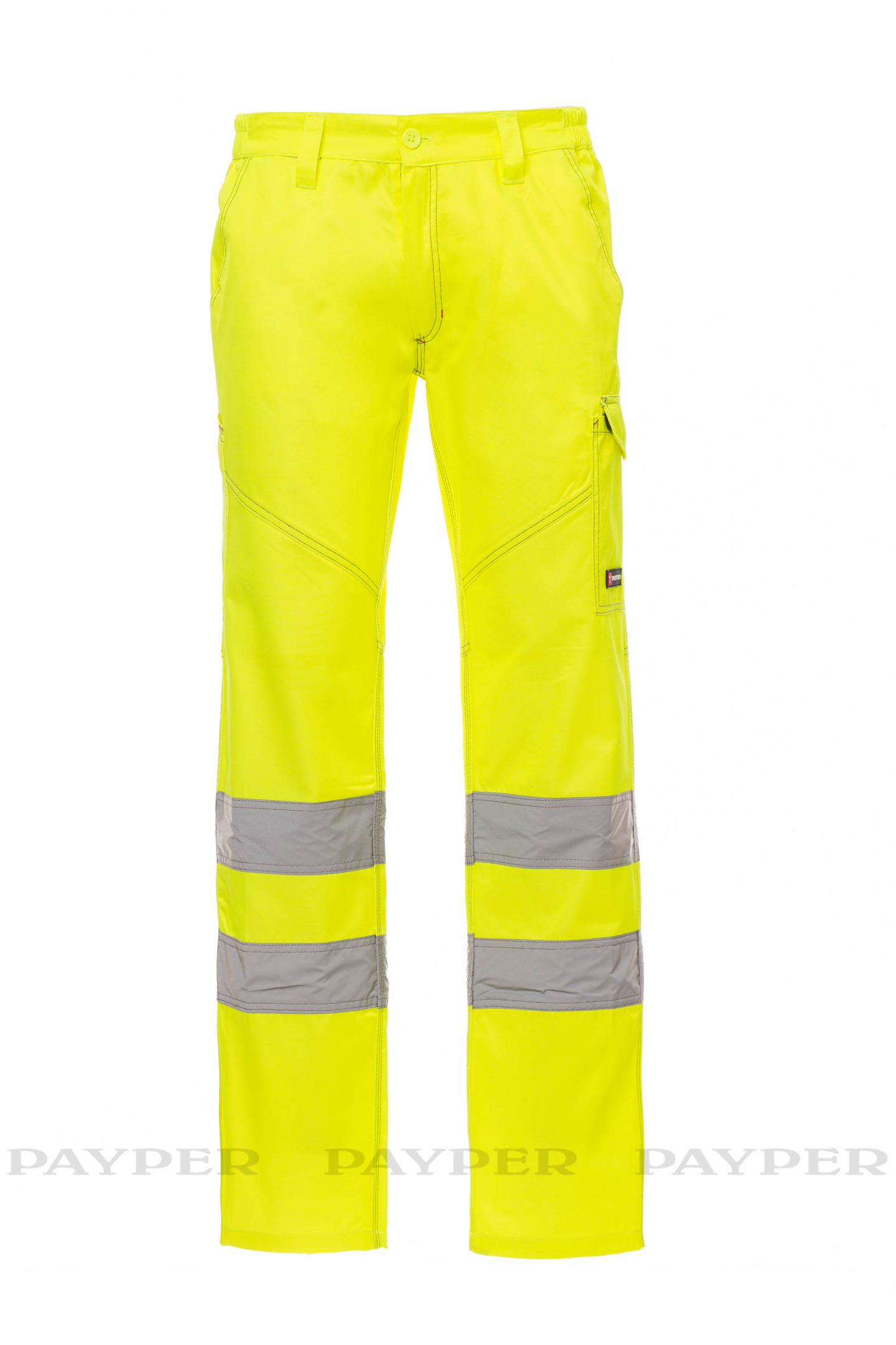 Pantalon homme multi-saison à haute visibilité bicolore avec bandes réfléchissantes, élastiques latéraux et passants à la taille, fermeture par zip et bouton en plastique, deux poches de coupe classique sur le devant, poche latérale LOCK SYSTEM, porte-mètre, deux poches arrière une ouverte et une avec rabat et velcro. Coutures en contraste, entrejambe et intérieur jambes à triple aiguille.