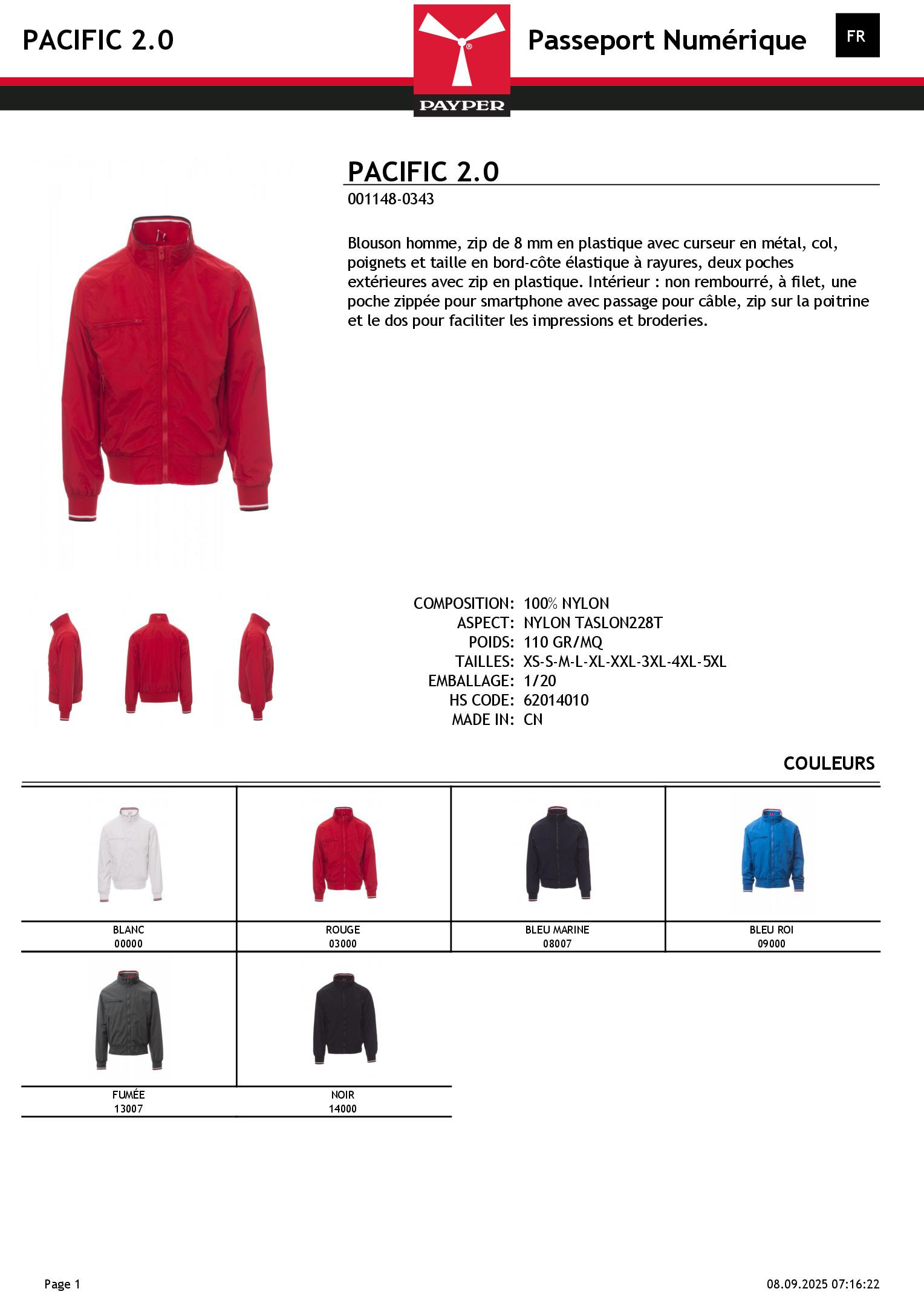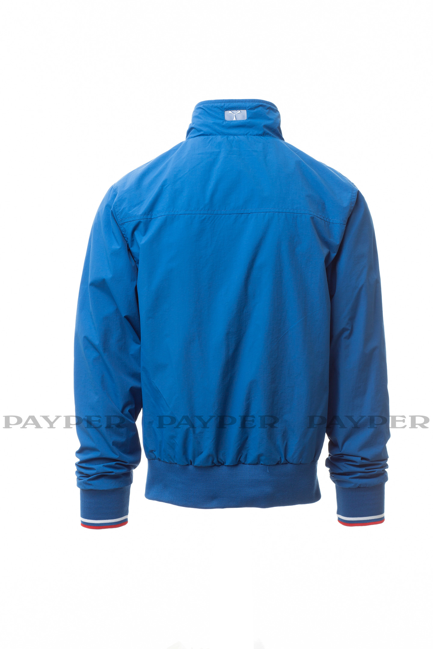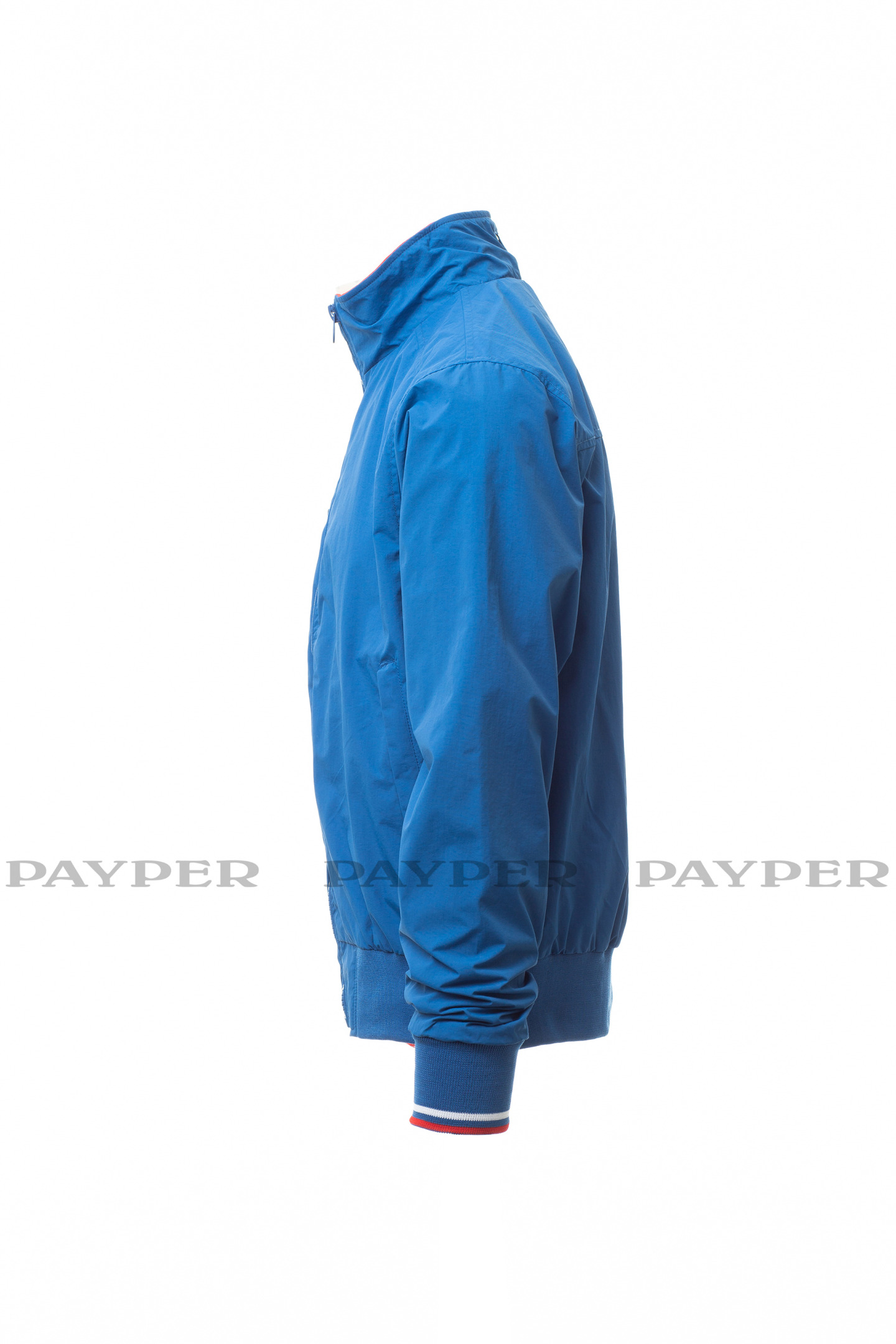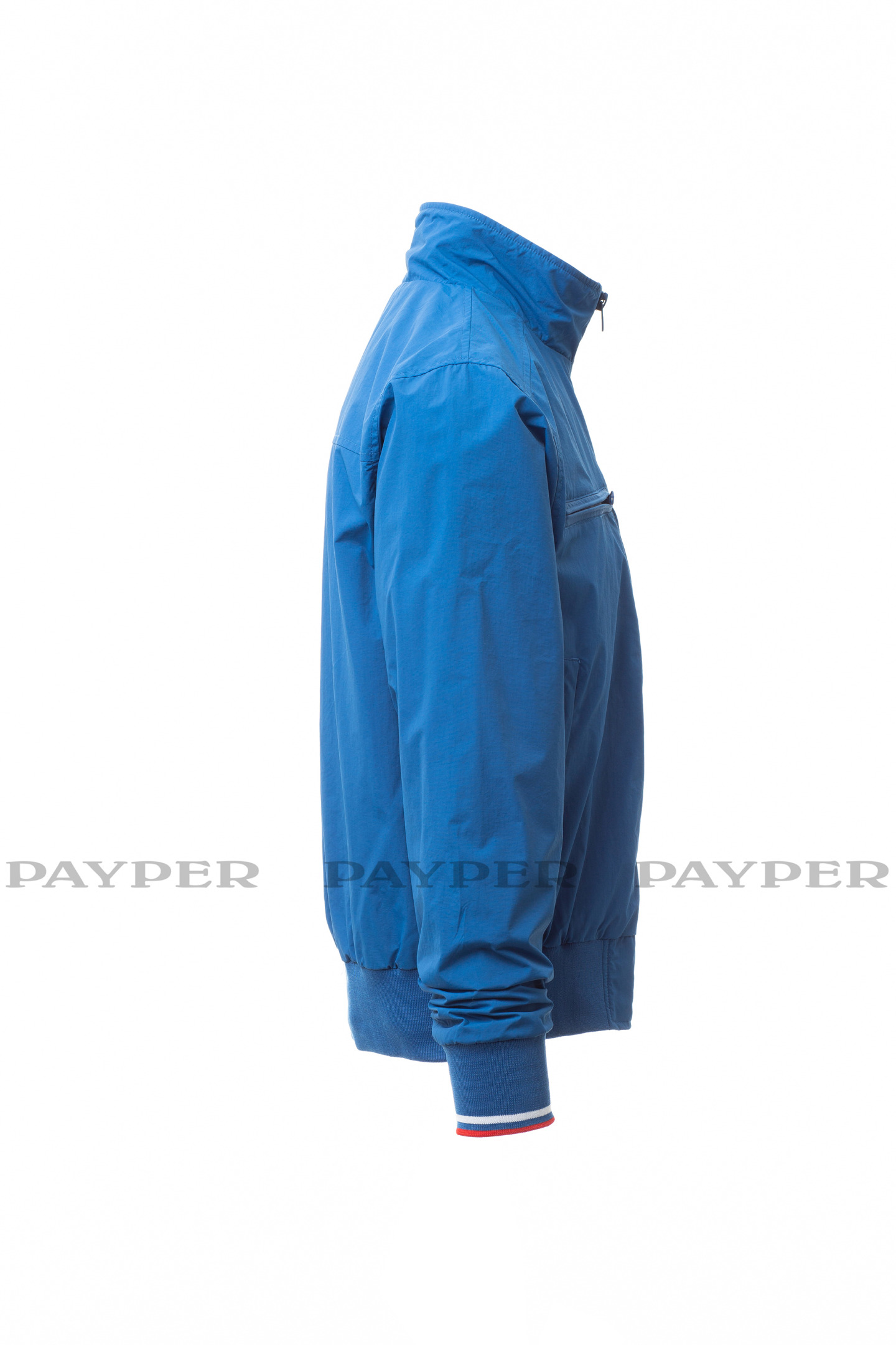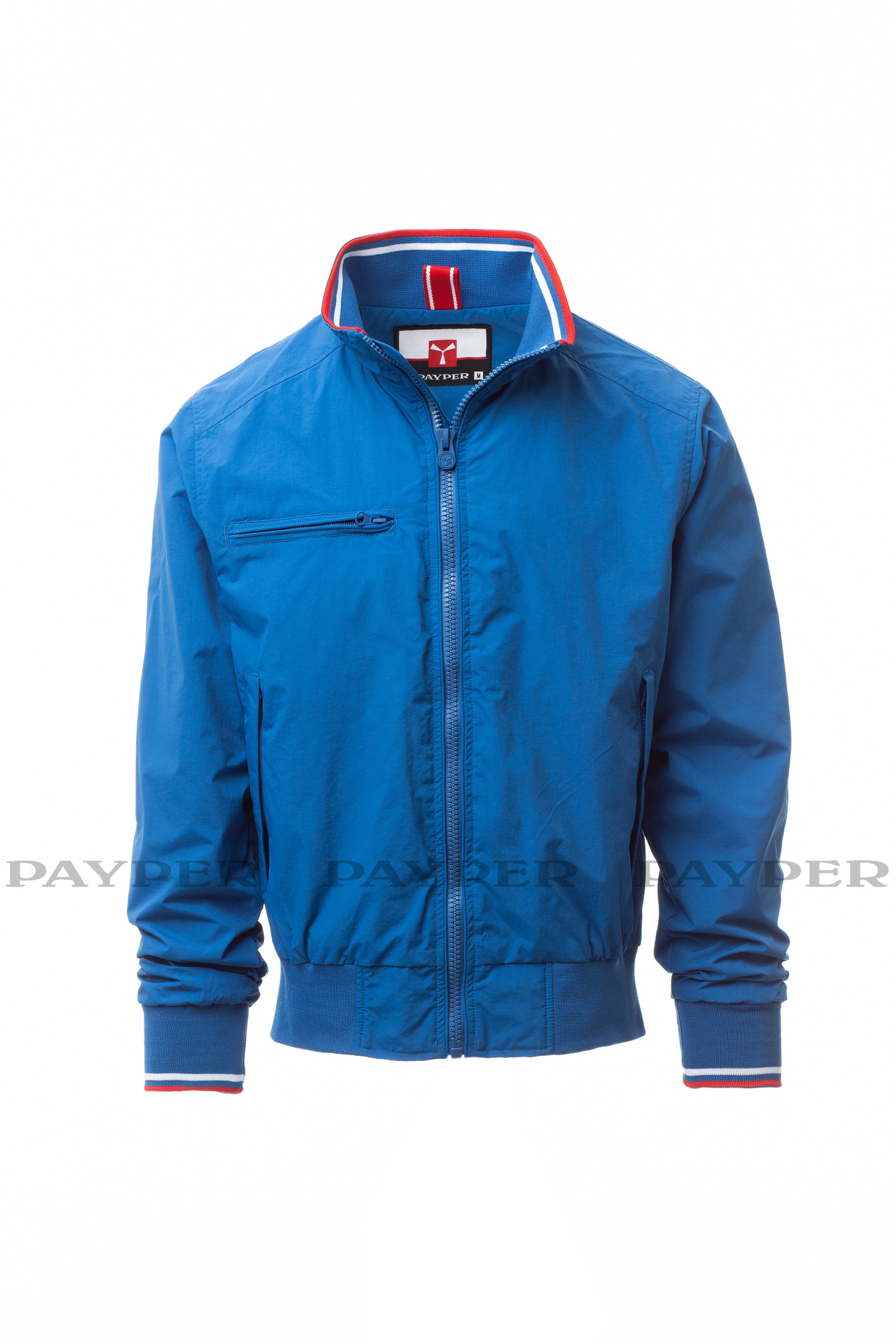 Blouson homme, zip de 8 mm en plastique avec curseur en métal, col, poignets et taille en bord-côte élastique à rayures, deux poches extérieures avec zip en plastique. Intérieur : non rembourré, à filet, une poche zippée pour smartphone avec passage pour câble, zip sur la poitrine et le dos pour faciliter les impressions et broderies.