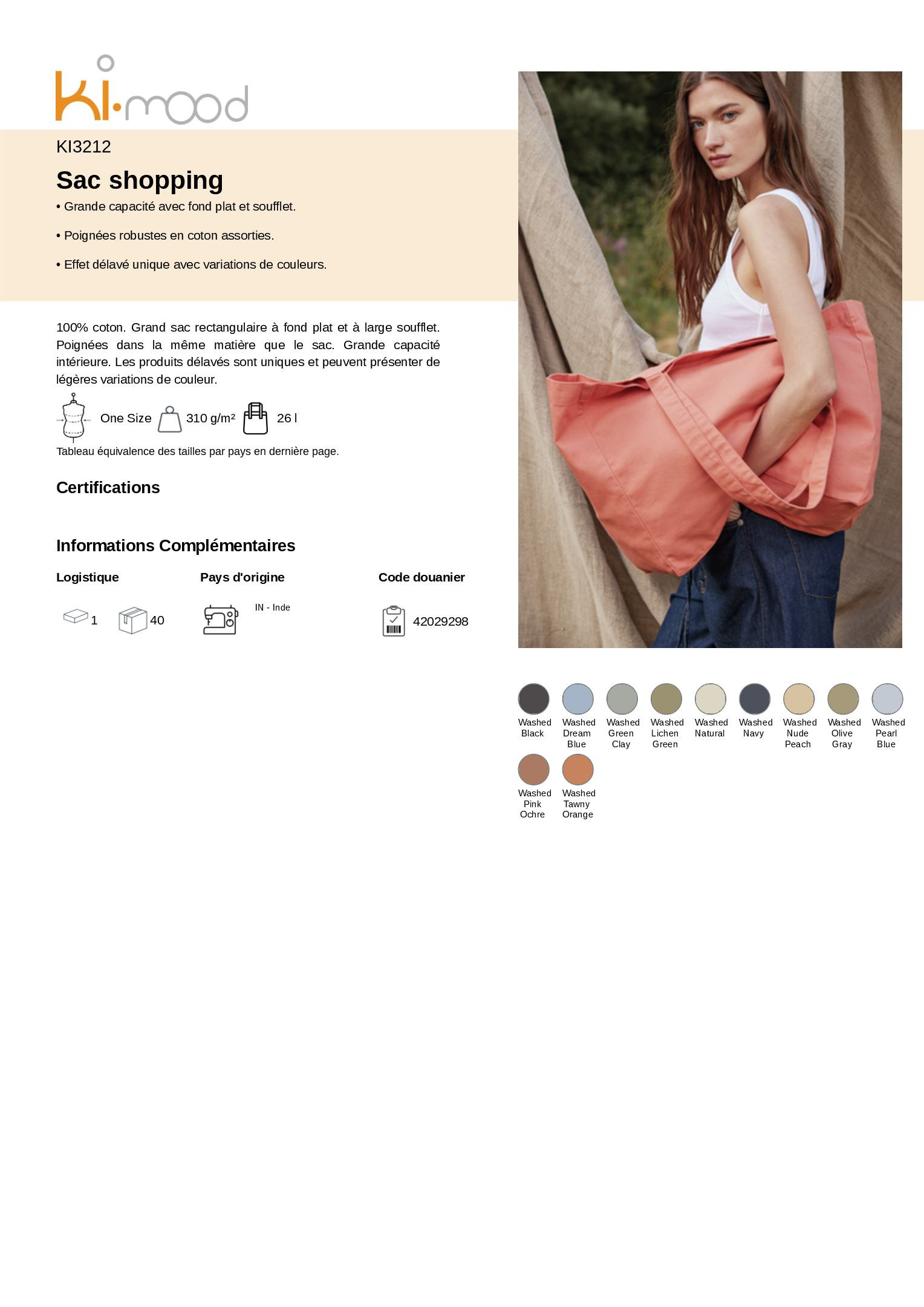 100% coton. Grand sac rectangulaire à fond plat et à large soufflet. Poignées dans la même matière que le sac. Grande capacité intérieure. Les produits délavés sont uniques et peuvent présenter de légères variations de couleur.