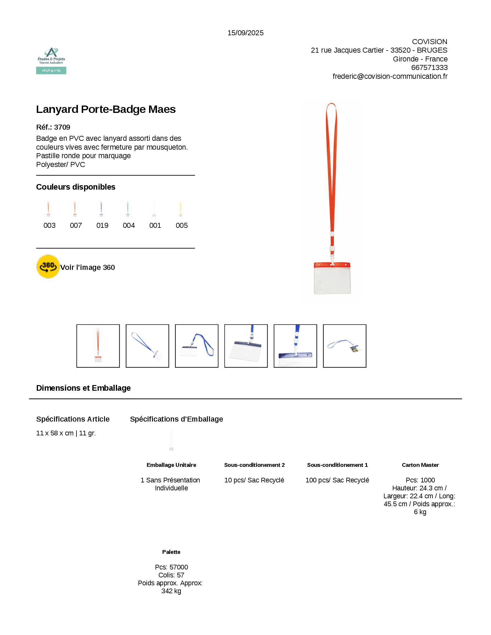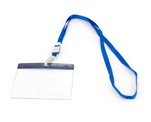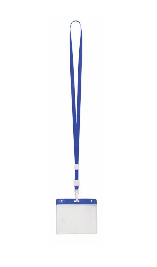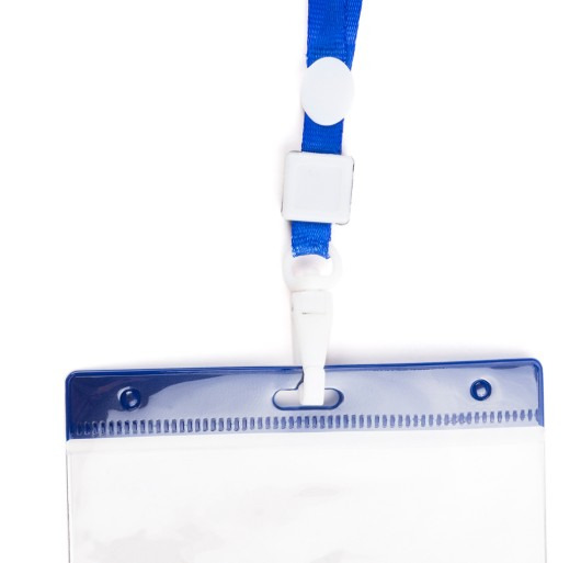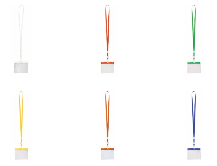 Badge en PVC avec lanyard assorti dans des couleurs vives avec fermeture par mousqueton. Pastille ronde pour marquage