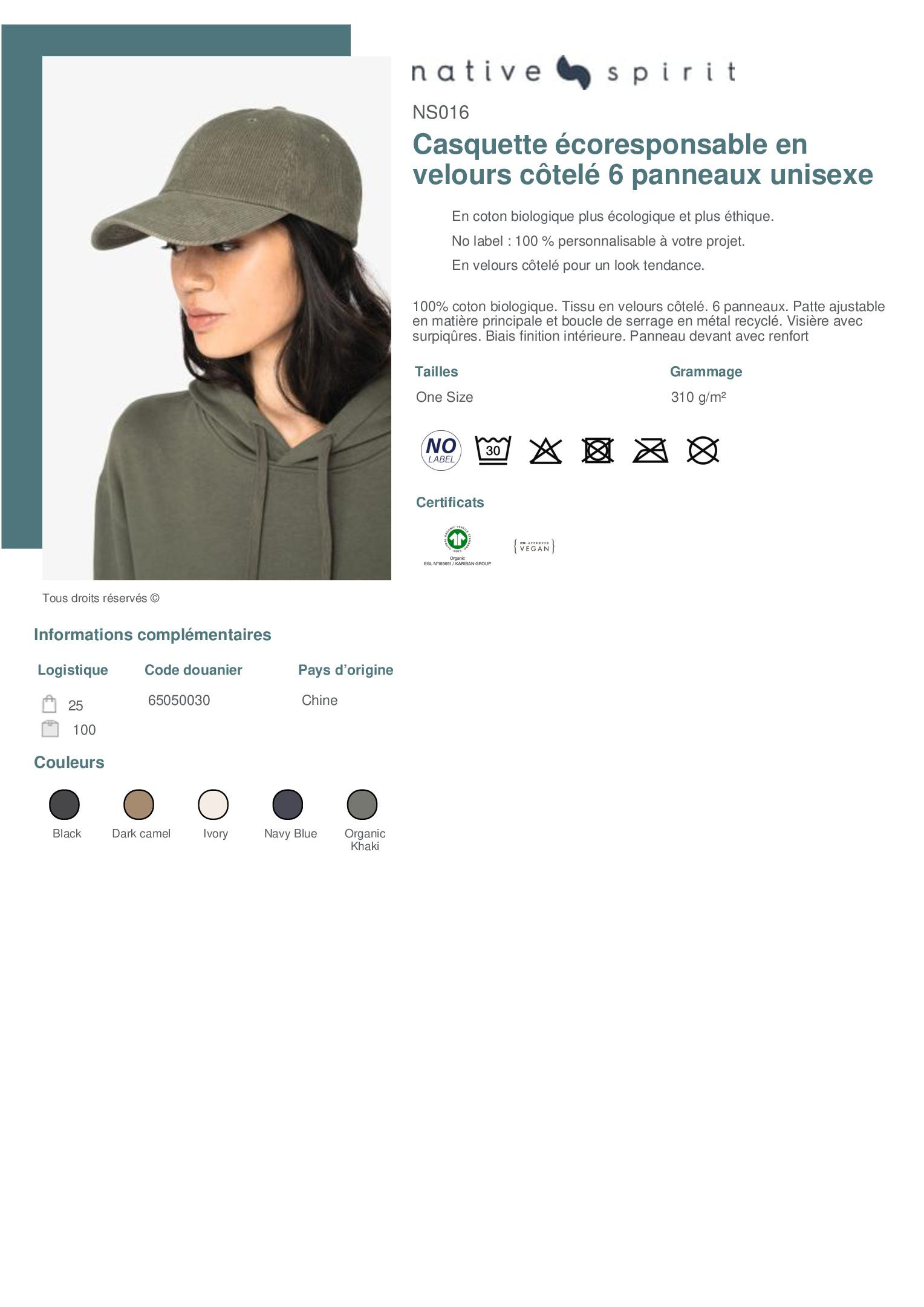 100% coton biologique. Tissu en velours côtelé. 6 panneaux. Patte ajustable en matière principale et boucle de serrage en métal recyclé. Visière avec surpiqûres. Biais finition intérieure. Panneau devant avec renfort