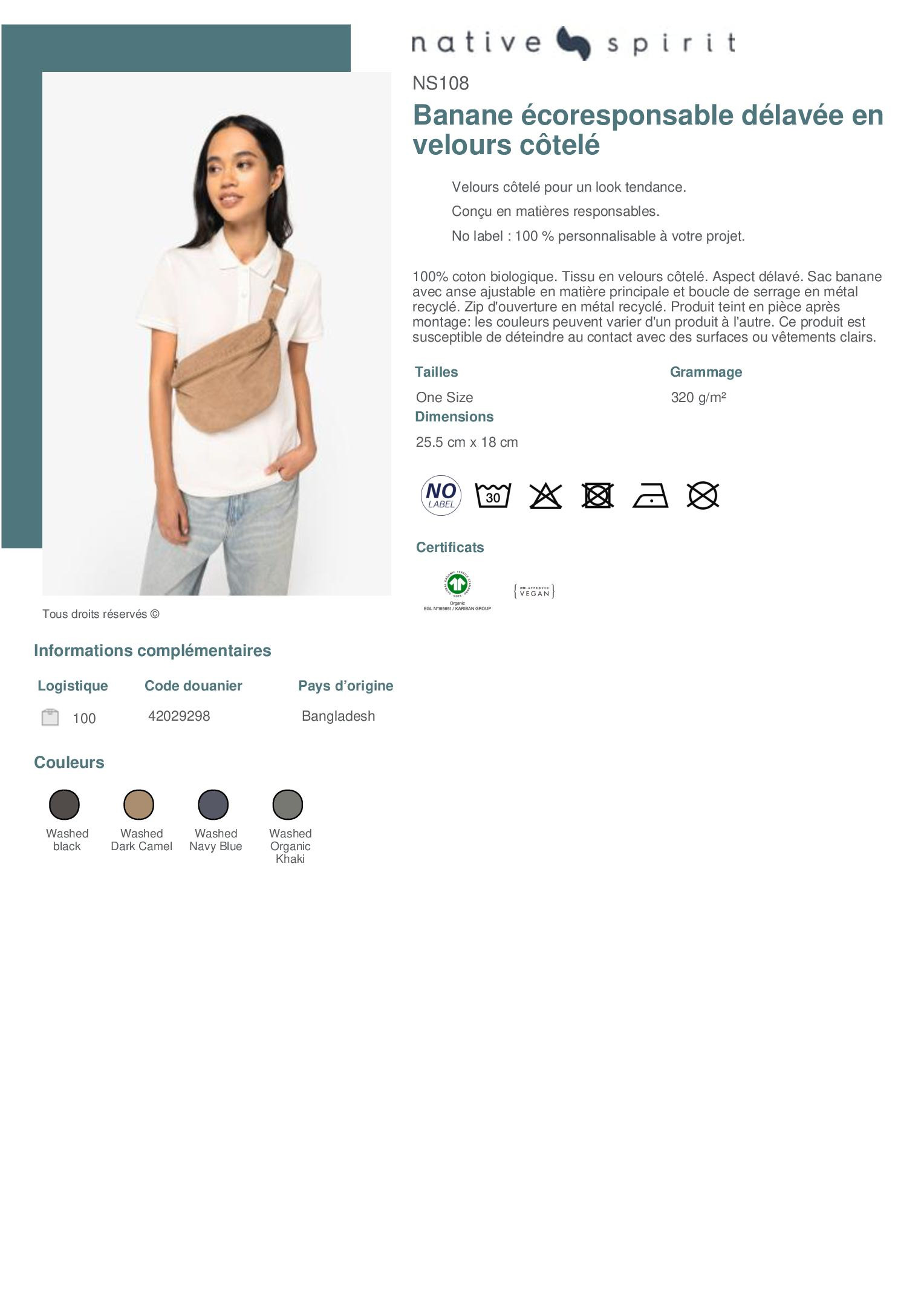 100% coton biologique. Tissu en velours côtelé. Aspect délavé. Sac banane avec anse ajustable en matière principale et boucle de serrage en métal recyclé. Zip d'ouverture en métal recyclé. Produit teint en pièce après montage: les couleurs peuvent varier d'un produit à l'autre. Ce produit est susceptible de déteindre au contact avec des surfaces ou vêtements clairs.