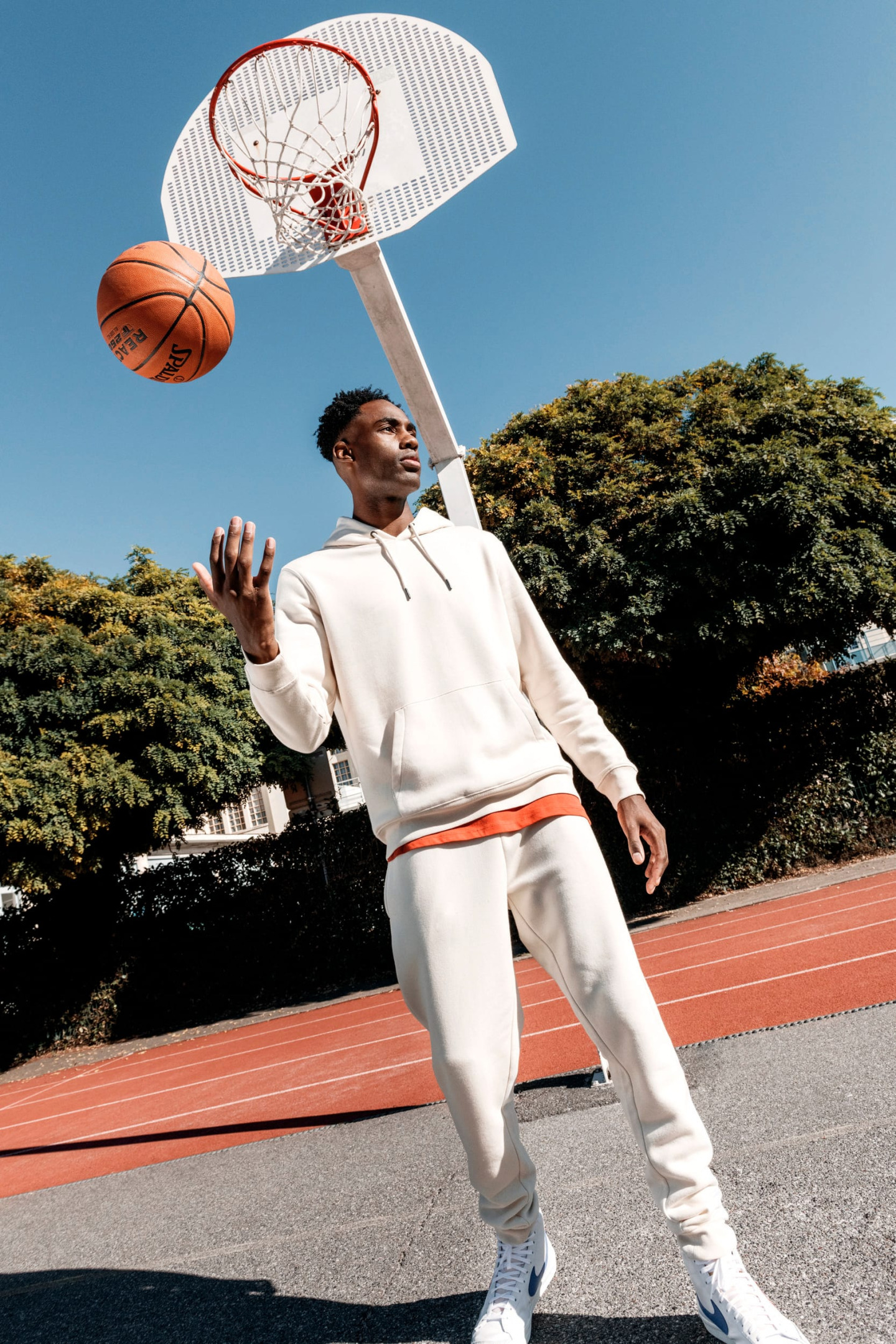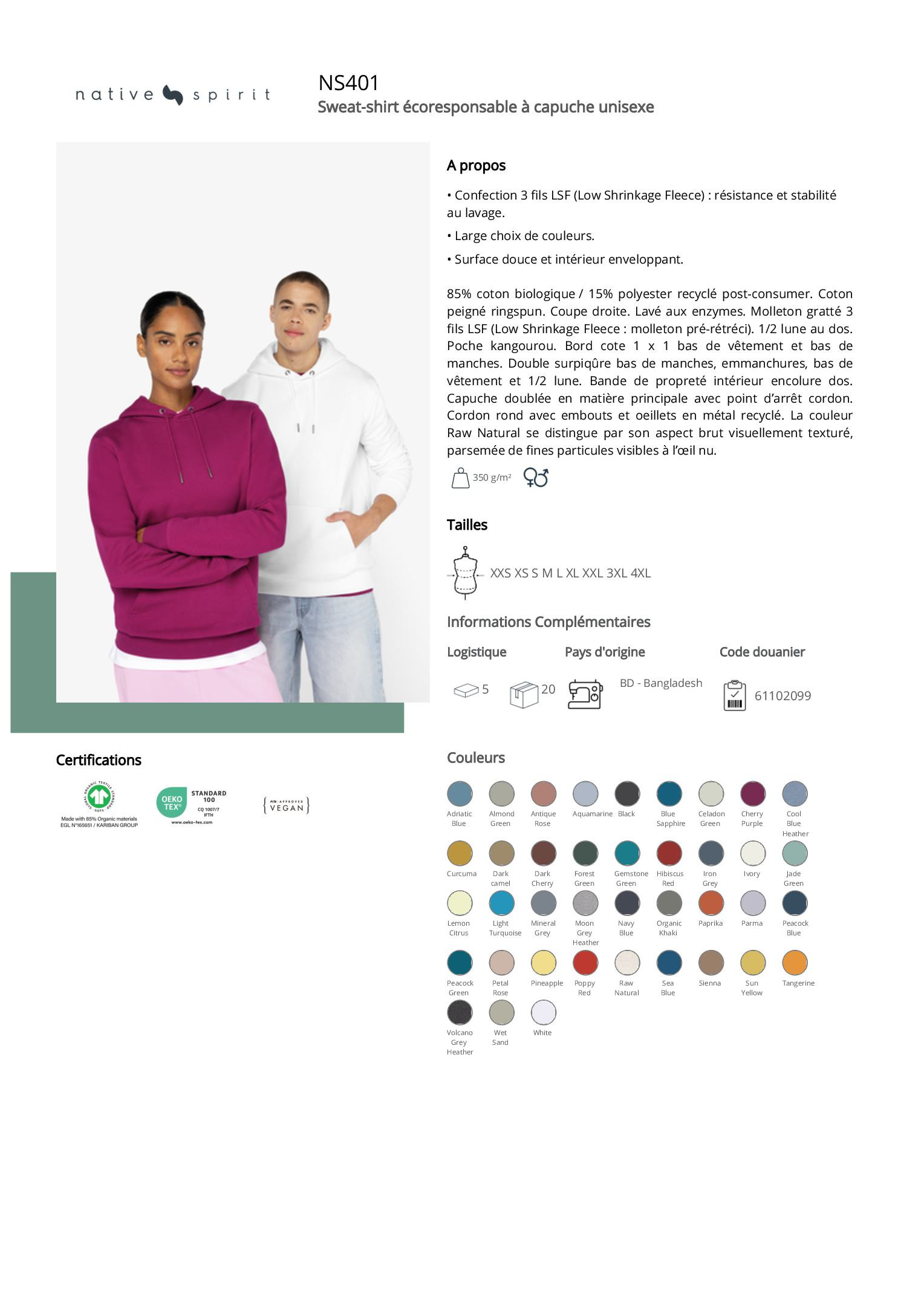 85% coton biologique / 15% polyester recyclé post-consumer. Coton peigné ringspun. Coupe droite. Lavé aux enzymes. Molleton gratté 3 fils LSF (Low Shrinkage Fleece : molleton pré-rétréci). 1/2 lune au dos. Poche kangourou. Bord cote 1 x 1 bas de vêtement et bas de manches. Double surpiqûre bas de manches, emmanchures, bas de vêtement et 1/2 lune. Bande de propreté intérieur encolure dos. Capuche doublée en matière principale avec point d’arrêt cordon. Cordon rond avec embouts et oeillets en métal recyclé. La couleur Raw Natural se distingue par son aspect brut visuellement texturé, parsemée de fines particules visibles à l’œil nu.