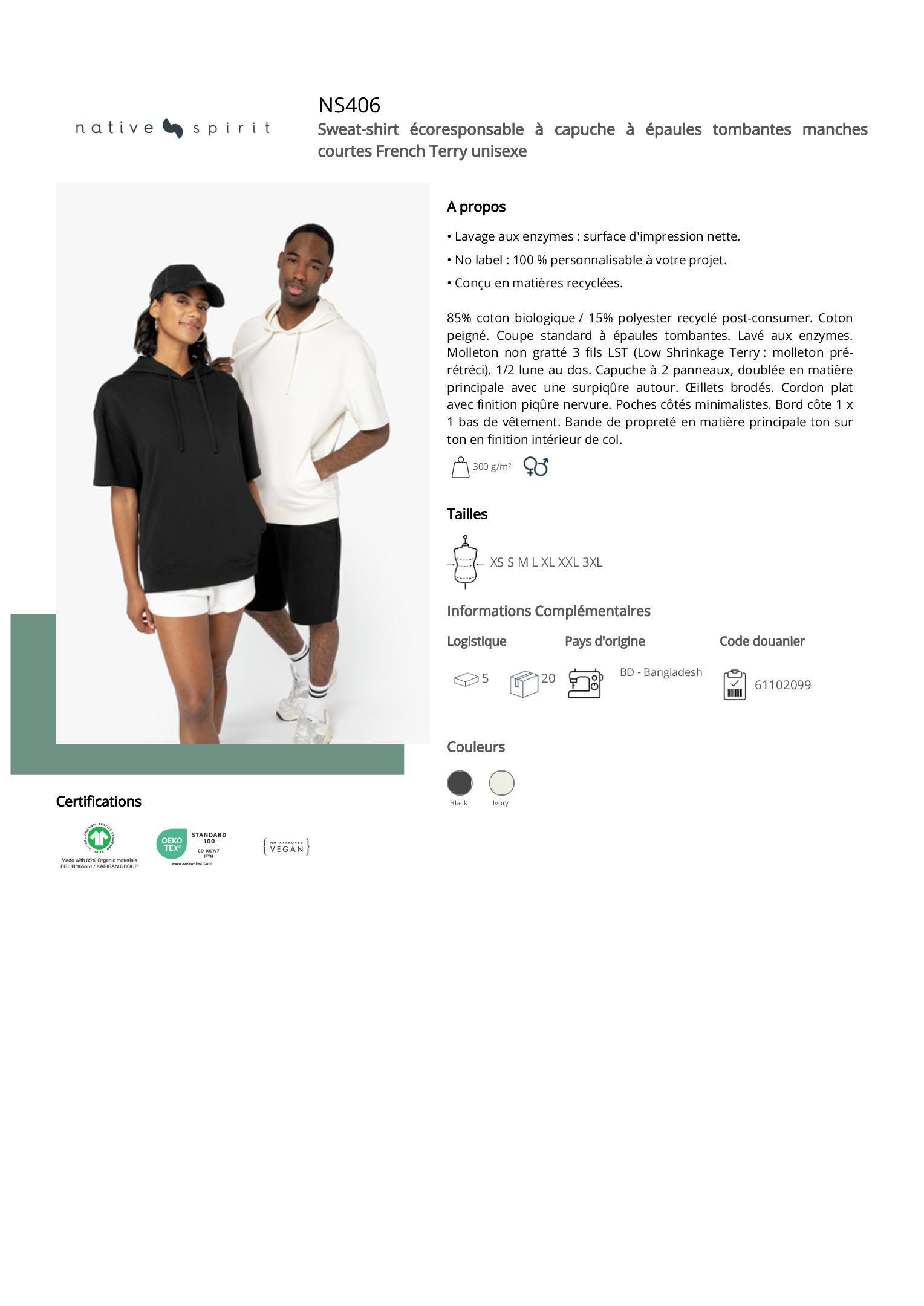 85% coton biologique / 15% polyester recyclé post-consumer. Coton peigné. Coupe standard à épaules tombantes. Lavé aux enzymes. Molleton non gratté 3 fils LST (Low Shrinkage Terry : molleton pré-rétréci). 1/2 lune au dos. Capuche à 2 panneaux, doublée en matière principale avec une surpiqûre autour. Œillets brodés. Cordon plat avec finition piqûre nervure. Poches côtés minimalistes. Bord côte 1 x 1 bas de vêtement. Bande de propreté en matière principale ton sur ton en finition intérieur de col.