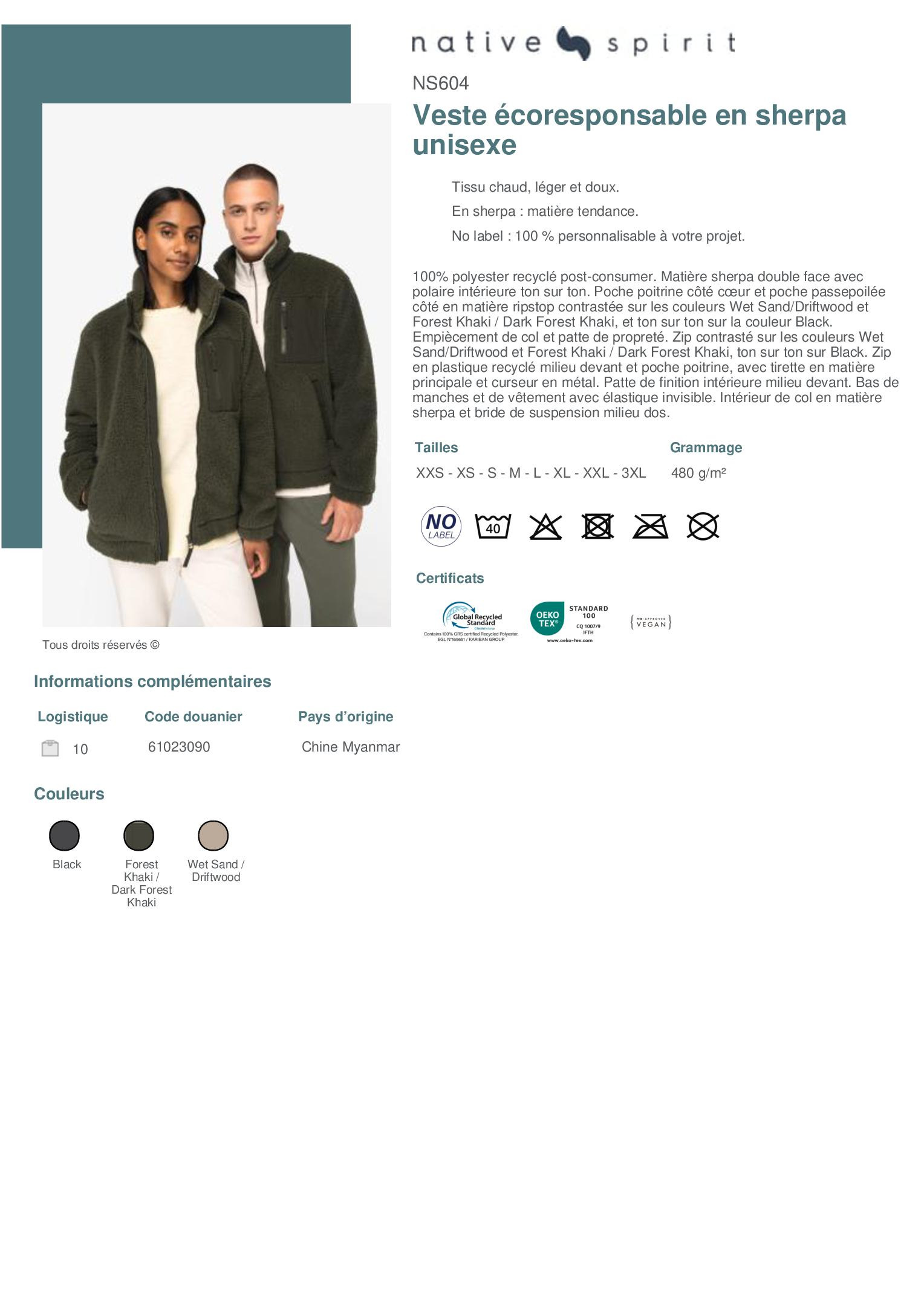 100% polyester recyclé post-consumer. Matière sherpa double face avec polaire intérieure ton sur ton. Poche poitrine côté cœur et poche passepoilée côté en matière ripstop contrastée sur les couleurs Wet Sand/Driftwood et Forest Khaki / Dark Forest Khaki, et ton sur ton sur la couleur Black. Empiècement de col et patte de propreté. Zip contrasté sur les couleurs Wet Sand/Driftwood et Forest Khaki / Dark Forest Khaki, ton sur ton sur Black. Zip en plastique recyclé milieu devant et poche poitrine, avec tirette en matière principale et curseur en métal. Patte de finition intérieure milieu devant. Bas de manches et de vêtement avec élastique invisible. Intérieur de col en matière sherpa et bride de suspension milieu dos.