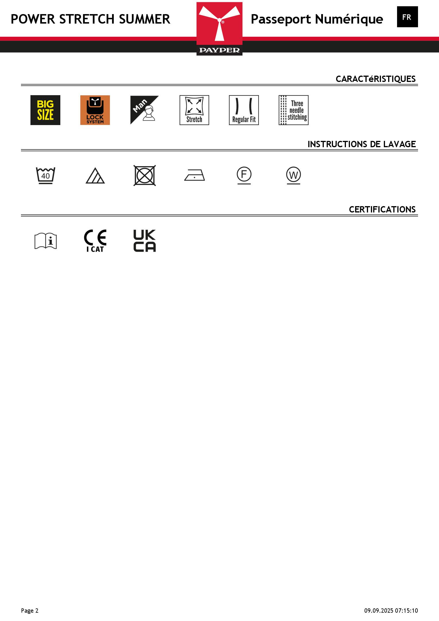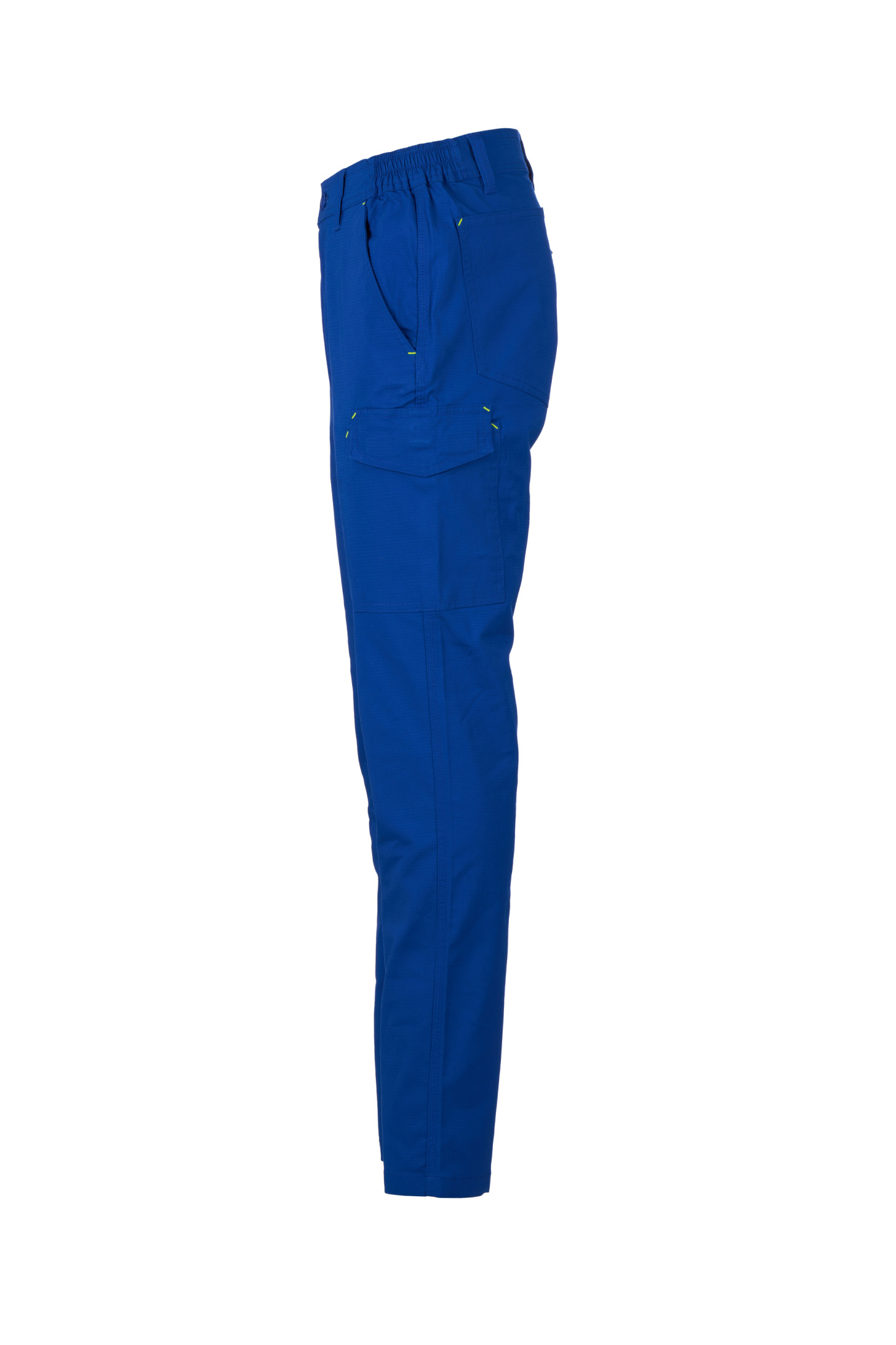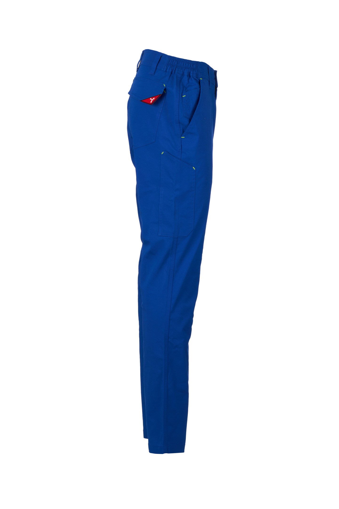 Pantalon réalisé en tissu Ripstop Stretch, léger, avec passants et élastique à la taille, fermeture à rabat avec zip et bouton en ceinture. Poches de coupe classique sur le devant, avec petite poche porte-monnaie dans la poche droite du vêtement porté et un porte-mètre latéral. Poche latérale gauche avec rabat de fermeture LOCK SYSTEM. Deux poches arrière, dont une avec rabat et velcro. Coutures triple piqûre.