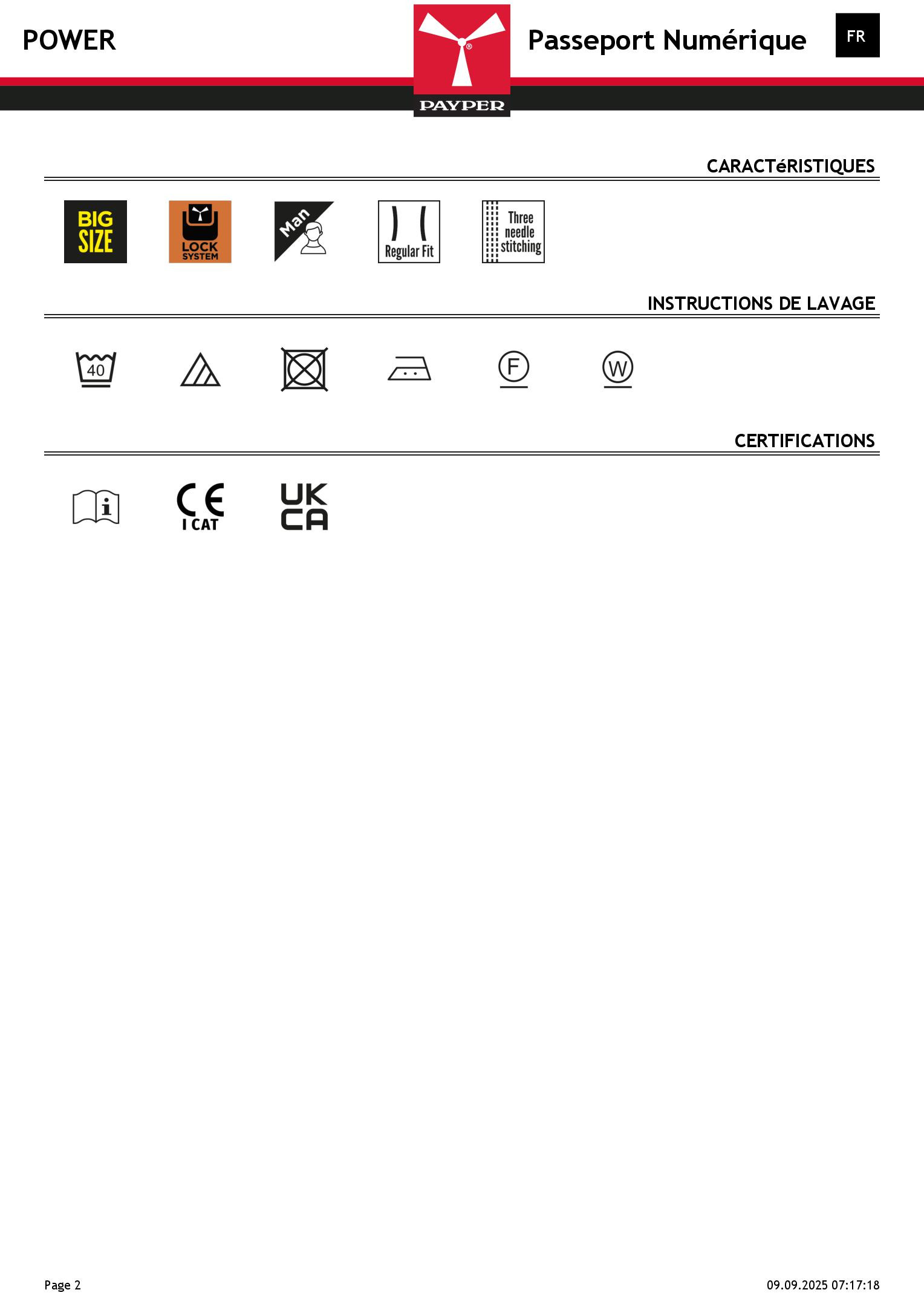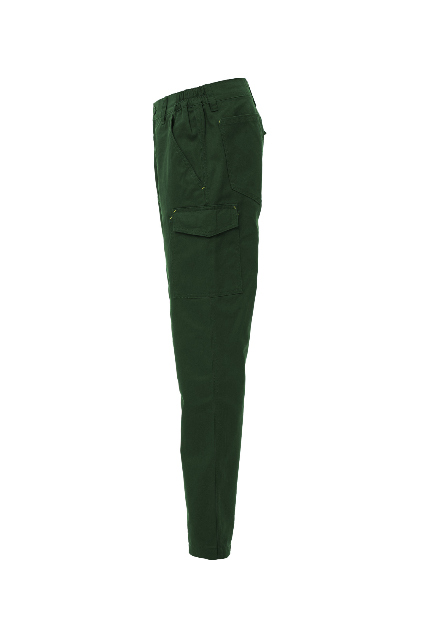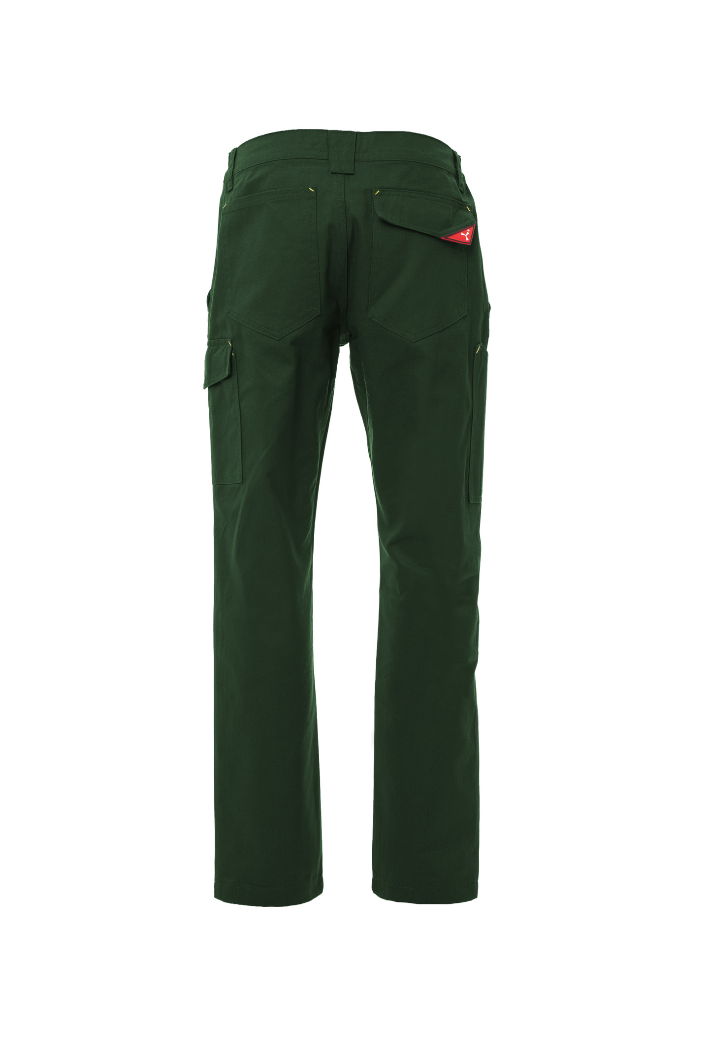 Pantalon avec passants et élastique à la taille, fermeture par zip et bouton. Deux poches de coupe classique sur le devant, petite poche porte-monnaie, porte-mètre latéral côté droit, poche latérale côté gauche avec rabat de fermeture LOCK SYSTEM, deux poches arrière dont une avec rabat et velcro. Coutures triple piqûre.
