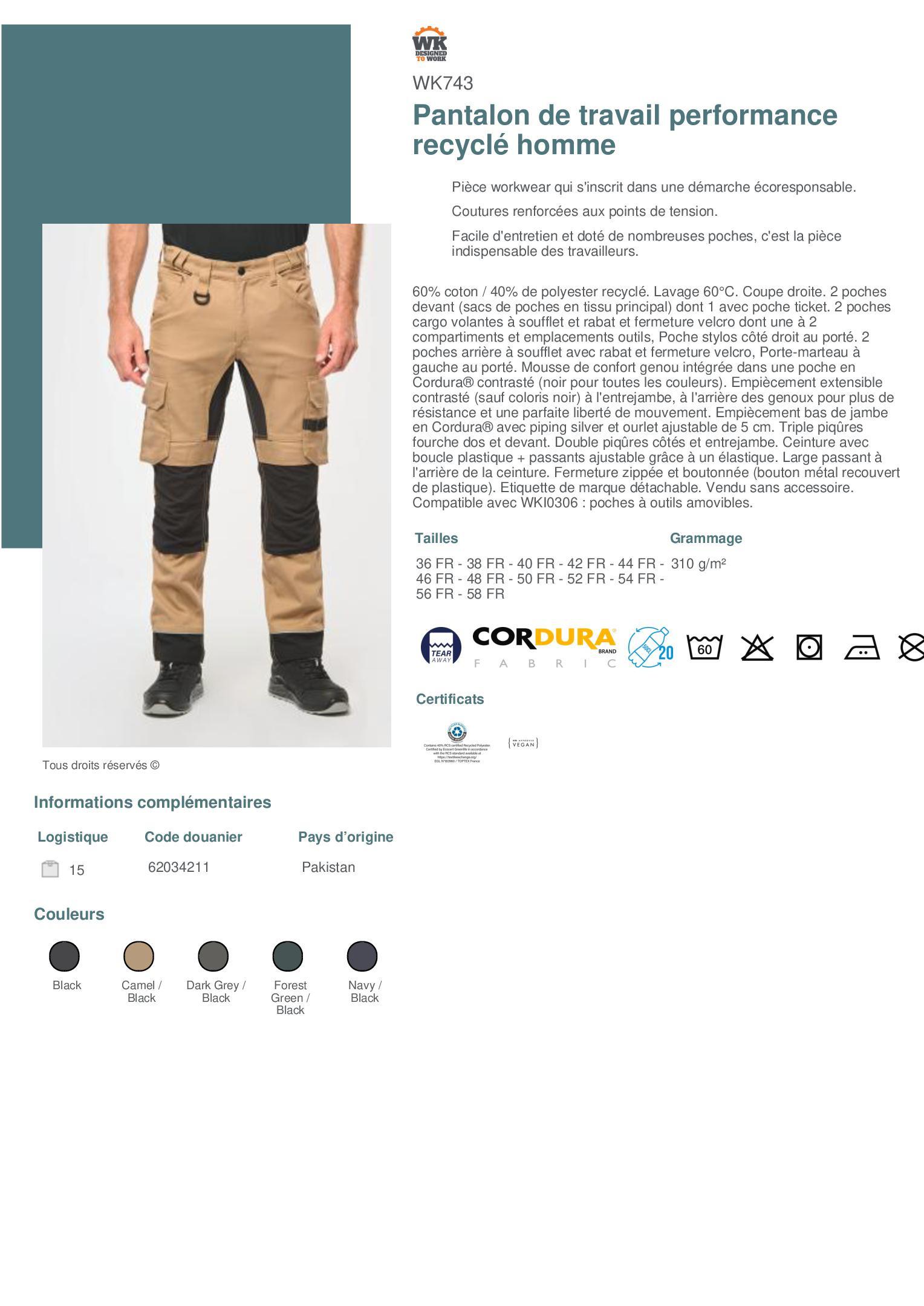 60% coton / 40% de polyester recyclé. Lavage 60°C. Coupe droite. 2 poches devant (sacs de poches en tissu principal) dont 1 avec poche ticket. 2 poches cargo volantes à soufflet et rabat et fermeture velcro dont une à 2 compartiments et emplacements outils, Poche stylos côté droit au porté. 2 poches arrière à soufflet avec rabat et fermeture velcro, Porte-marteau à gauche au porté. Mousse de confort genou intégrée dans une poche en Cordura® contrasté (noir pour toutes les couleurs). Empiècement extensible contrasté (sauf coloris noir) à l'entrejambe, à l'arrière des genoux pour plus de résistance et une parfaite liberté de mouvement. Empiècement bas de jambe en Cordura® avec piping silver et ourlet ajustable de 5 cm. Triple piqûres fourche dos et devant. Double piqûres côtés et entrejambe. Ceinture avec boucle plastique + passants ajustable grâce à un élastique. Large passant à l'arrière de la ceinture. Fermeture zippée et boutonnée (bouton métal recouvert de plastique). Etiquette de marque détachable. Vendu sans accessoire. Compatible avec WKI0306 : poches à outils amovibles.