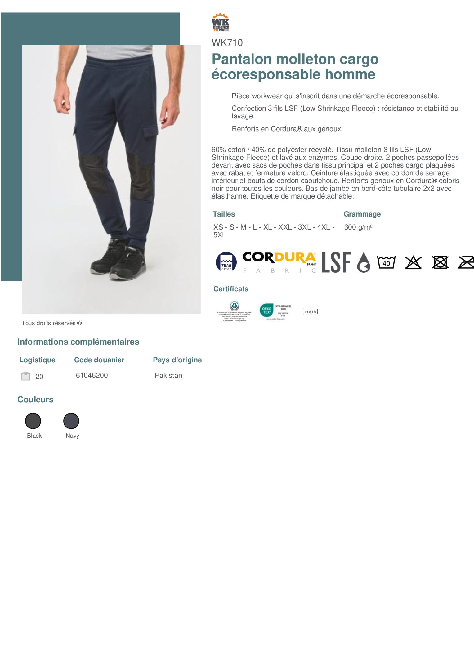 60% coton / 40% de polyester recyclé. Tissu molleton 3 fils LSF (Low Shrinkage Fleece) et lavé aux enzymes. Coupe droite. 2 poches passepoilées devant avec sacs de poches dans tissu principal et 2 poches cargo plaquées avec rabat et fermeture velcro. Ceinture élastiquée avec cordon de serrage intérieur et bouts de cordon caoutchouc. Renforts genoux en Cordura® coloris noir pour toutes les couleurs. Bas de jambe en bord-côte tubulaire 2x2 avec élasthanne. Etiquette de marque détachable.