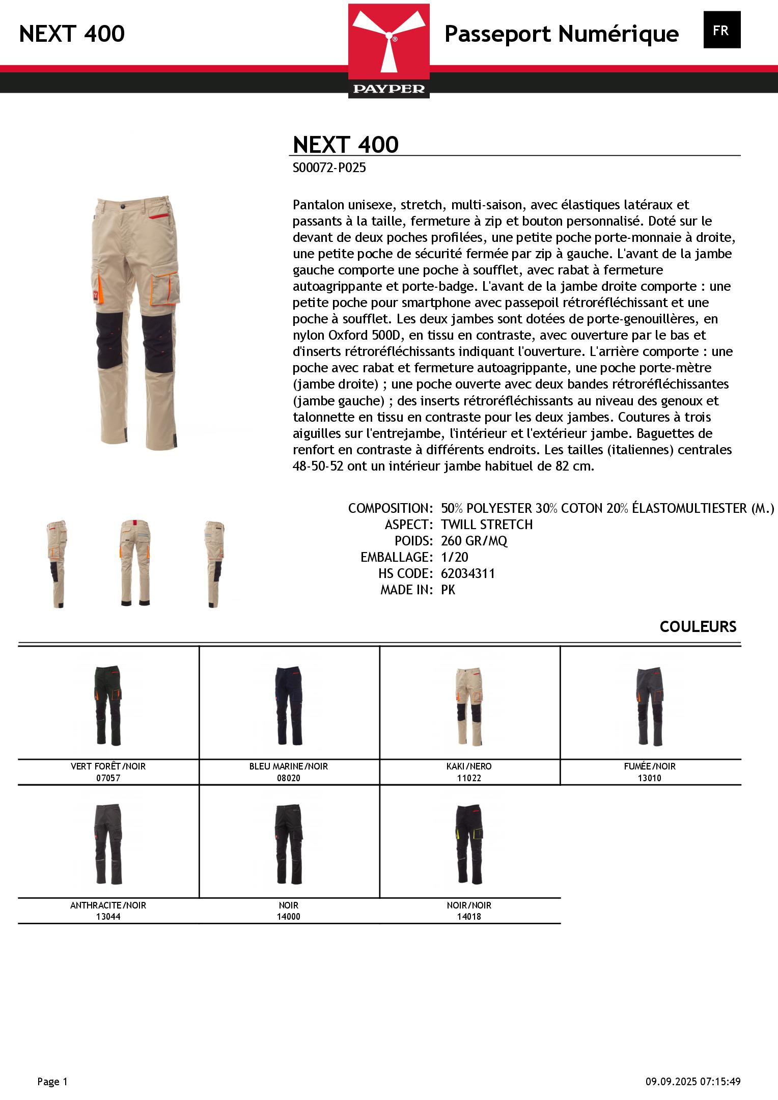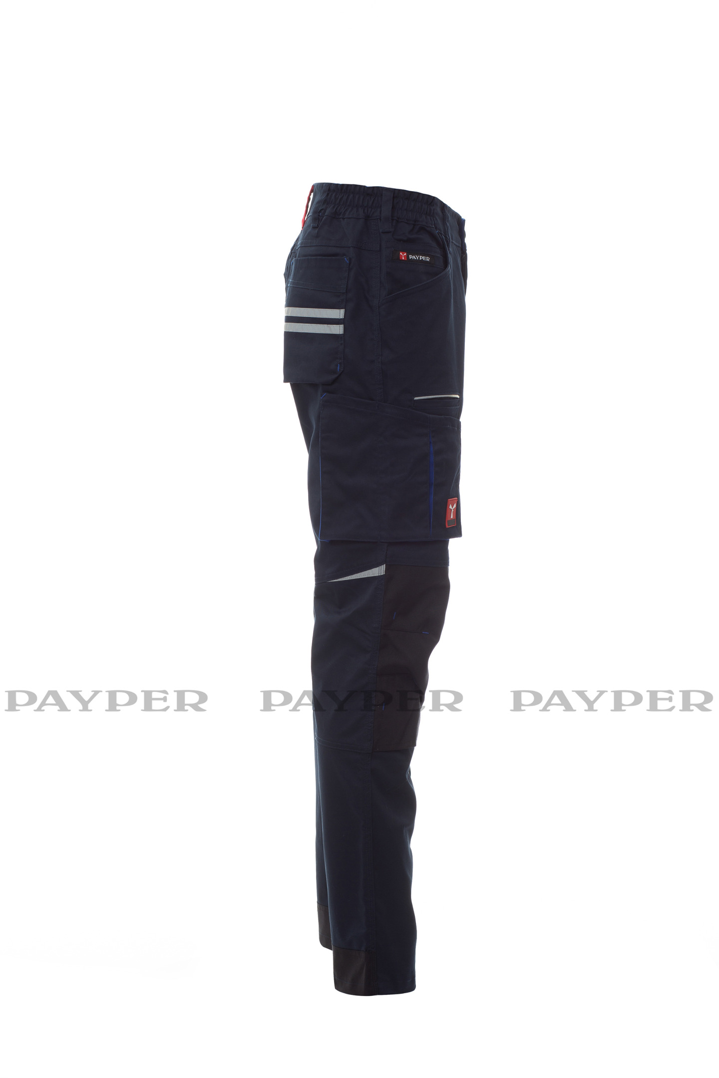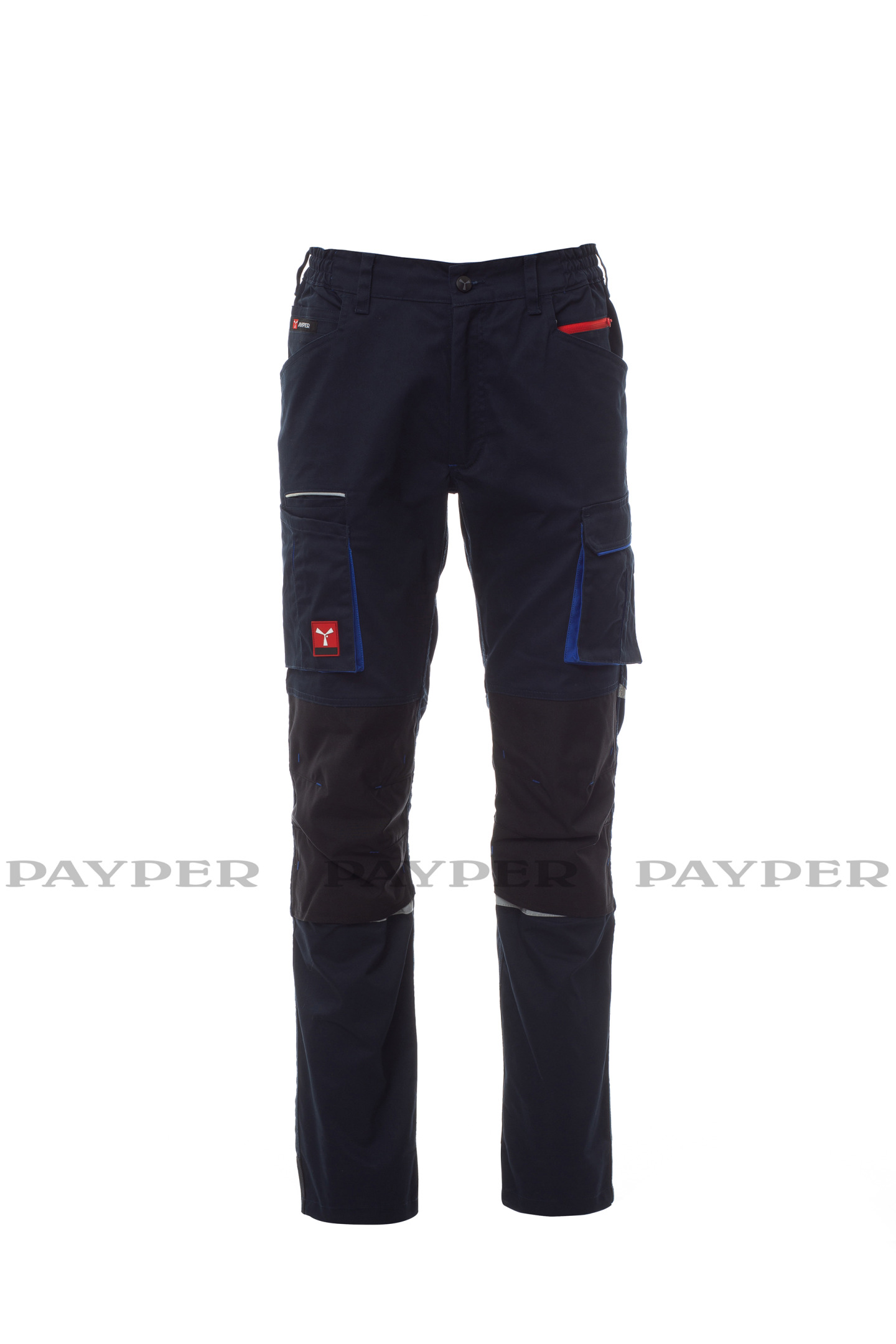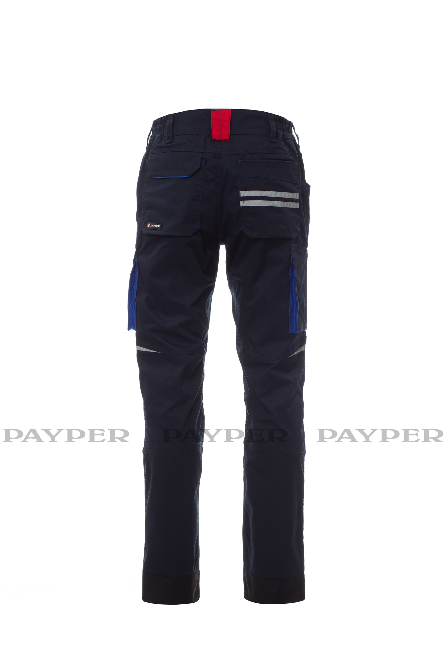 Pantalon unisexe, stretch, multi-saison, avec élastiques latéraux et passants à la taille, fermeture à zip et bouton personnalisé. Doté sur le devant de deux poches profilées, une petite poche porte-monnaie à droite, une petite poche de sécurité fermée par zip à gauche. L'avant de la jambe gauche comporte une poche à soufflet, avec rabat à fermeture autoagrippante et porte-badge. L'avant de la jambe droite comporte : une petite poche pour smartphone avec passepoil rétroréfléchissant et une poche à soufflet. Les deux jambes sont dotées de porte-genouillères, en nylon Oxford 500D, en tissu en contraste, avec ouverture par le bas et d'inserts rétroréfléchissants indiquant l'ouverture. L'arrière comporte : une poche avec rabat et fermeture autoagrippante, une poche porte-mètre (jambe droite) ; une poche ouverte avec deux bandes rétroréfléchissantes (jambe gauche) ; des inserts rétroréfléchissants au niveau des genoux et talonnette en tissu en contraste pour les deux jambes. Coutures à trois aiguilles sur l'entrejambe, l'intérieur et l'extérieur jambe. Baguettes de renfort en contraste à différents endroits. Les tailles (italiennes) centrales 48-50-52 ont un intérieur jambe habituel de 82 cm.