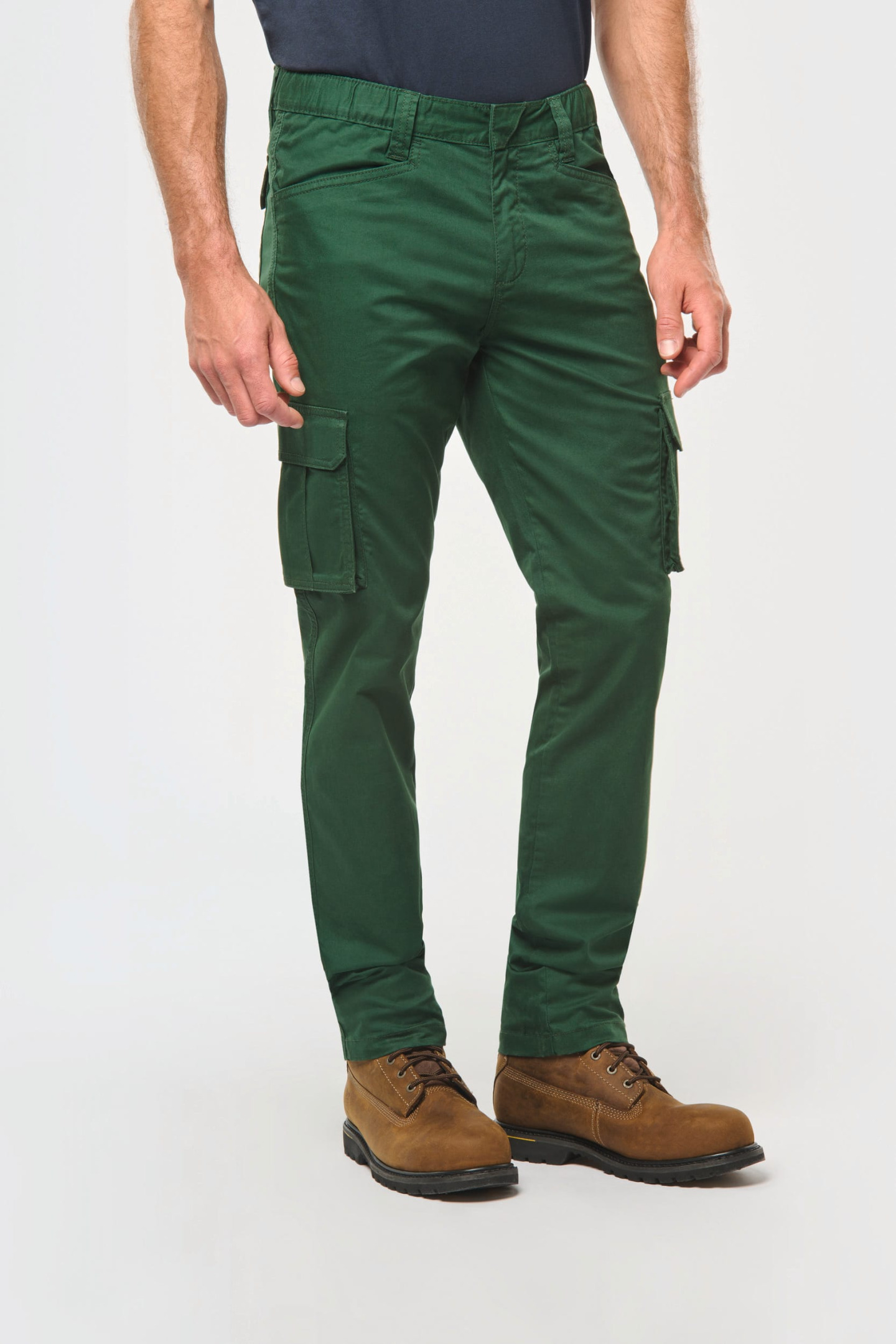 65% coton biologique / 33% polyester recyclé pré-consumer / 2% élasthanne. Tissu sergé. Lavage 60°C. Fermeture zippée et bouton métal caché. Ceinture élastiquée et passants pour plus de confort. Couture de l’entrejambe renforcée par une triple surpiqûre. 2 poches italiennes devant dont 1 avec poche monnaie dans sac de poche droit. 2 poches à soufflet côté et 2 poches arrière avec rabat et fermeture par bande auto-agrippante. Lien d'accrochage outils fixé sur poche arrière gauche. Lien d'accrochage ceinture intérieure. Couture de renfort sur poches pour plus de solidité. Finition double aiguille.