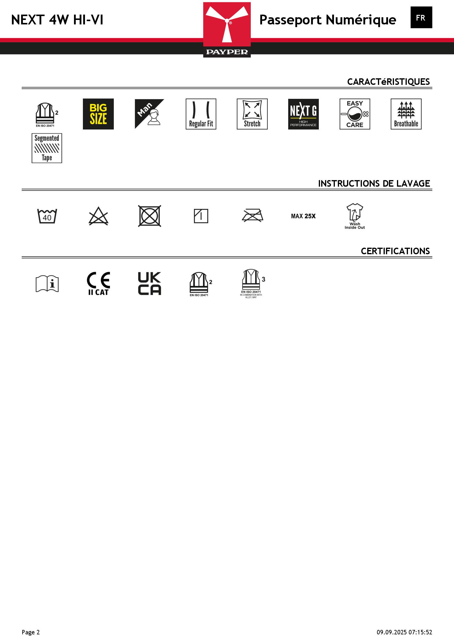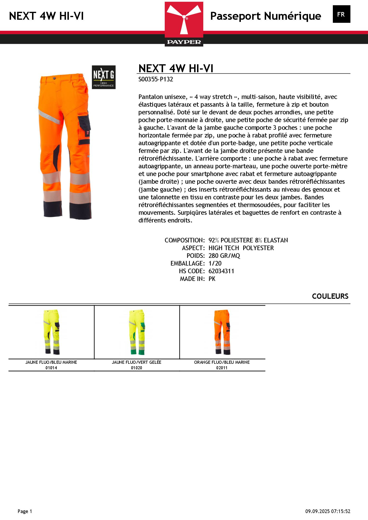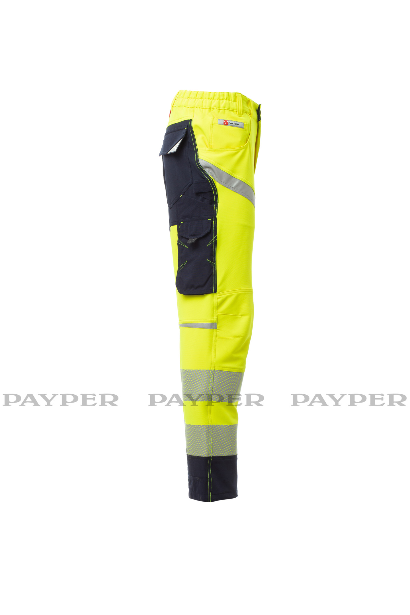 Pantalon unisexe, « 4 way stretch », multi-saison, haute visibilité, avec élastiques latéraux et passants à la taille, fermeture à zip et bouton personnalisé. Doté sur le devant de deux poches arrondies, une petite poche porte-monnaie à droite, une petite poche de sécurité fermée par zip à gauche. L'avant de la jambe gauche comporte 3 poches : une poche horizontale fermée par zip, une poche à rabat profilé avec fermeture autoagrippante et dotée d'un porte-badge, une petite poche verticale fermée par zip. L'avant de la jambe droite présente une bande rétroréfléchissante. L'arrière comporte : une poche à rabat avec fermeture autoagrippante, un anneau porte-marteau, une poche ouverte porte-mètre et une poche pour smartphone avec rabat et fermeture autoagrippante (jambe droite) ; une poche ouverte avec deux bandes rétroréfléchissantes (jambe gauche) ; des inserts rétroréfléchissants au niveau des genoux et une talonnette en tissu en contraste pour les deux jambes. Bandes rétroréfléchissantes segmentées et thermosoudées, pour faciliter les mouvements. Surpiqûres latérales et baguettes de renfort en contraste à différents endroits.
