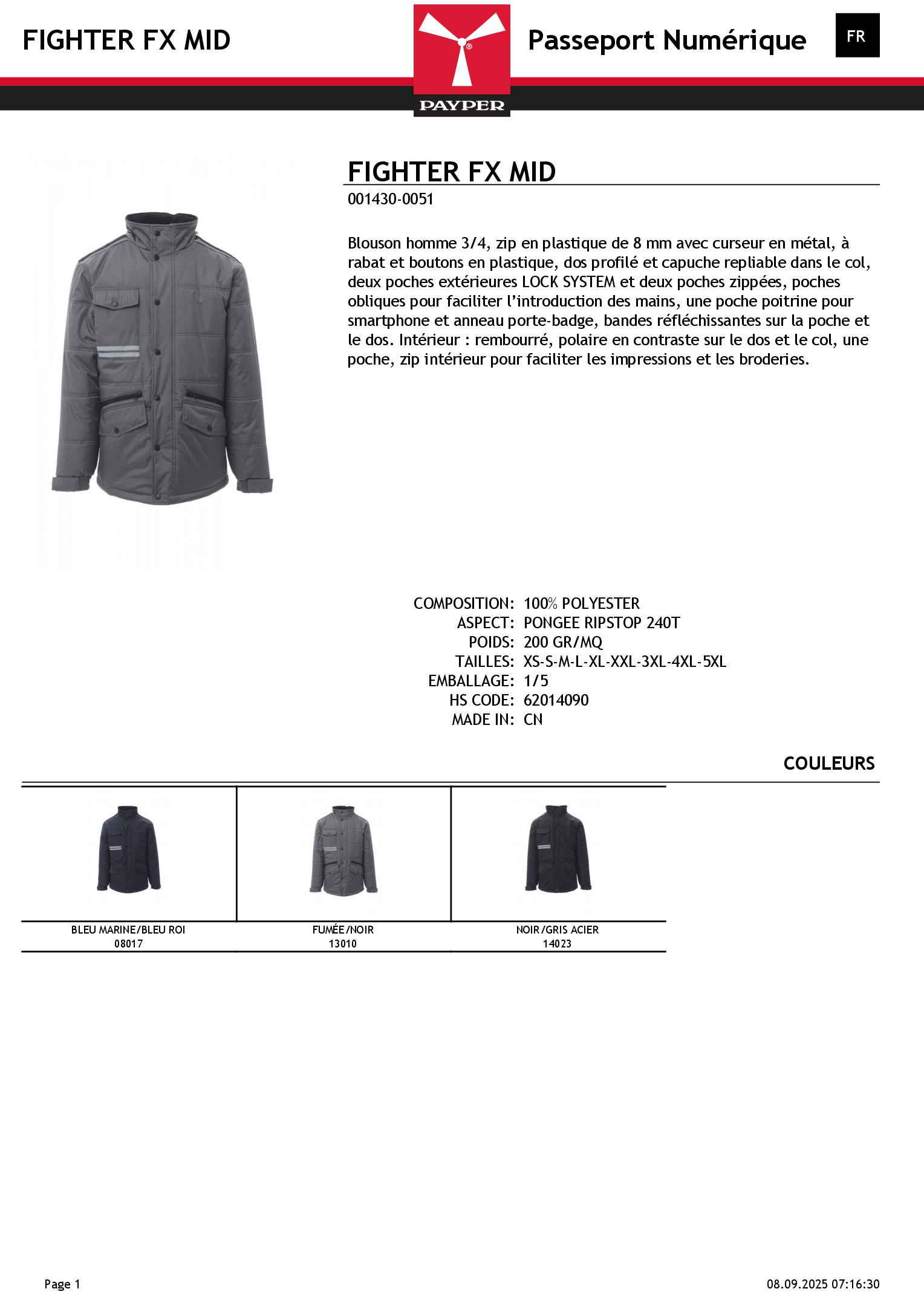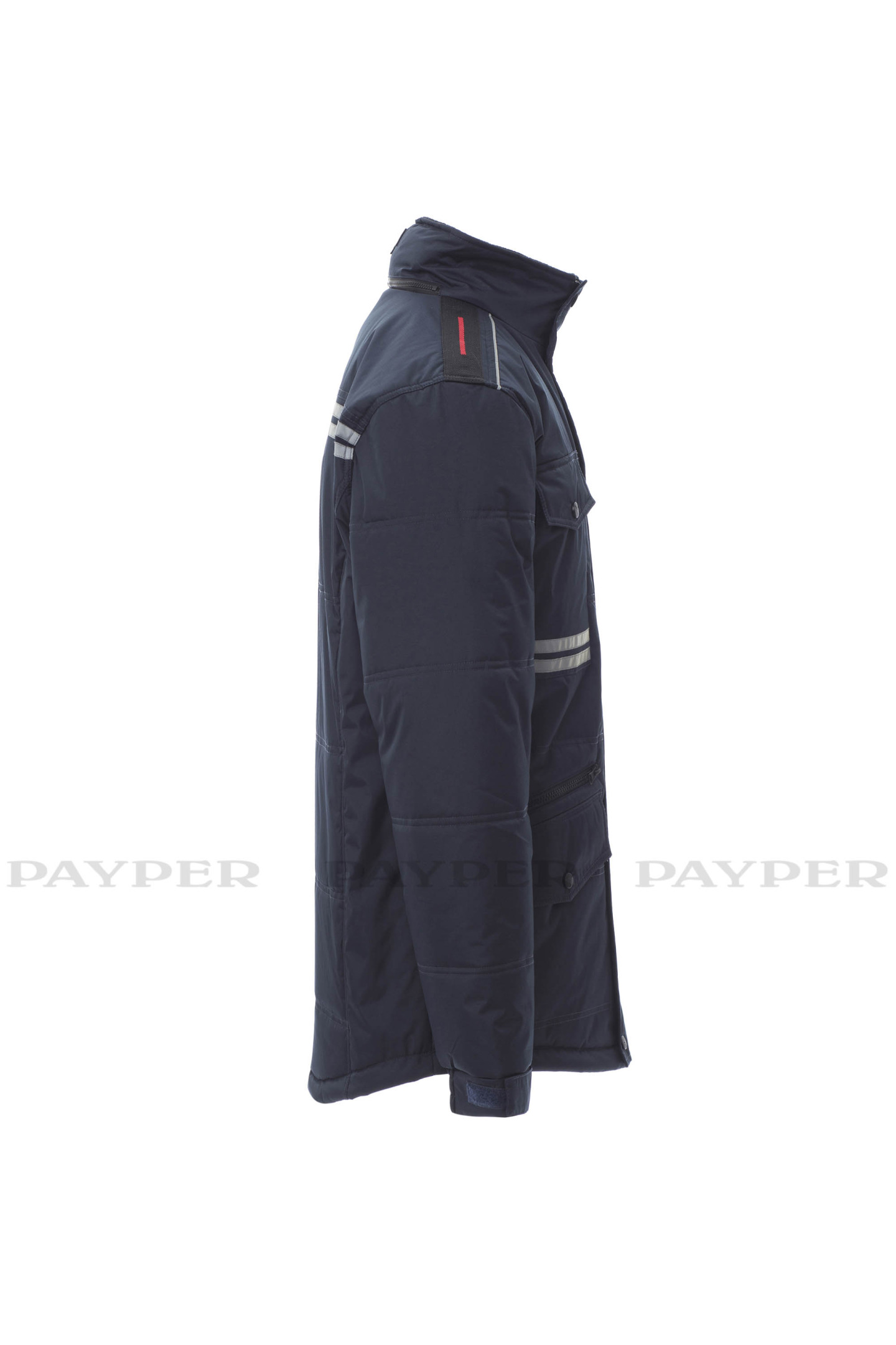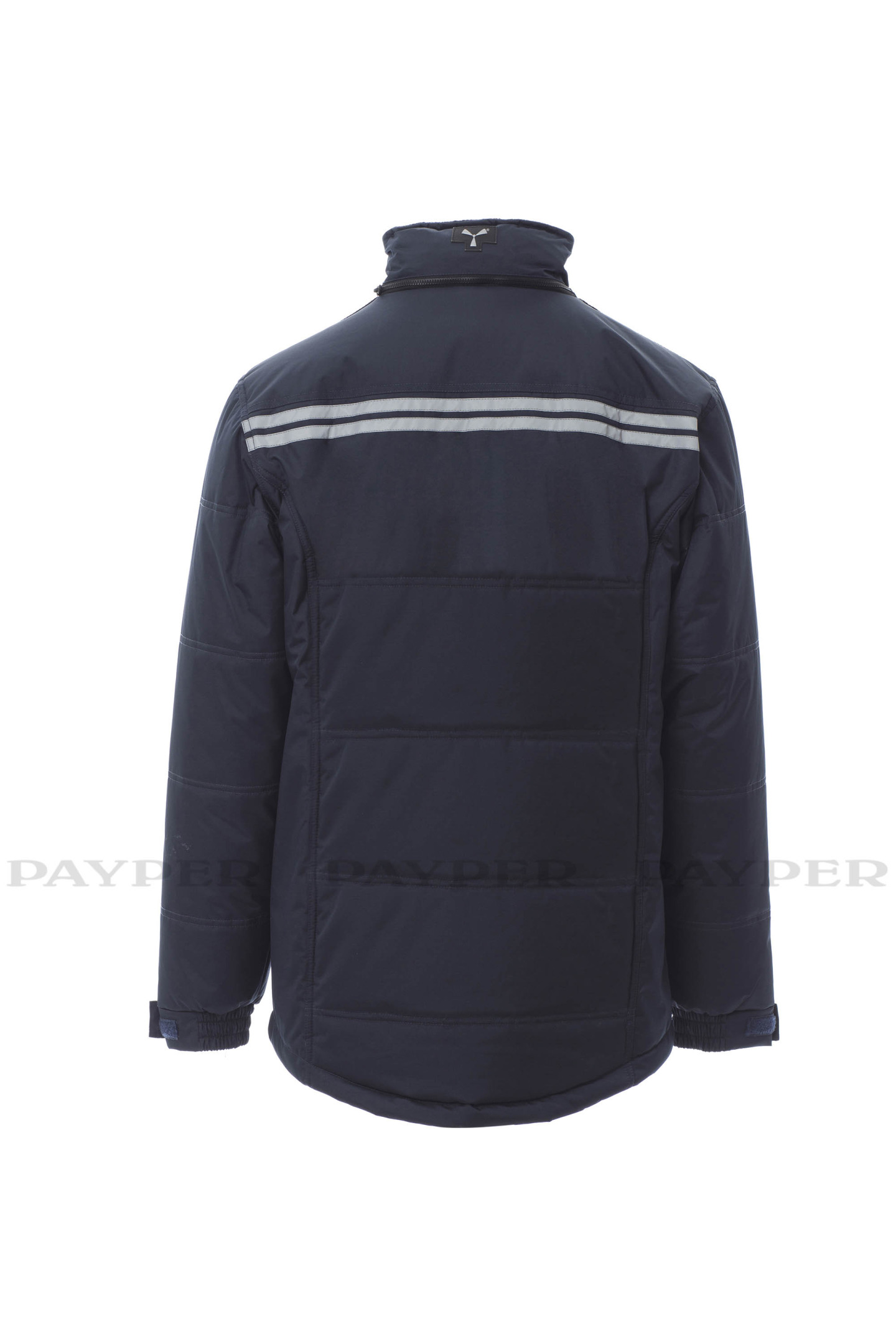 Blouson homme 3/4, zip en plastique de 8 mm avec curseur en métal, à rabat et boutons en plastique, dos profilé et capuche repliable dans le col, deux poches extérieures LOCK SYSTEM et deux poches zippées, poches obliques pour faciliter l’introduction des mains, une poche poitrine pour smartphone et anneau porte-badge, bandes réfléchissantes sur la poche et le dos. Intérieur : rembourré, polaire en contraste sur le dos et le col, une poche, zip intérieur pour faciliter les impressions et les broderies.