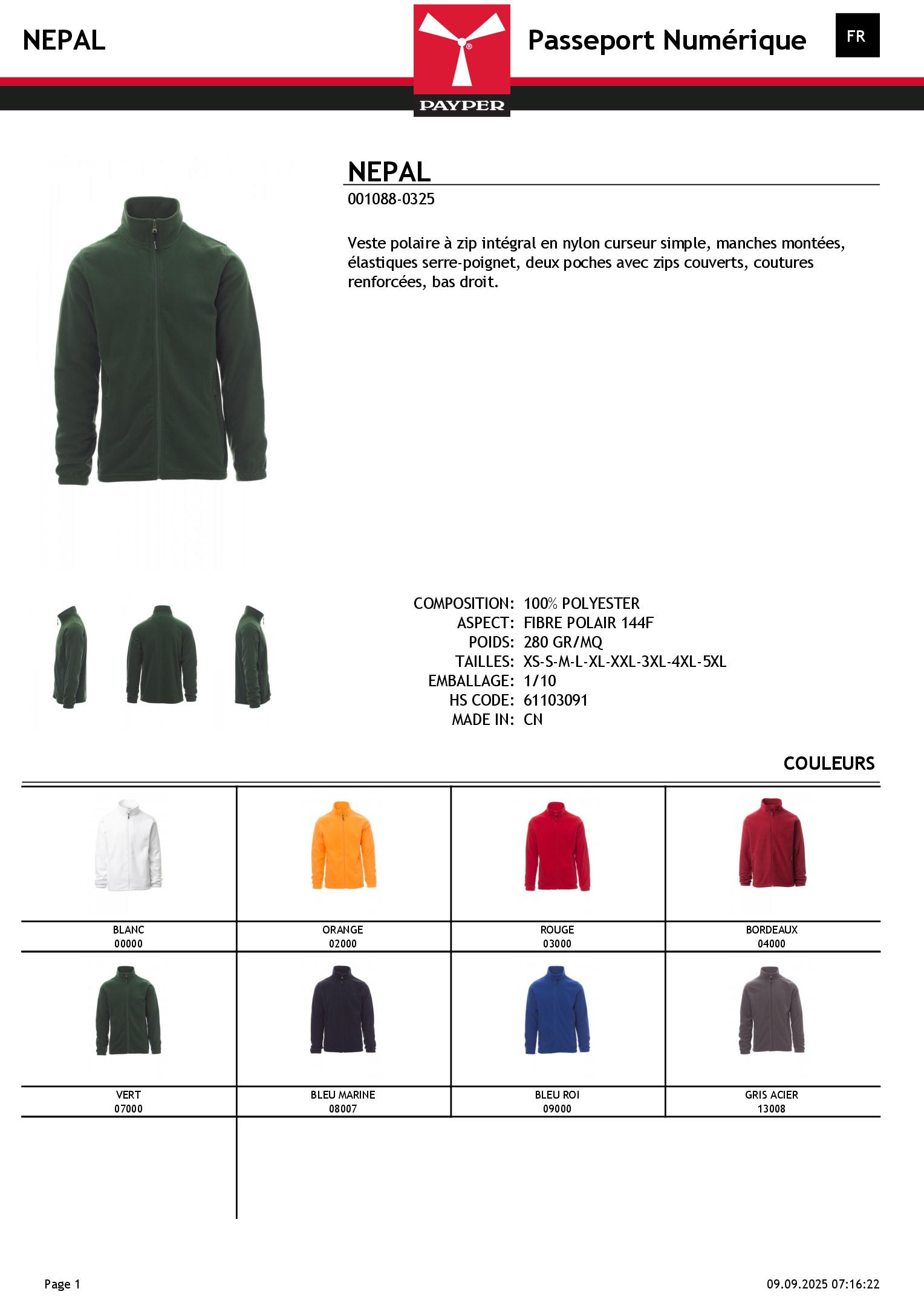 Couleur à définir (voir fiche technique)Tailles à définir (voir fiche technique)Marquage textile