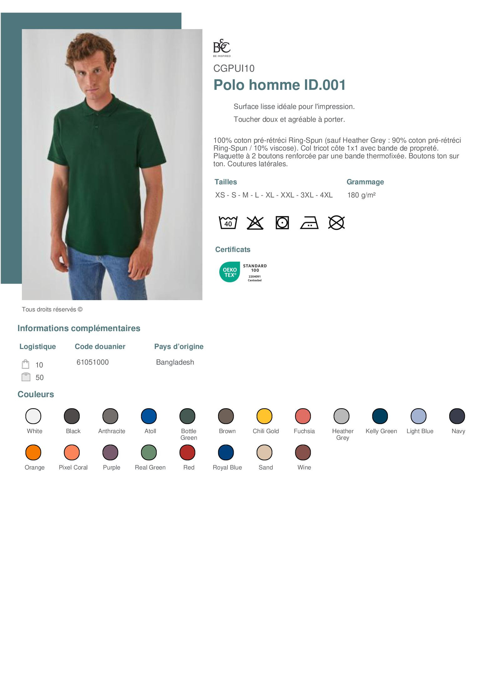 100% coton pré-rétréci Ring-Spun (sauf Heather Grey : 90% coton pré-rétréci Ring-Spun / 10% viscose). Col tricot côte 1x1 avec bande de propreté. Plaquette à 2 boutons renforcée par une bande thermofixée. Boutons ton sur ton. Coutures latérales.