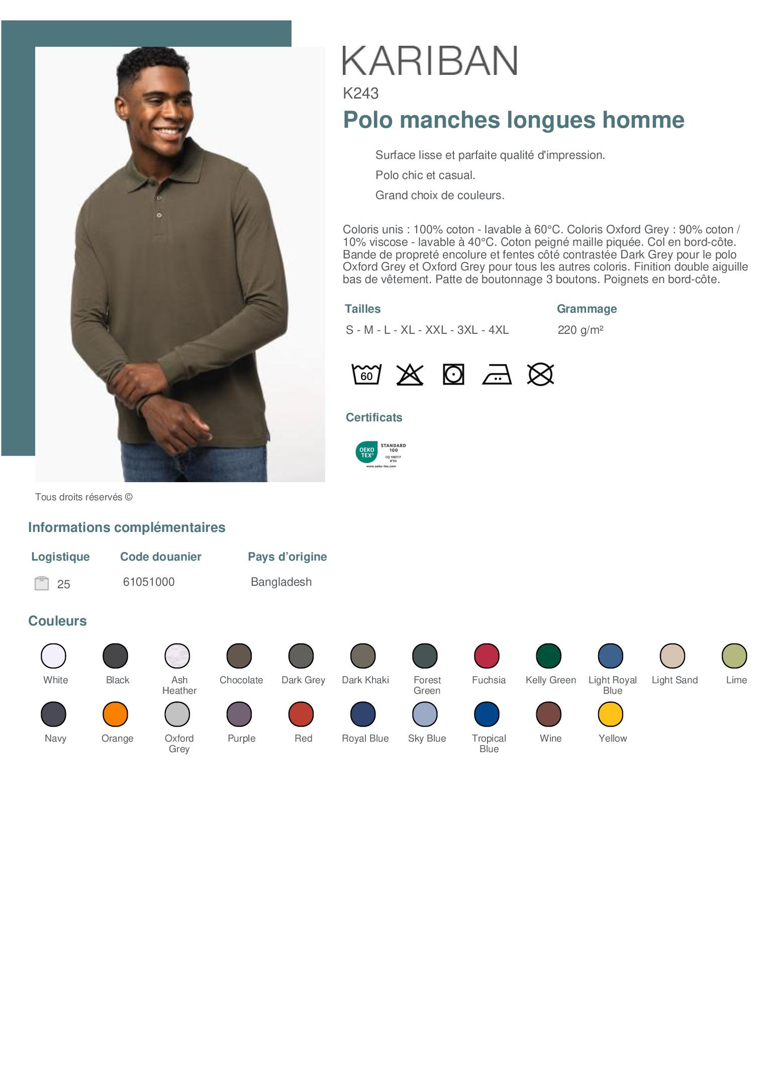Coloris unis : 100% coton - lavable à 60°C. Coloris Oxford Grey : 90% coton / 10% viscose - lavable à 40°C. Coton peigné maille piquée. Col en bord-côte. Bande de propreté encolure et fentes côté contrastée Dark Grey pour le polo Oxford Grey et Oxford Grey pour tous les autres coloris. Finition double aiguille bas de vêtement. Patte de boutonnage 3 boutons. Poignets en bord-côte.