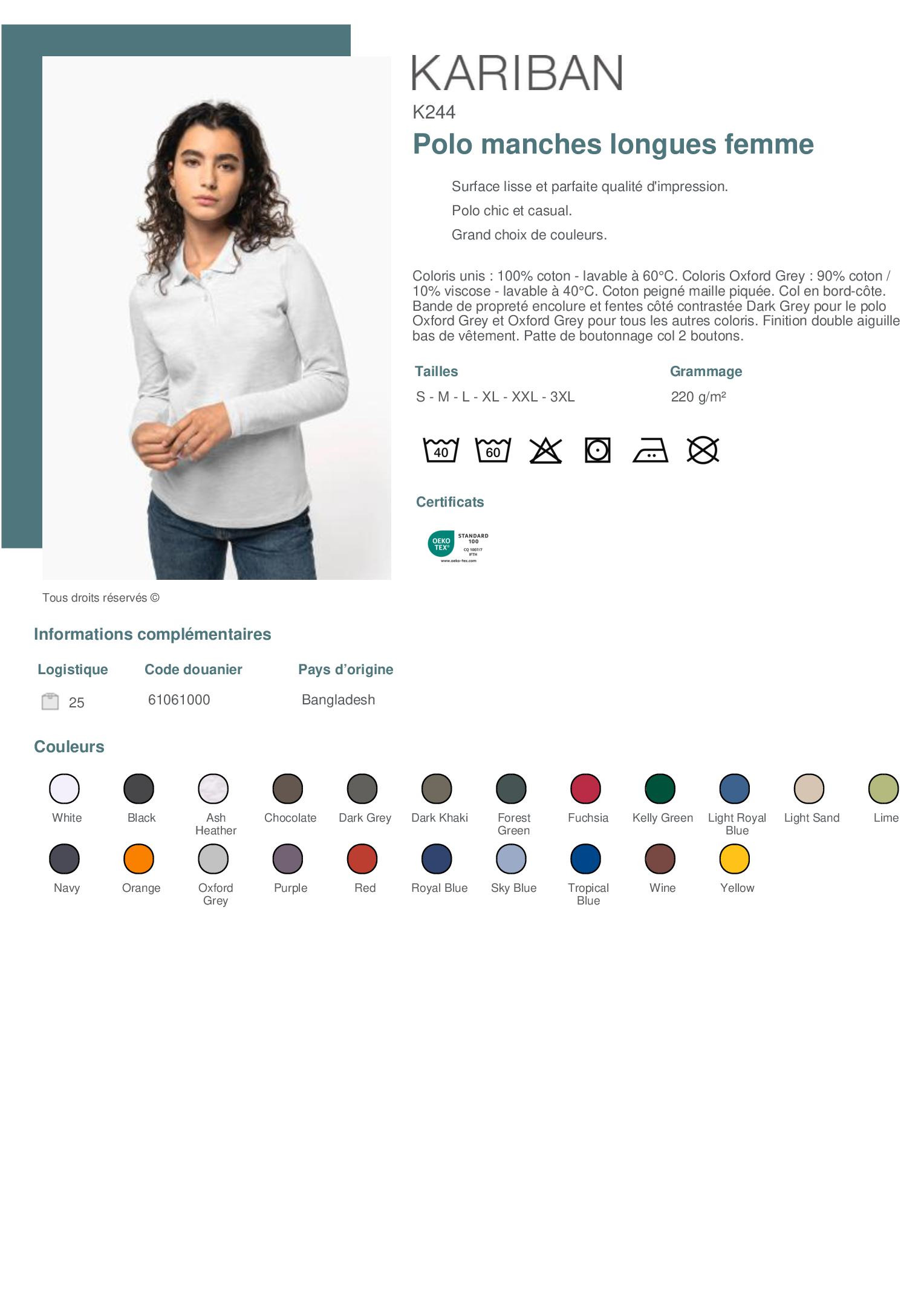Coloris unis : 100% coton - lavable à 60°C. Coloris Oxford Grey : 90% coton / 10% viscose - lavable à 40°C. Coton peigné maille piquée. Col en bord-côte. Bande de propreté encolure et fentes côté contrastée Dark Grey pour le polo Oxford Grey et Oxford Grey pour tous les autres coloris. Finition double aiguille bas de vêtement. Patte de boutonnage col 2 boutons.
