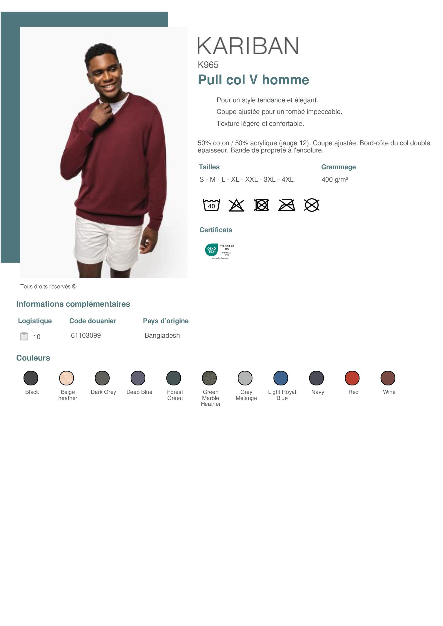 50% coton / 50% acrylique (jauge 12). Coupe ajustée. Bord-côtes du col double épaisseur. Bande de propreté à l'encolure.