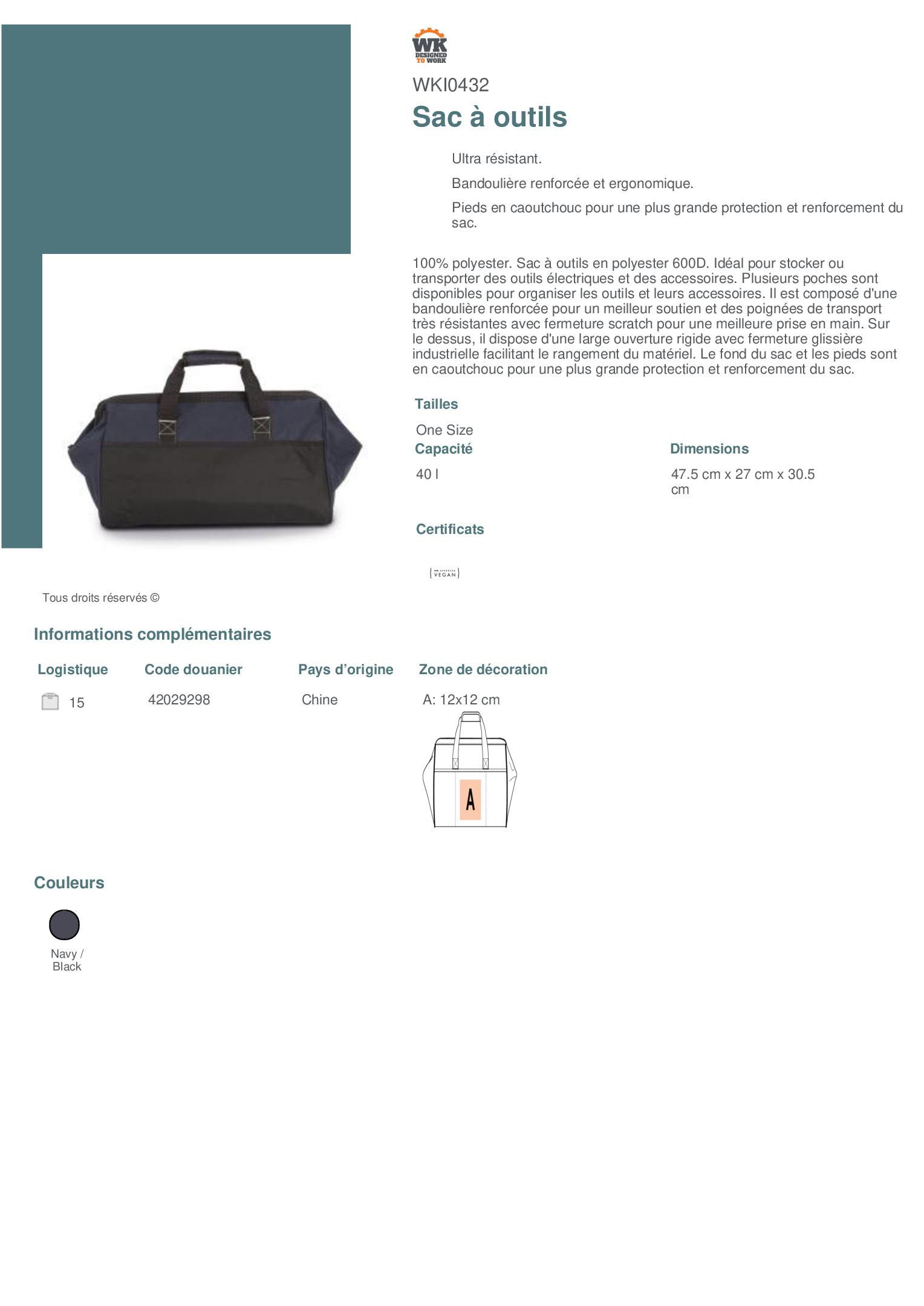 100% polyester. Sac à outils en polyester 600D. Idéal pour stocker ou transporter des outils électriques et des accessoires. Plusieurs poches sont disponibles pour organiser les outils et leurs accessoires. Il est composé d'une bandoulière renforcée pour un meilleur soutien et des poignées de transport très résistantes avec fermeture scratch pour une meilleure prise en main. Sur le dessus, il dispose d'une large ouverture rigide avec fermeture glissière industrielle facilitant le rangement du matériel. Le fond du sac et les pieds sont en caoutchouc pour une plus grande protection et renforcement du sac.