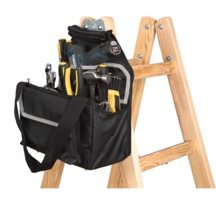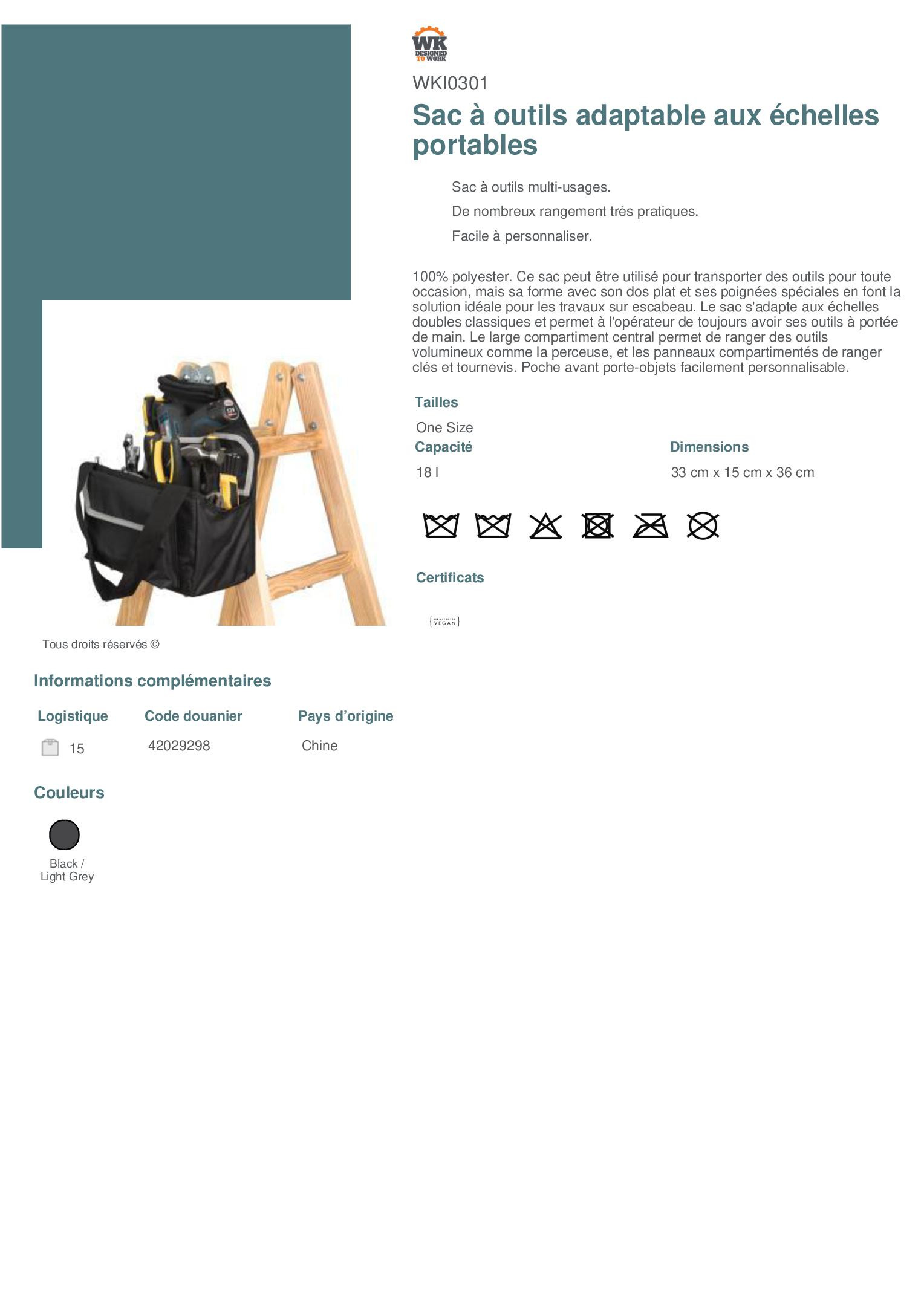 100% polyester. Ce sac peut être utilisé pour transporter des outils pour toute occasion, mais sa forme avec son dos plat et ses poignées spéciales en font la solution idéale pour les travaux sur escabeau. Le sac s’adapte aux échelles doubles classiques et permet à l’opérateur de toujours avoir ses outils à portée de main. Le large compartiment central permet de ranger des outils volumineux comme la perceuse, et les panneaux compartimentés de ranger clés et tournevis. Poche avant porte-objets facilement personnalisable.