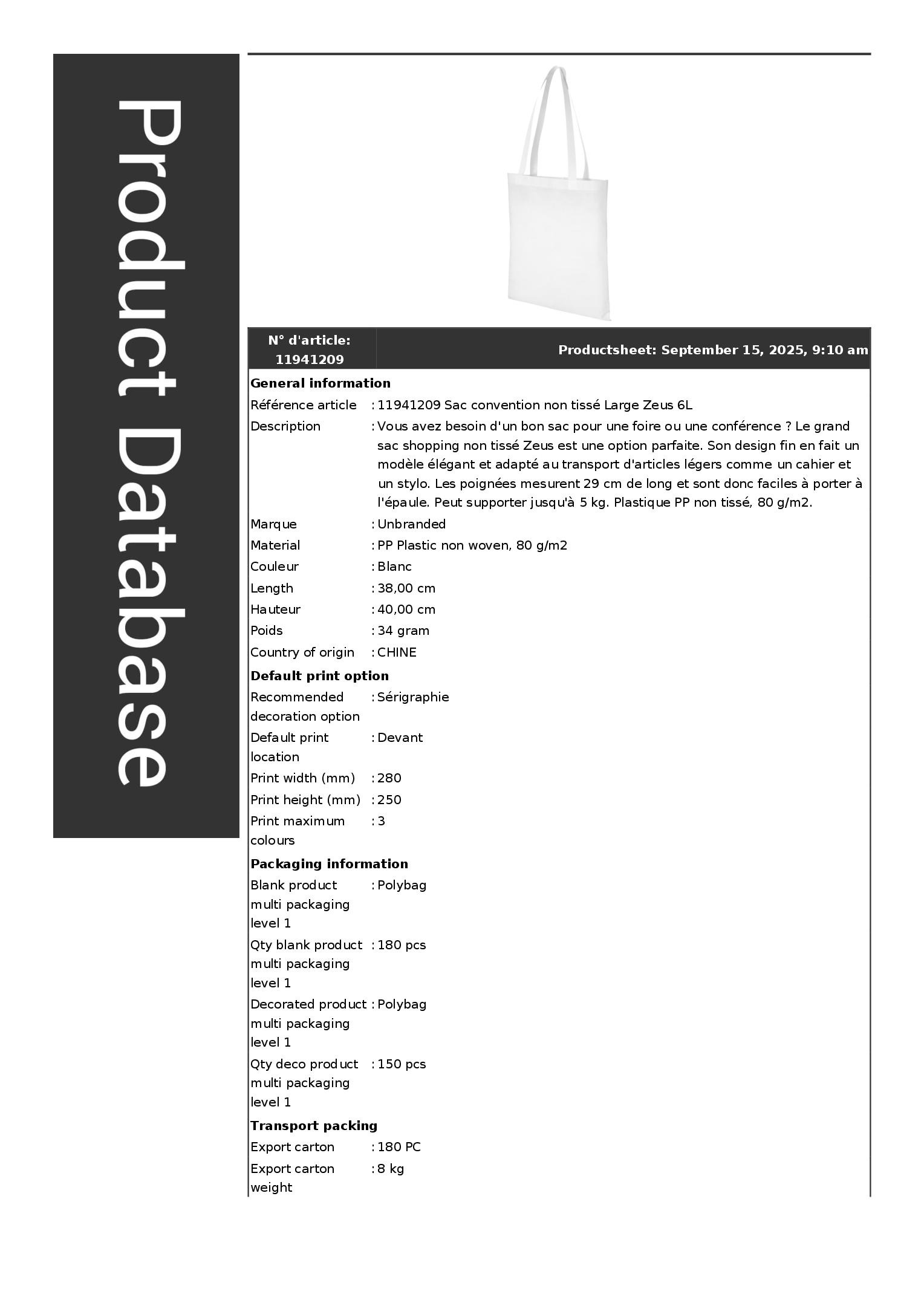 Vous avez besoin d'un bon sac pour une foire ou une conférence ? Le grand sac shopping non tissé Zeus est une option parfaite. Son design fin en fait un modèle élégant et adapté au transport d'articles légers comme un cahier et un stylo. Les poignées mesurent 29 cm de long et sont donc faciles à porter à l'épaule. Peut supporter jusqu'à 5 kg. Plastique PP non tissé, 80 g/m2.