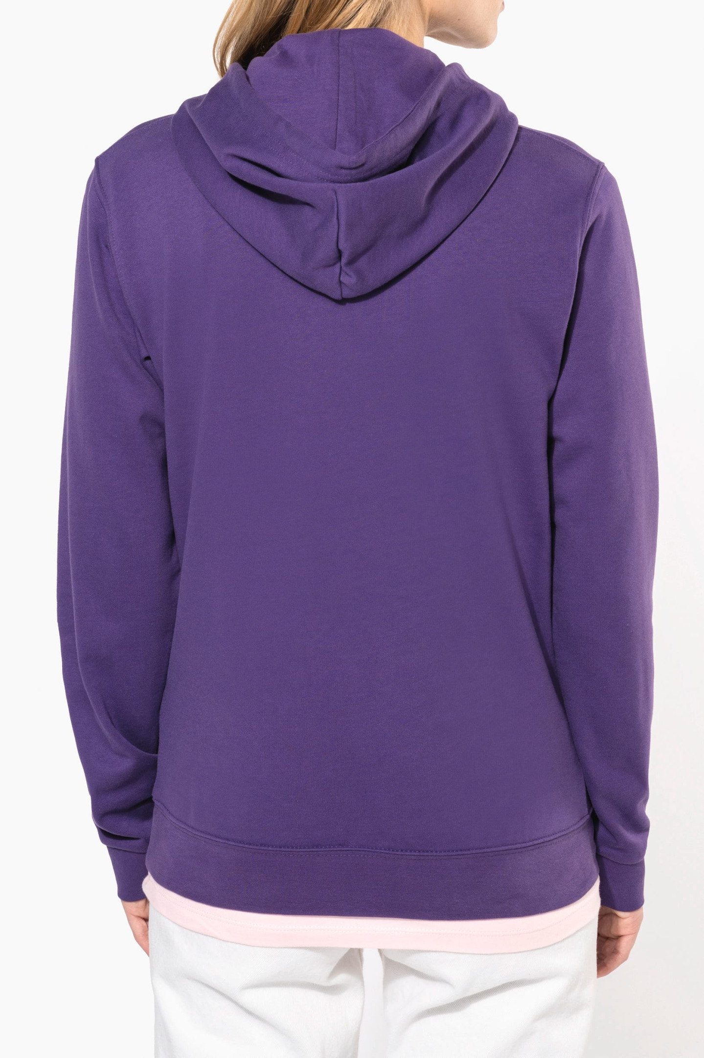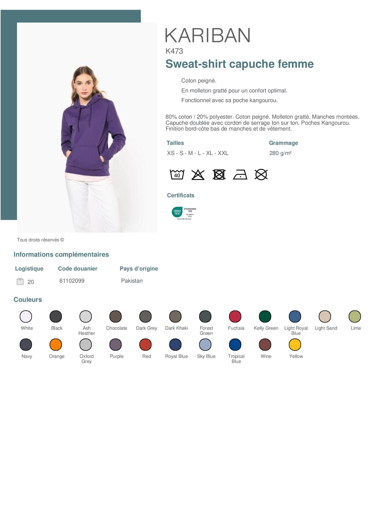 80% coton / 20% polyester. Coton peigné. Molleton gratté. Manches montées. Capuche doublée avec cordon de serrage ton sur ton. Poches Kangourou. Finition bord-côte bas de manches et de vêtement.