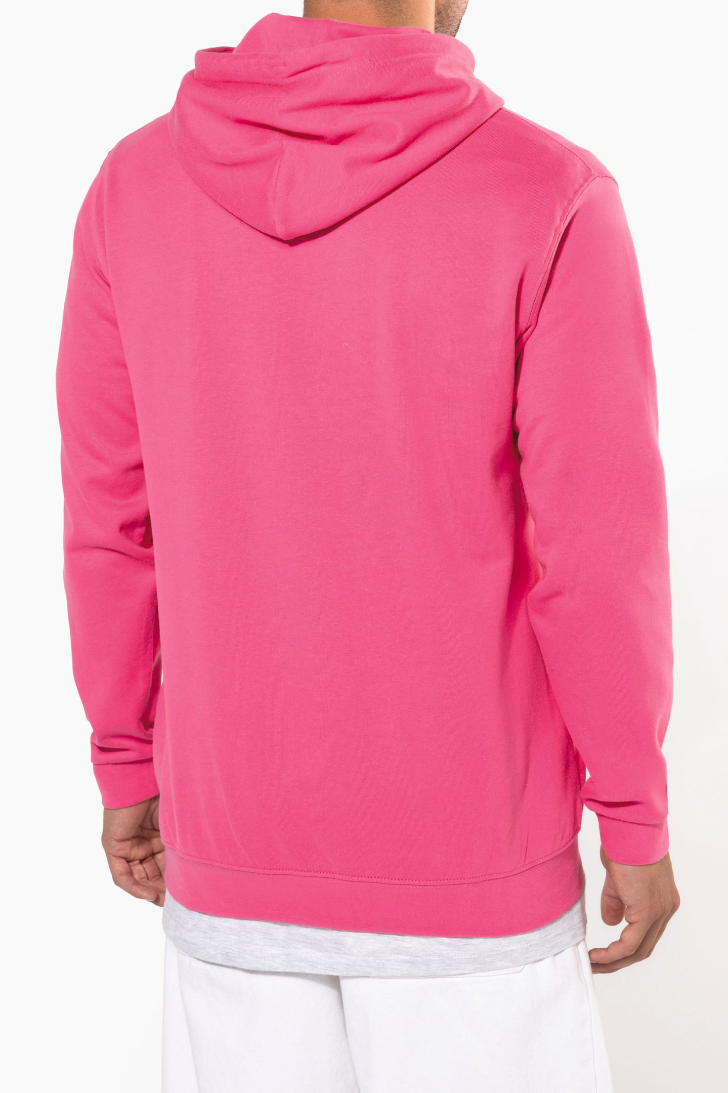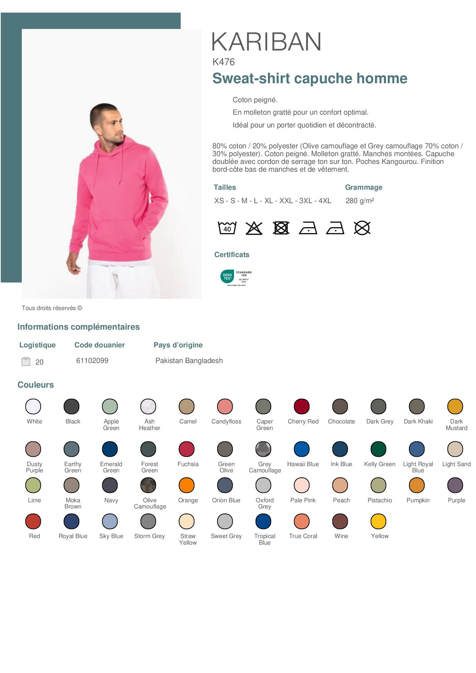 80% coton / 20% polyester (Olive camouflage et Grey camouflage 70% coton / 30% polyester). Coton peigné. Molleton gratté. Manches montées. Capuche doublée avec cordon de serrage ton sur ton. Poches Kangourou. Finition bord-côte bas de manches et de vêtement.