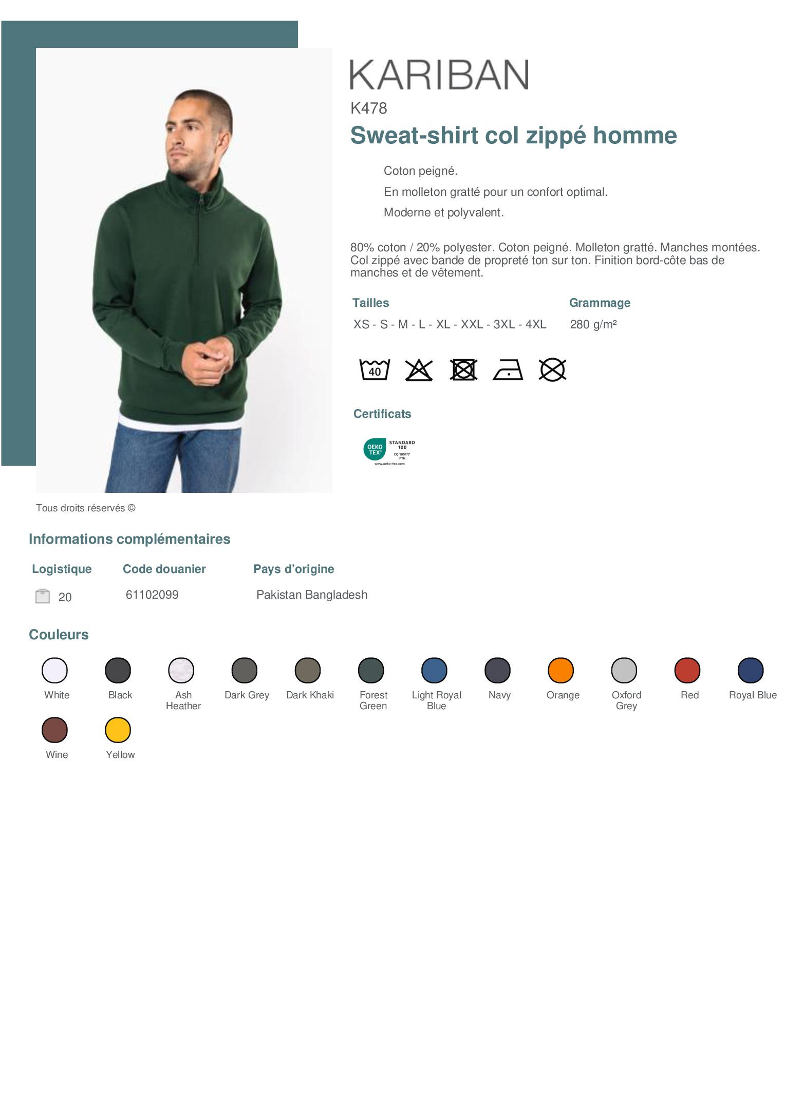 80% coton / 20% polyester. Coton peigné. Molleton gratté. Manches montées. Col zippé avec bande de propreté ton sur ton. Finition bord-côte bas de manches et de vêtement.