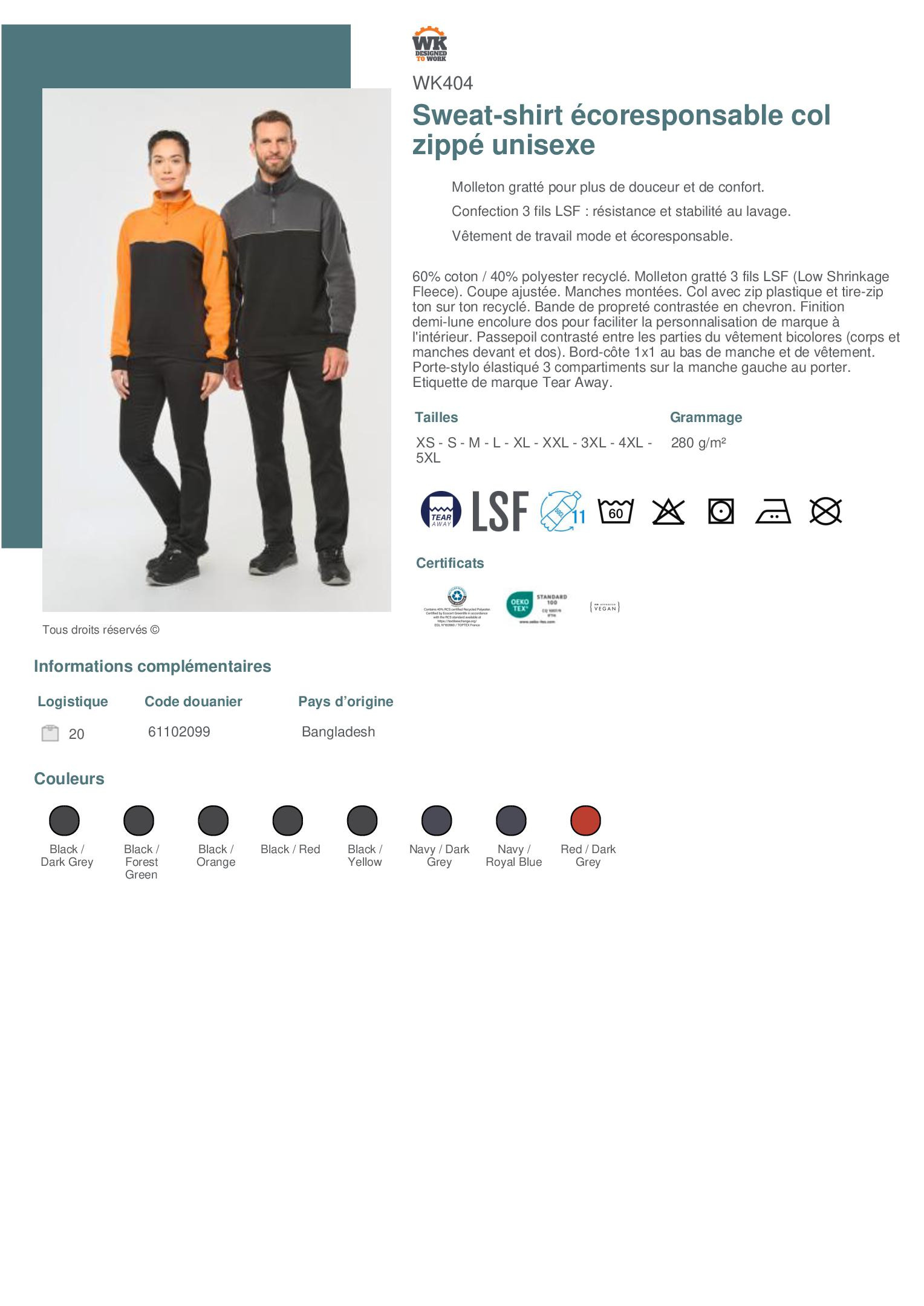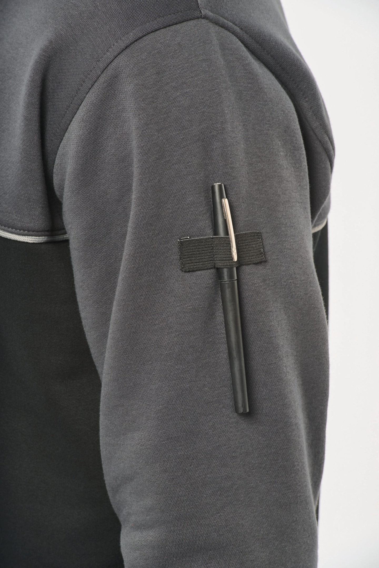 60% coton biologique / 40% polyester recyclé. Molleton gratté 3 fils LSF (Low Shrinkage Fleece). Coupe ajustée. Manches montées. Col avec zip plastique et tire-zip ton sur ton recyclé. Bande de propreté contrastée en chevron. Finition demi-lune encolure dos pour faciliter la personnalisation de marque à l'intérieur. Passepoil contrasté entre les parties du vêtement bicolores (corps et manches devant et dos). Bord-côte 1x1 au bas de manche et de vêtement. Porte-stylo élastiqué 3 compartiments sur la manche gauche au porter. Etiquette de marque Tear Away.