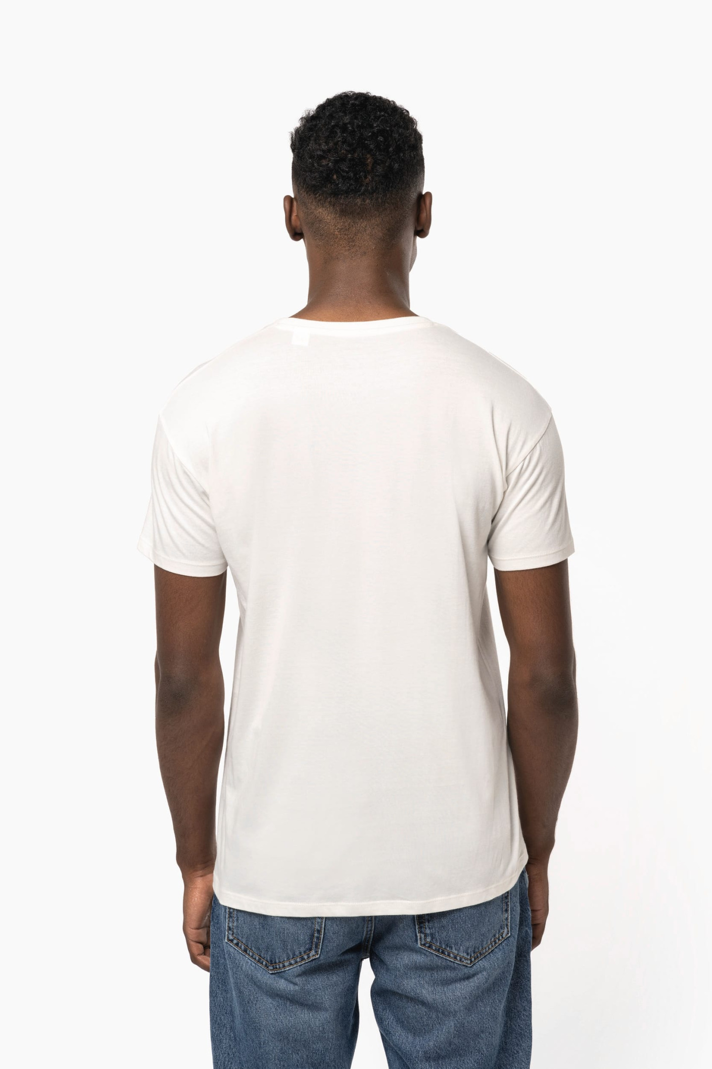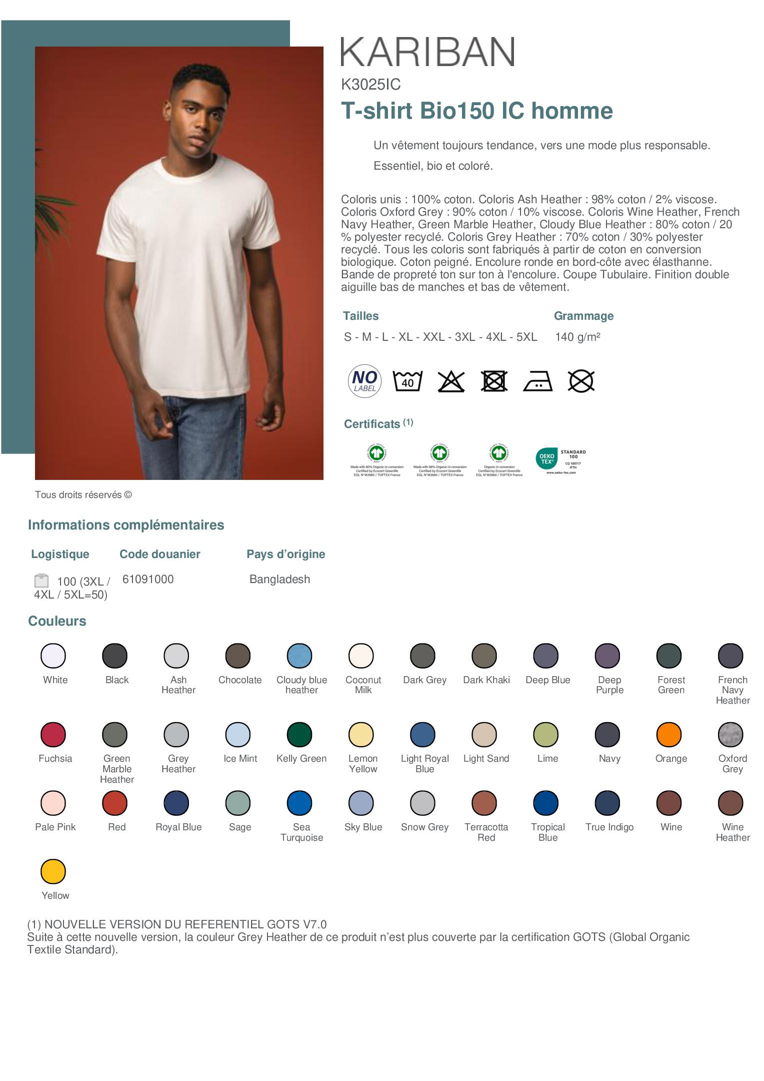 Coloris unis : 100% coton. Coloris Ash Heather : 98% coton / 2% viscose. Coloris Oxford Grey : 90% coton / 10% viscose. Coloris Wine Heather, French Navy Heather, Green Marble Heather, Cloudy Blue Heather : 80% coton / 20 % polyester recyclé. Coloris Grey Heather : 70% coton / 30% polyester recyclé. Tous les coloris sont fabriqués à partir de coton en conversion biologique. Coton peigné. Encolure ronde en bord-côte avec élasthanne. Bande de propreté ton sur ton à l'encolure. Coupe Tubulaire. Finition double aiguille bas de manches et bas de vêtement.
