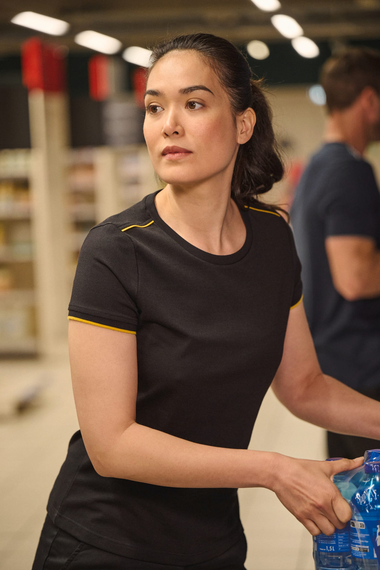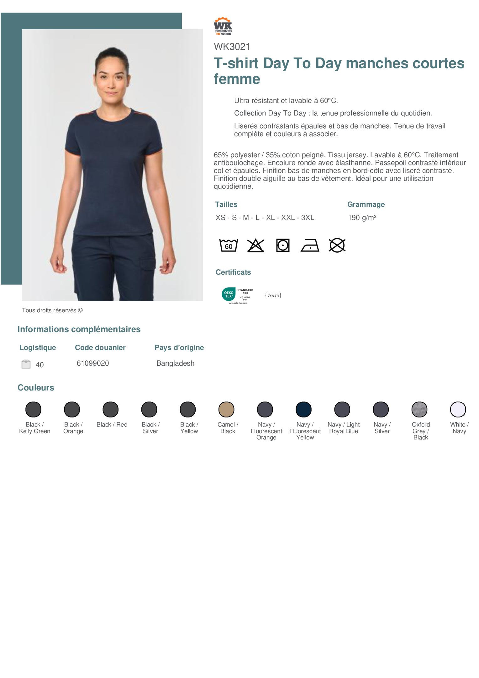 65% polyester / 35% coton peigné. Tissu jersey. Lavable à 60°C. Traitement anti boulochage. Encolure ronde avec élasthanne. Passepoil contrasté intérieur col et épaules. Finition bas de manches en bord-côtes avec liseré contrasté. Finition double aiguille au bas de vêtement. Idéal pour une utilisation quotidienne.
