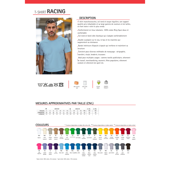 T-shirt manches courtes, col rond et coupe régulière, son rapport qualité-prix imbattable et sa large gamme de couleurs et de tailles, en font notre t-shirt le plus vendu.