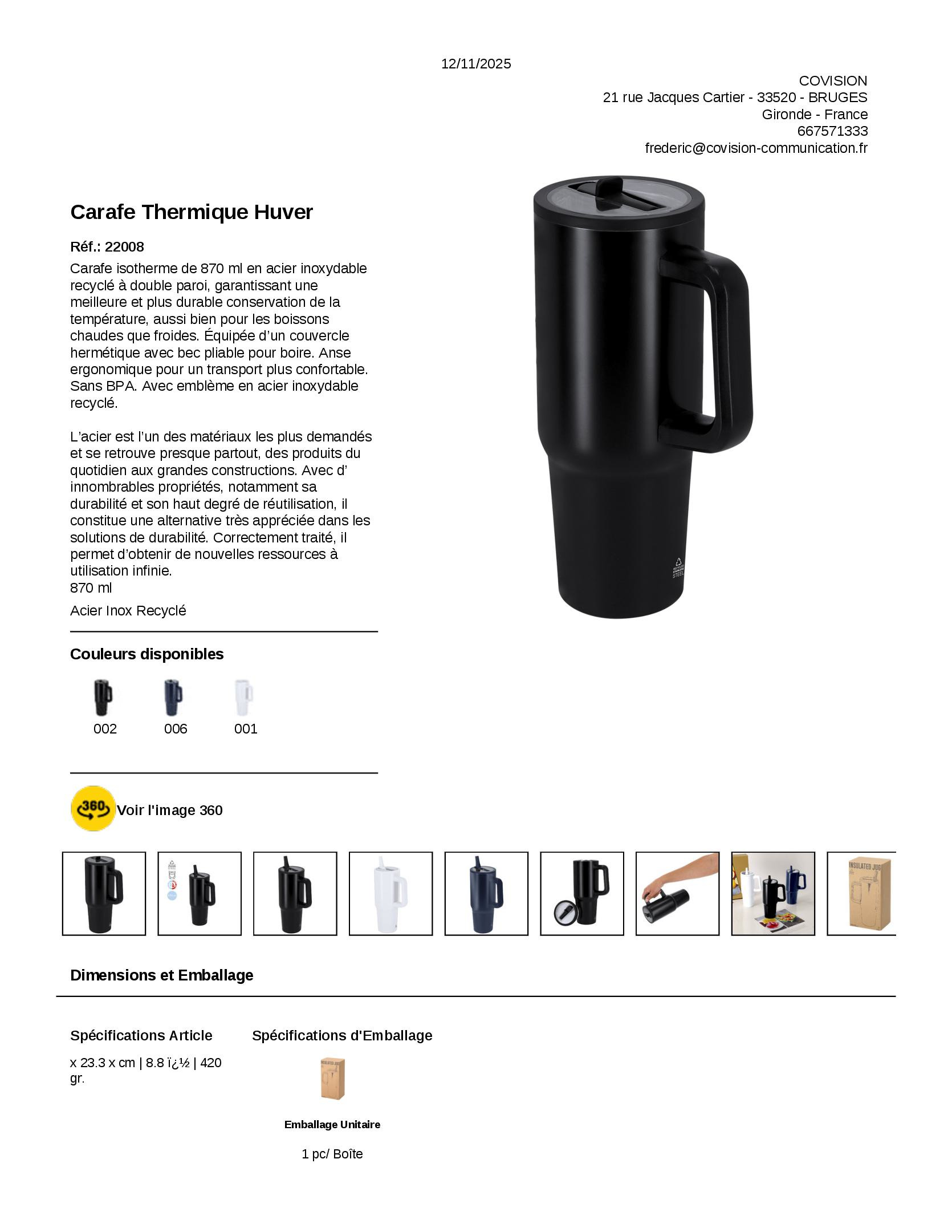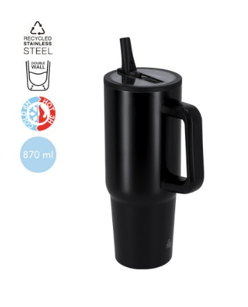 Carafe isotherme de 870 ml en acier inoxydable recyclé à double paroi, garantissant une meilleure et plus durable conservation de la température, aussi bien pour les boissons chaudes que froides. Équipée d’un couvercle hermétique avec bec pliable pour boire. Anse ergonomique pour un transport plus confortable. Sans BPA. Avec emblème en acier inoxydable recyclé. L’acier est l’un des matériaux les plus demandés et se retrouve presque partout, des produits du quotidien aux grandes constructions. Avec d’ innombrables propriétés, notamment sa durabilité et son haut degré de réutilisation, il constitue une alternative très appréciée dans les solutions de durabilité. Correctement traité, il permet d’obtenir de nouvelles ressources à utilisation infinie. 870 ml Acier Inox Recyclé