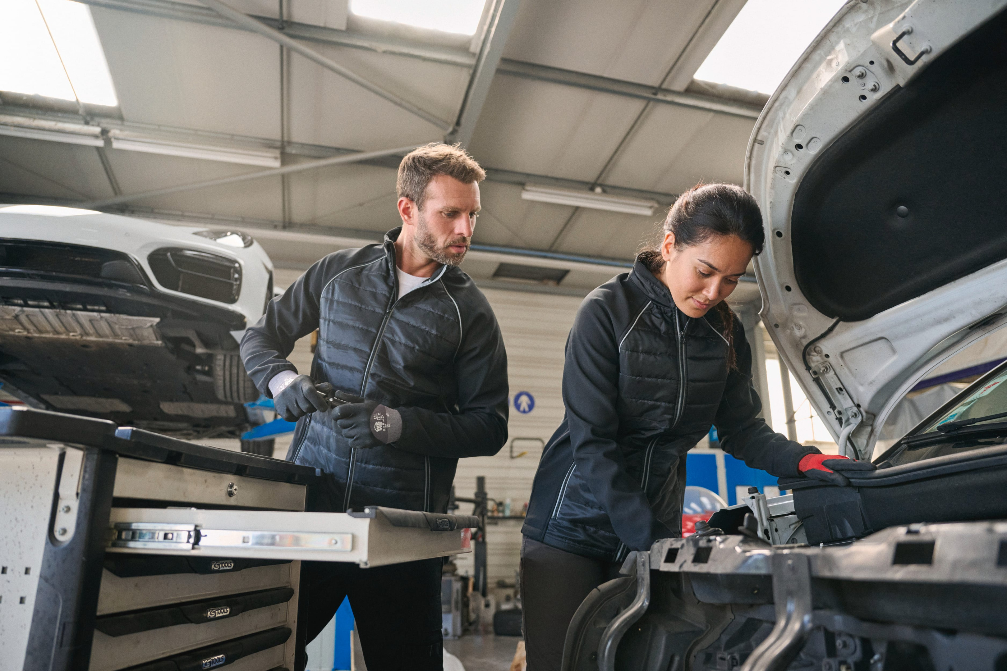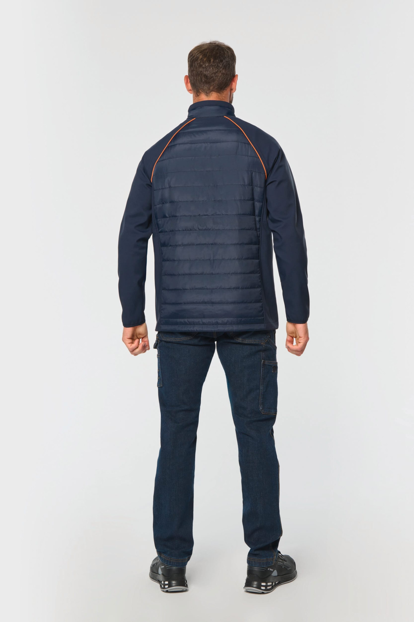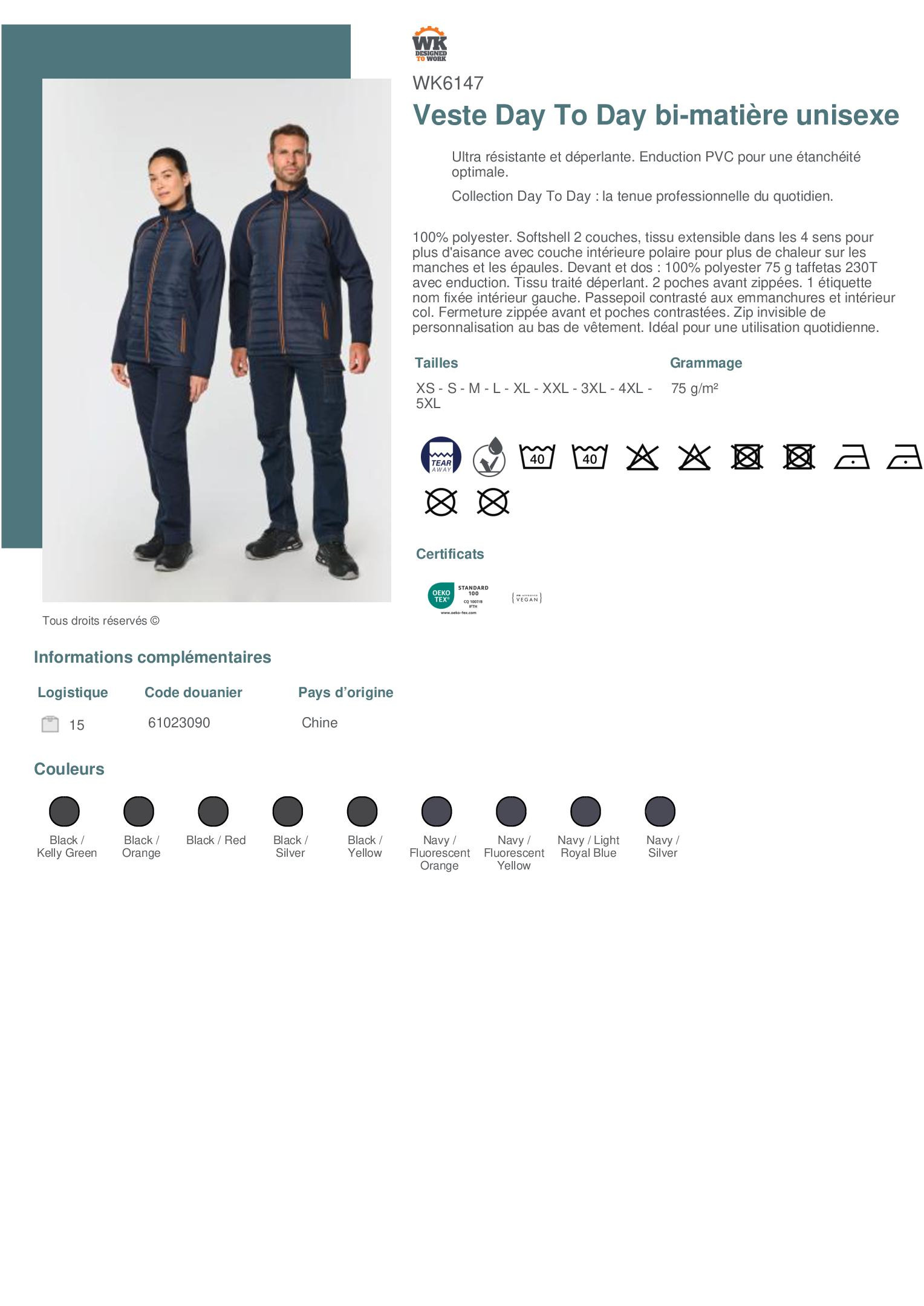 100% polyester. Softshell 2 couches, tissu extensible dans les 4 sens pour plus d'aisance avec couche intérieure polaire pour plus de chaleur sur les manches et les épaules. Devant et dos : 100% polyester 75 g taffetas 230T avec enduction. Tissu traité déperlant. 2 poches avant zippées. 1 étiquette nom fixée intérieur gauche. Passepoil contrasté aux emmanchures et intérieur col. Fermeture zippée avant et poches contrastées. Zip invisible de personnalisation au bas de vêtement. Idéal pour une utilisation quotidienne.