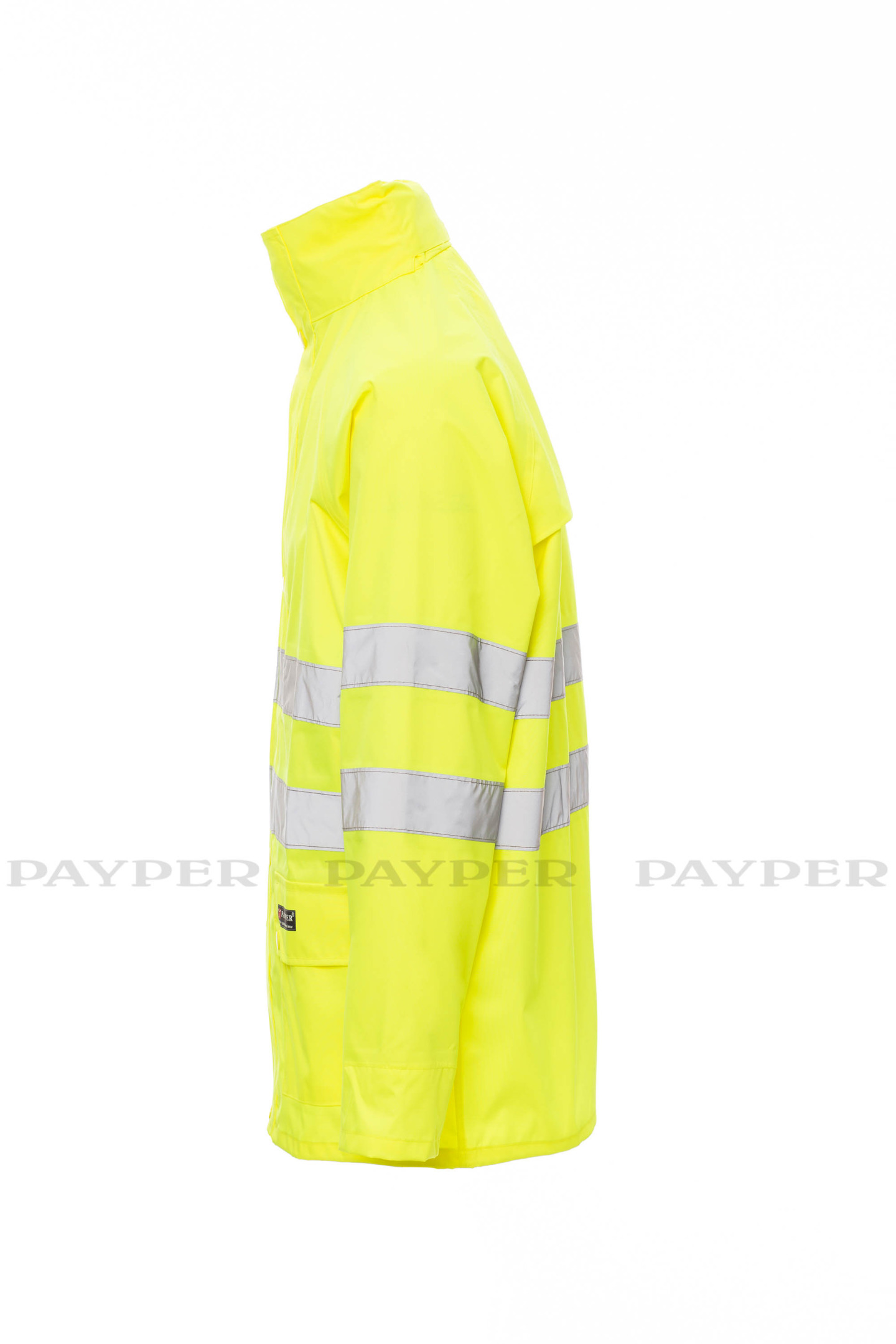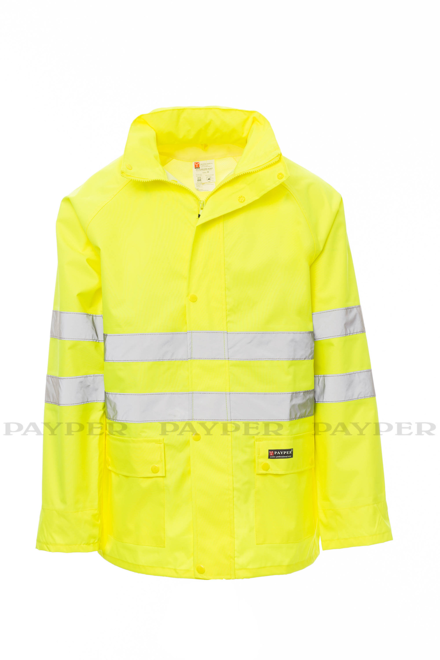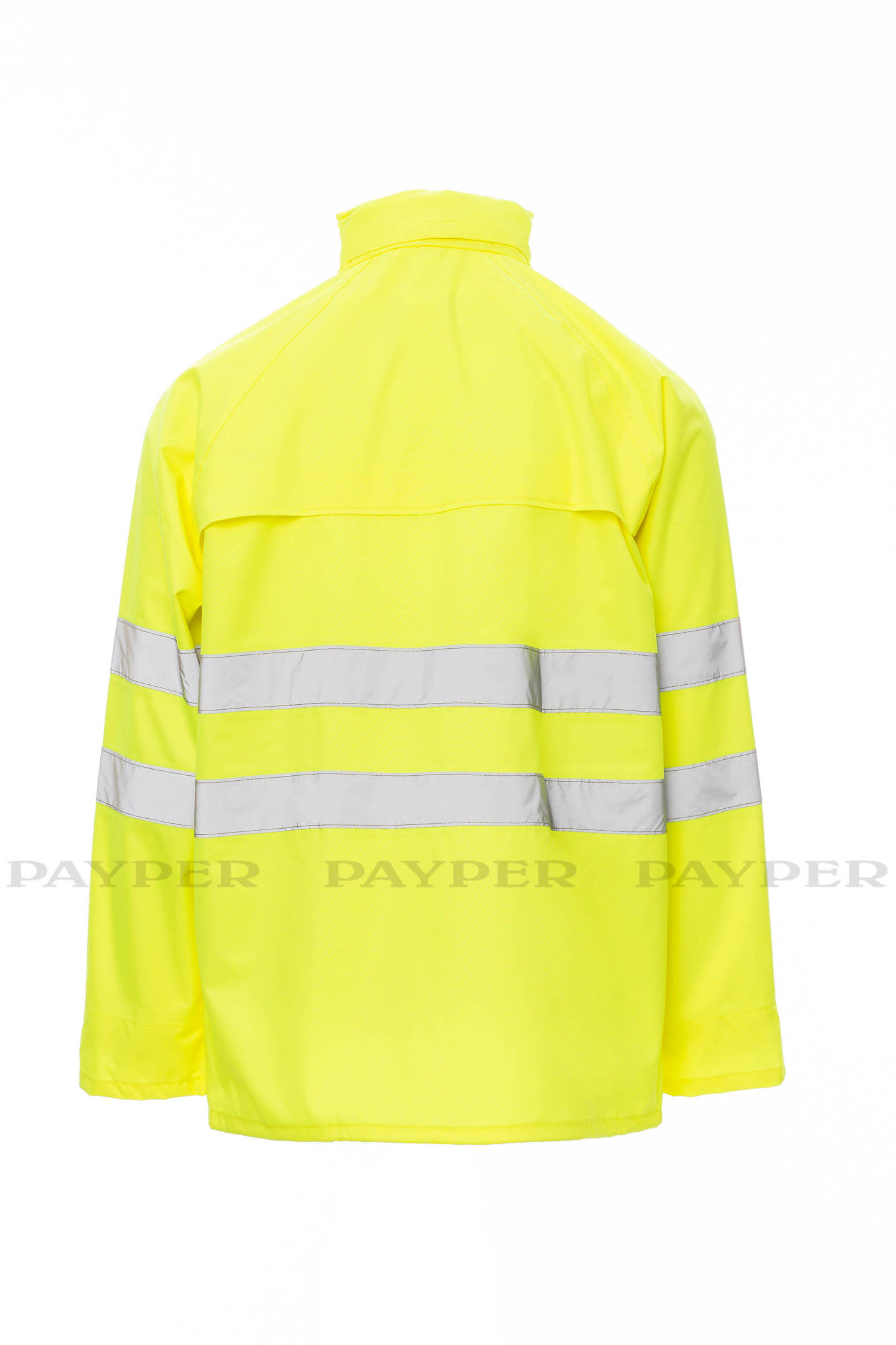 Veste, avec enduit en PU, anti-pluie à haute visibilité avec bandes 3M, manche raglan, zip intégral en nylon et patte à boutons-pression, capuche pliable dans le col, coulisse à la taille, bas des manches droit avec poignet élastique intérieur, deux poches enveloppe avec rabat. Bandes et coutures thermosoudées.